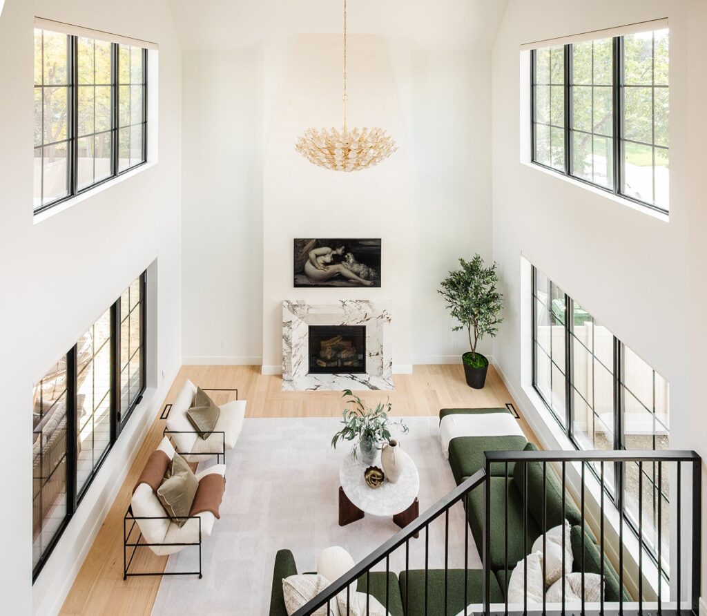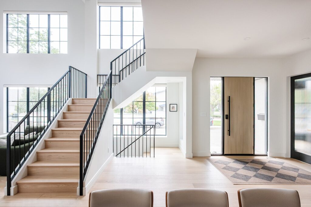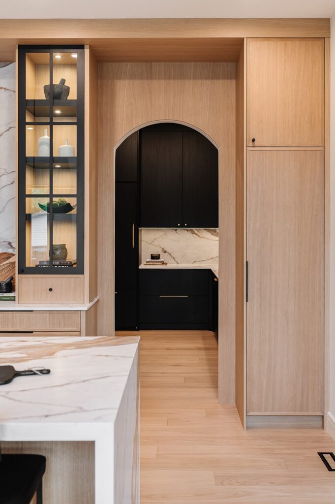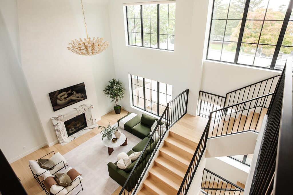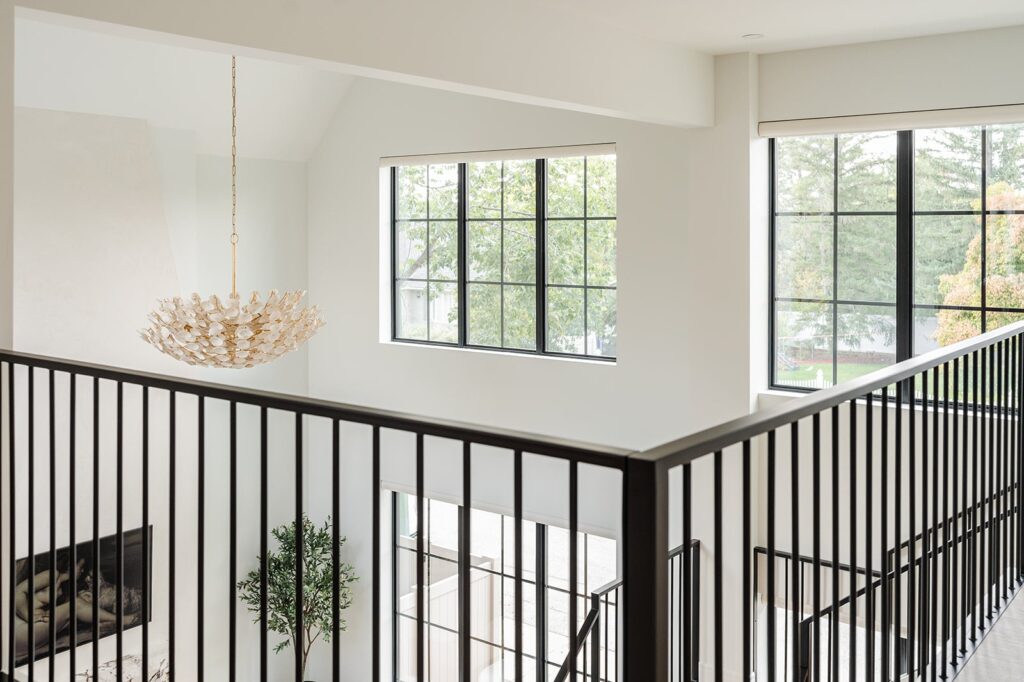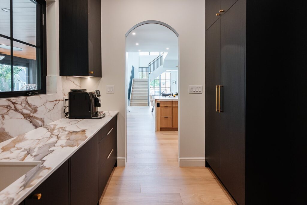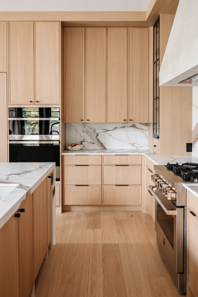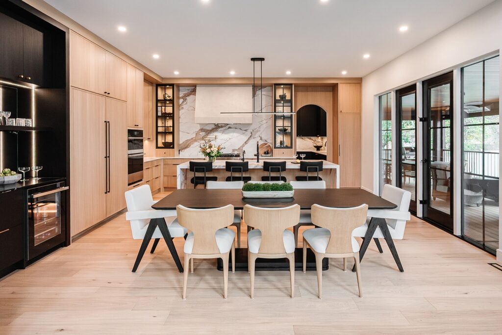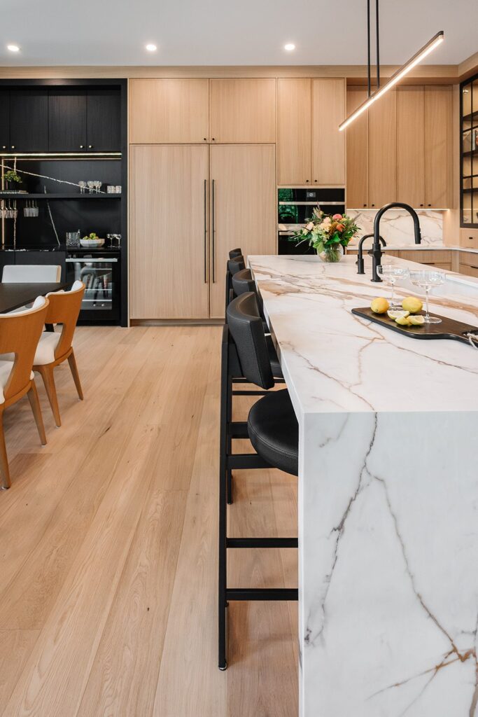 This home blends luxurious modern design with warm organic elements. Light-filled spaces feature white oak cabinetry and wide-plank engineered hardwood that create a soft, natural foundation. The kitchen showcases quartz countertops and full height backsplash that frames a Venetian player range hood, complimented by the modern black oak and sleek custom metal accents. In the living room, a striking porcelain fireplace and soaring ceilings add refined drama. Every detail, from the sculptural metal staircase railing to the hand crafted light fixtures and personalization of each room, reflects elevated craftsmanship and timeless contemporary style.