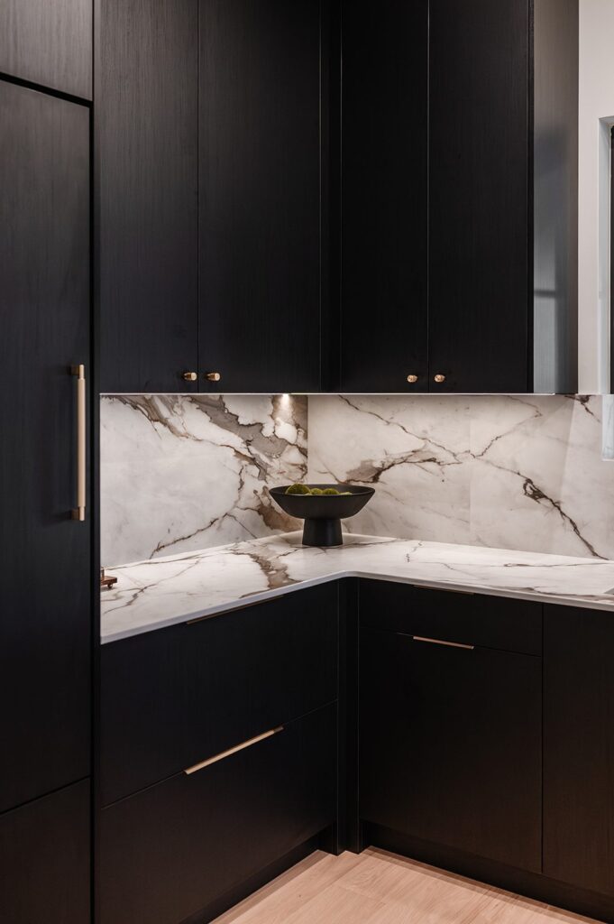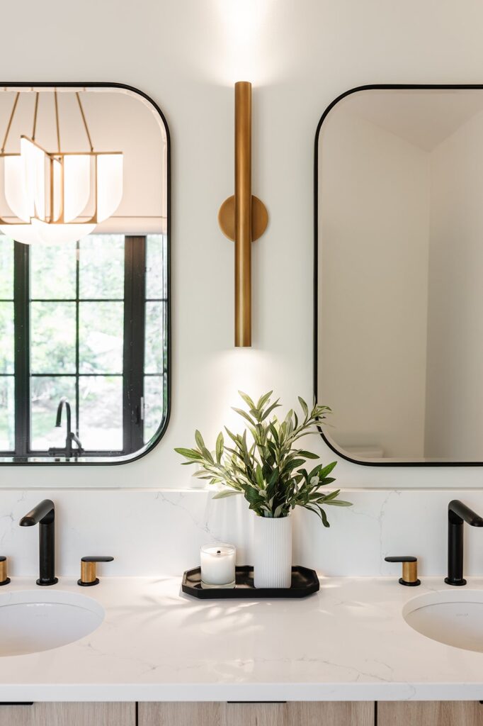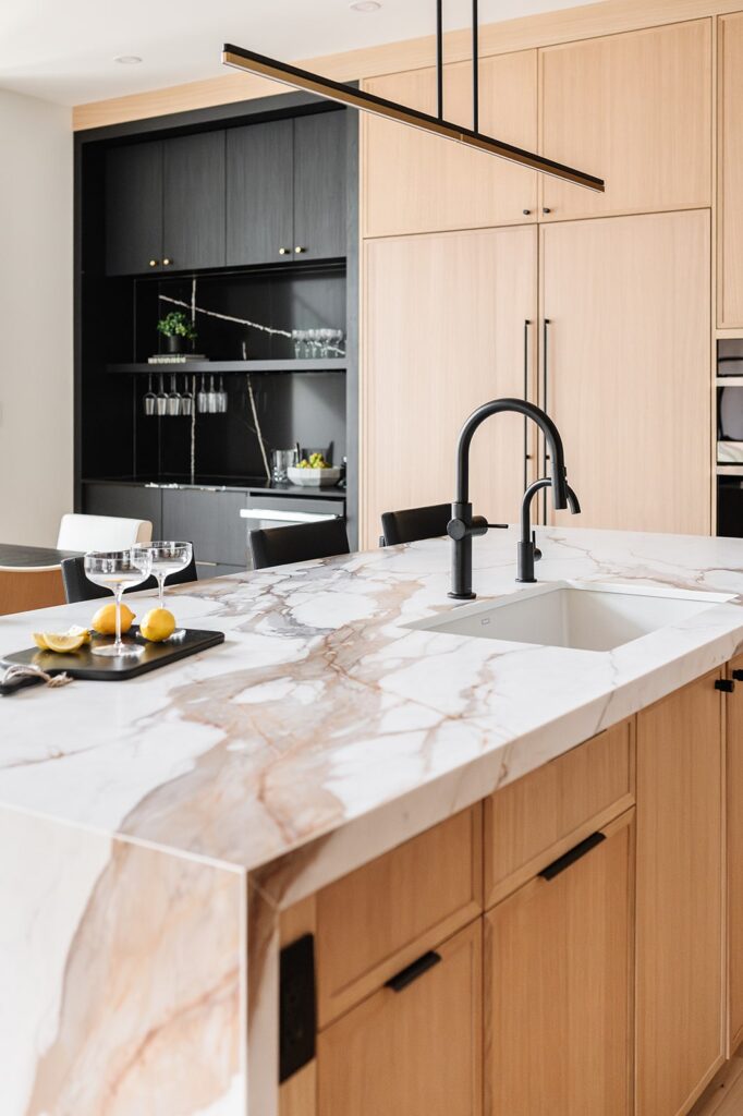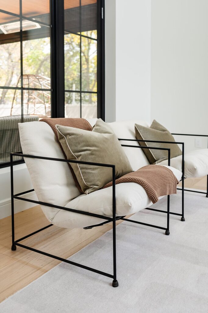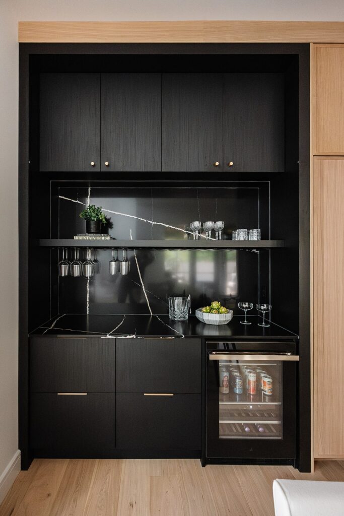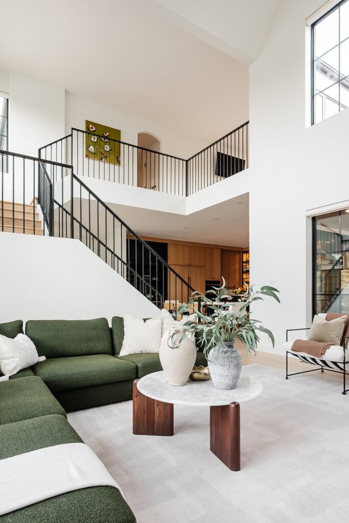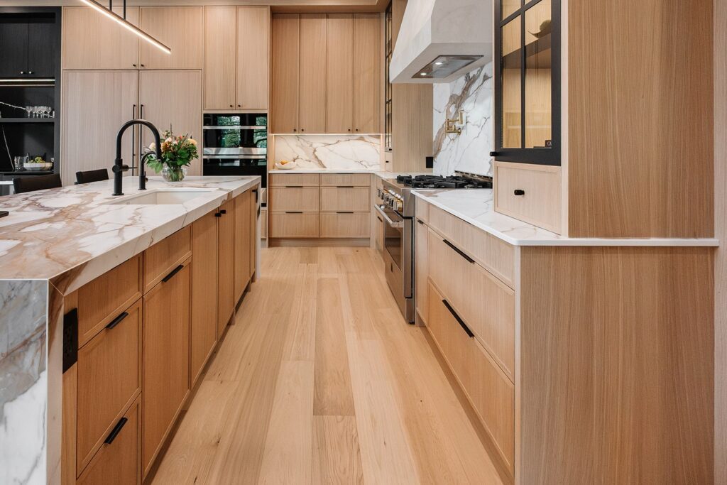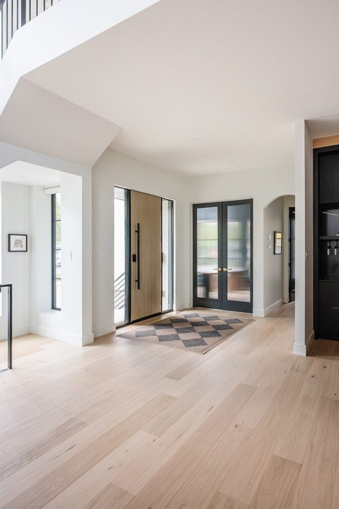 This home blends luxurious modern design with warm organic elements. Light-filled spaces feature white oak cabinetry and wide-plank engineered hardwood that create a soft, natural foundation. The kitchen showcases quartz countertops and full height backsplash that frames a Venetian player range hood, complimented by the modern black oak and sleek custom metal accents. In the living room, a striking porcelain fireplace and soaring ceilings add refined drama. Every detail, from the sculptural metal staircase railing to the hand crafted light fixtures and personalization of each room, reflects elevated craftsmanship and timeless contemporary style.