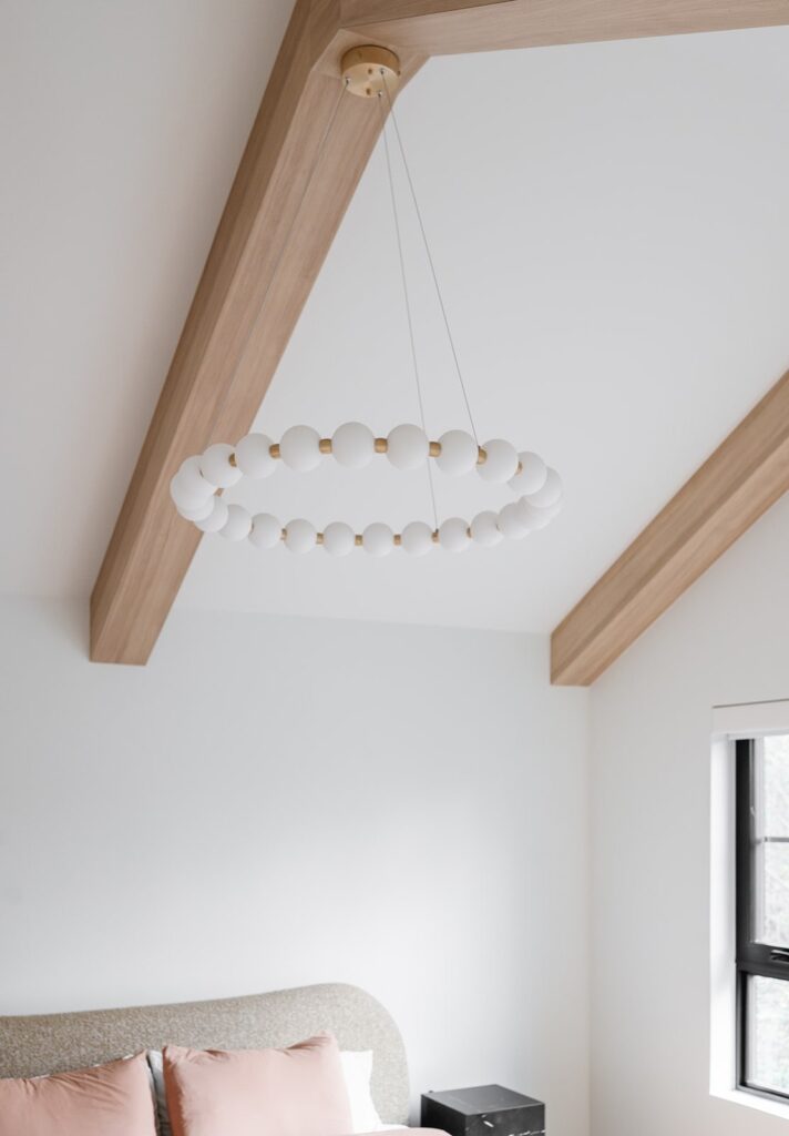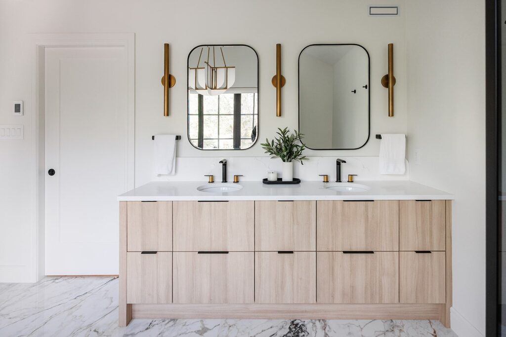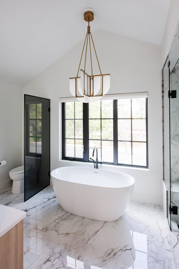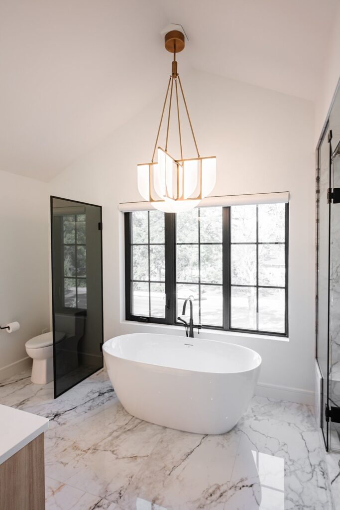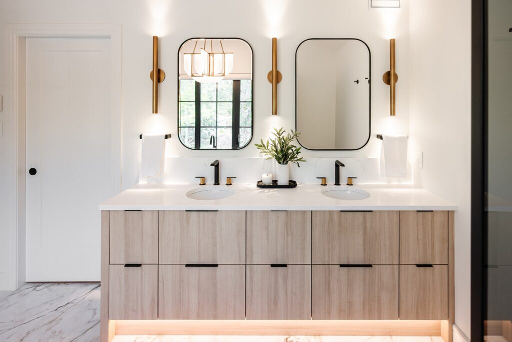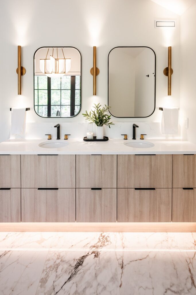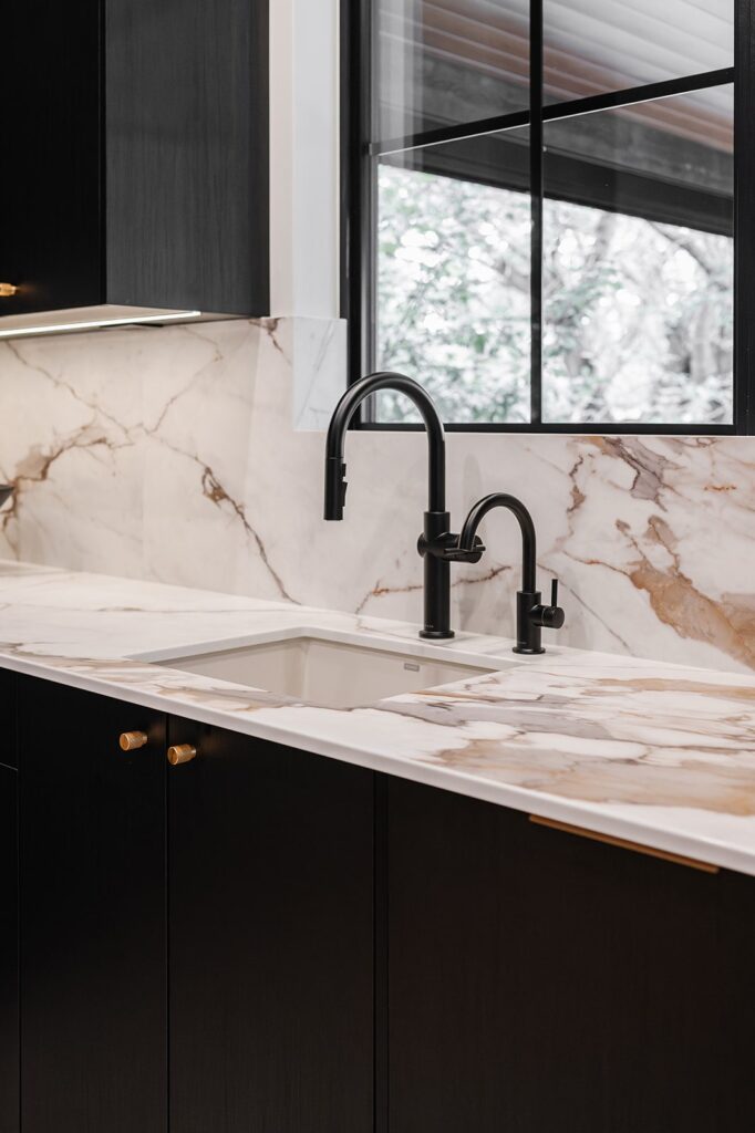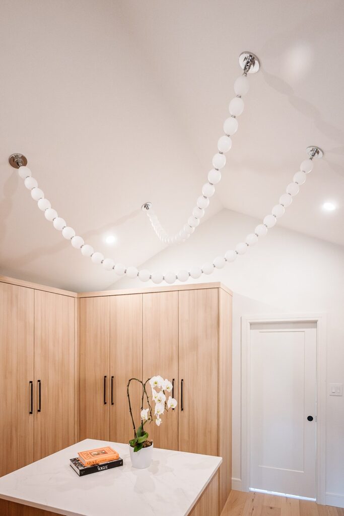 This home blends luxurious modern design with warm organic elements. Light-filled spaces feature white oak cabinetry and wide-plank engineered hardwood that create a soft, natural foundation. The kitchen showcases quartz countertops and full height backsplash that frames a Venetian player range hood, complimented by the modern black oak and sleek custom metal accents. In the living room, a striking porcelain fireplace and soaring ceilings add refined drama. Every detail, from the sculptural metal staircase railing to the hand crafted light fixtures and personalization of each room, reflects elevated craftsmanship and timeless contemporary style.