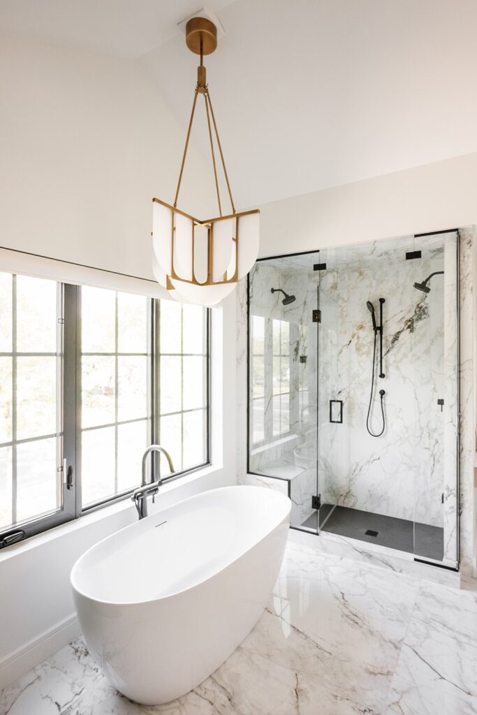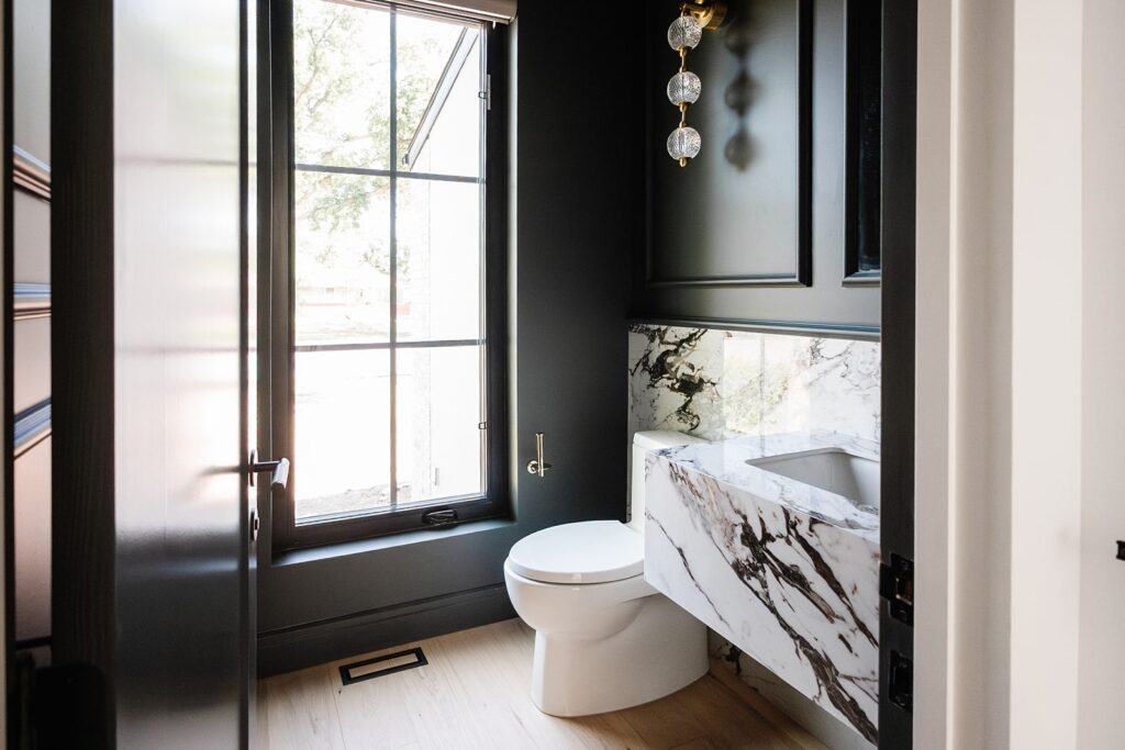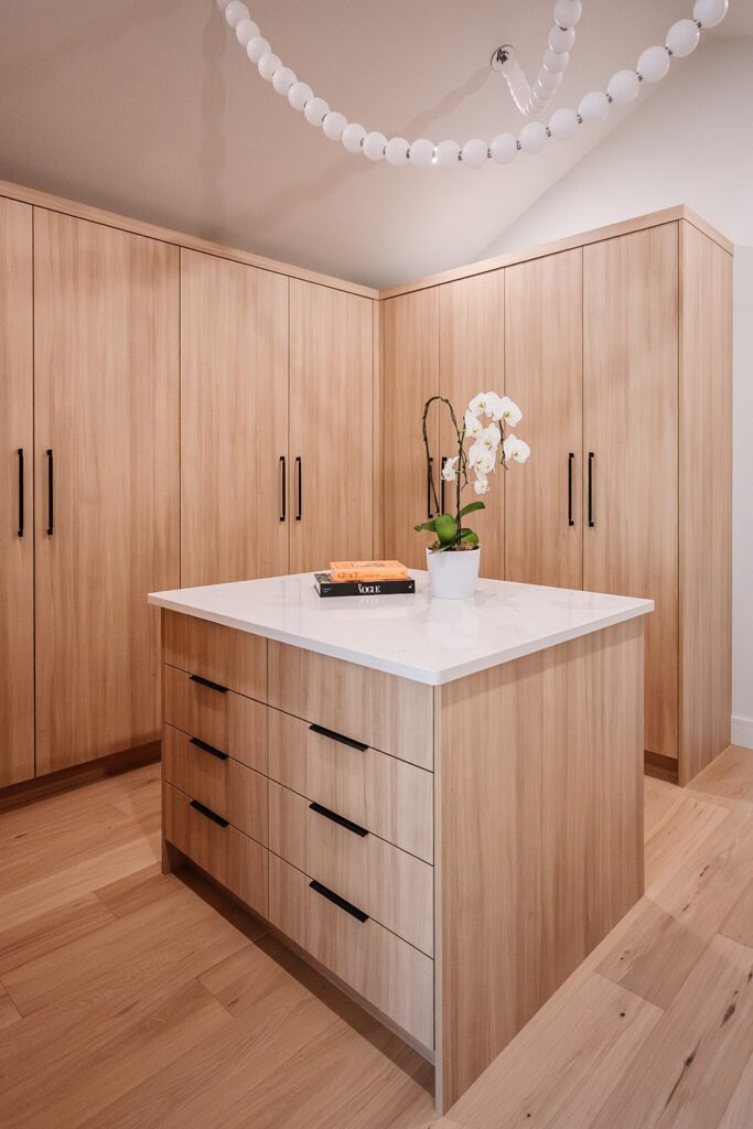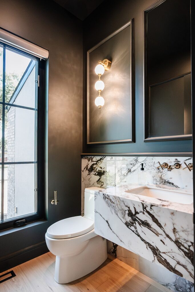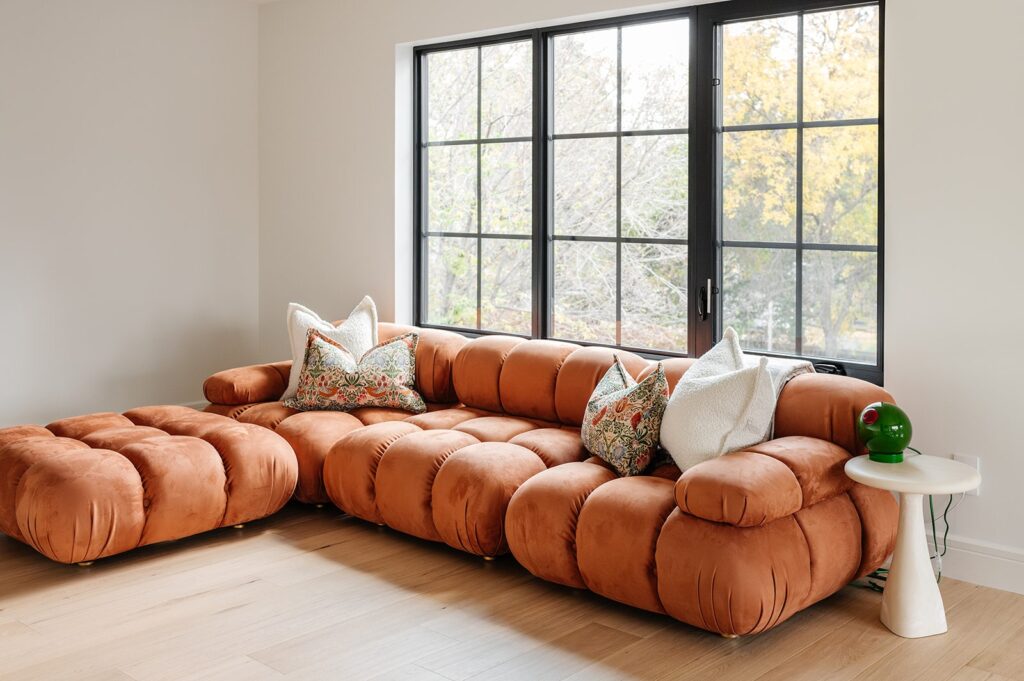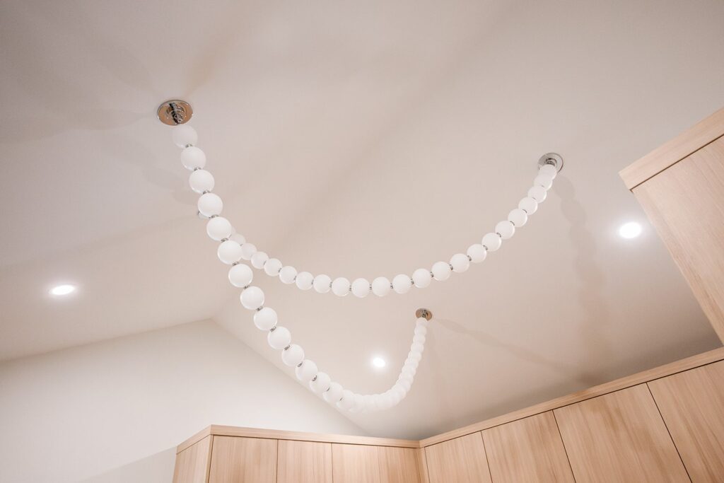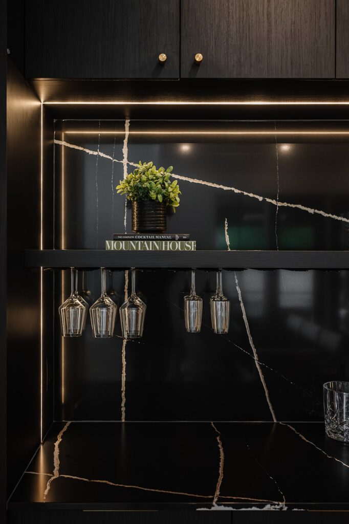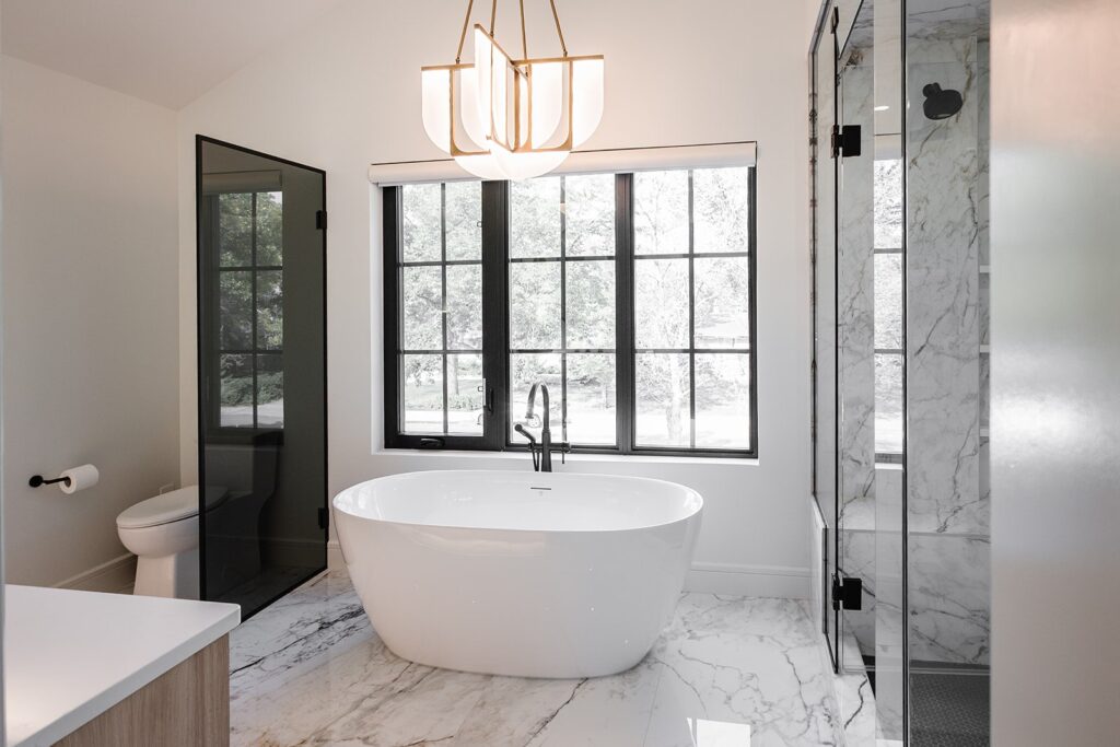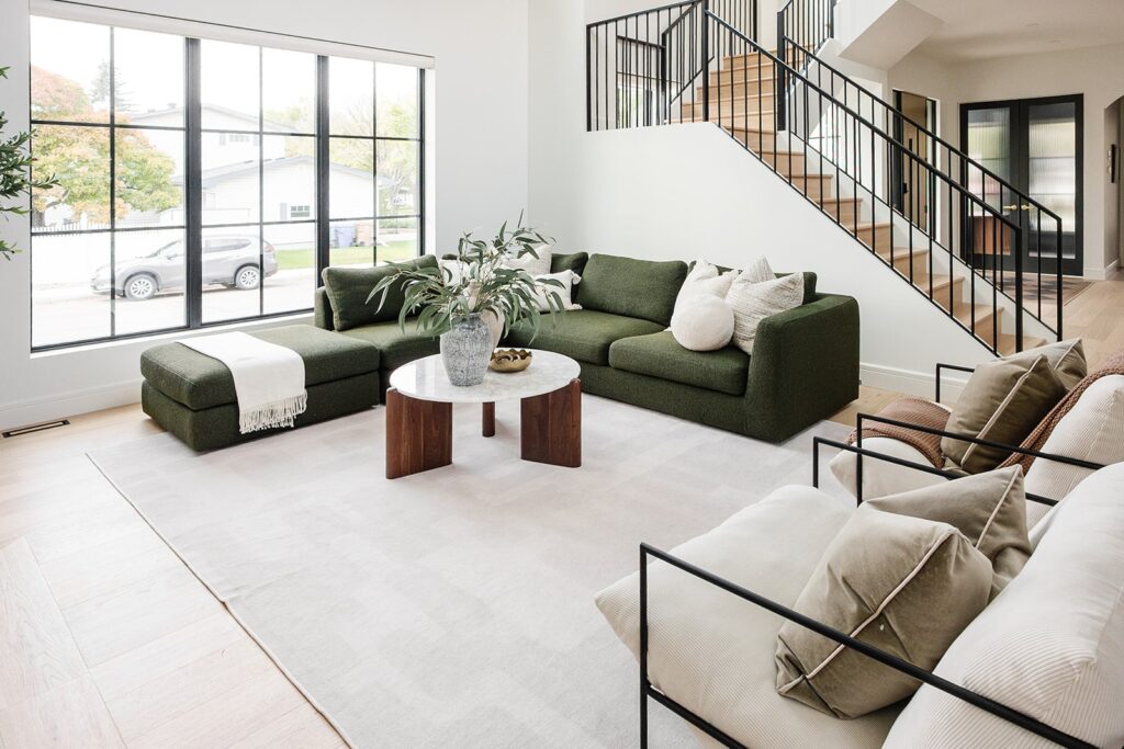 This home blends luxurious modern design with warm organic elements. Light-filled spaces feature white oak cabinetry and wide-plank engineered hardwood that create a soft, natural foundation. The kitchen showcases quartz countertops and full height backsplash that frames a Venetian player range hood, complimented by the modern black oak and sleek custom metal accents. In the living room, a striking porcelain fireplace and soaring ceilings add refined drama. Every detail, from the sculptural metal staircase railing to the hand crafted light fixtures and personalization of each room, reflects elevated craftsmanship and timeless contemporary style.