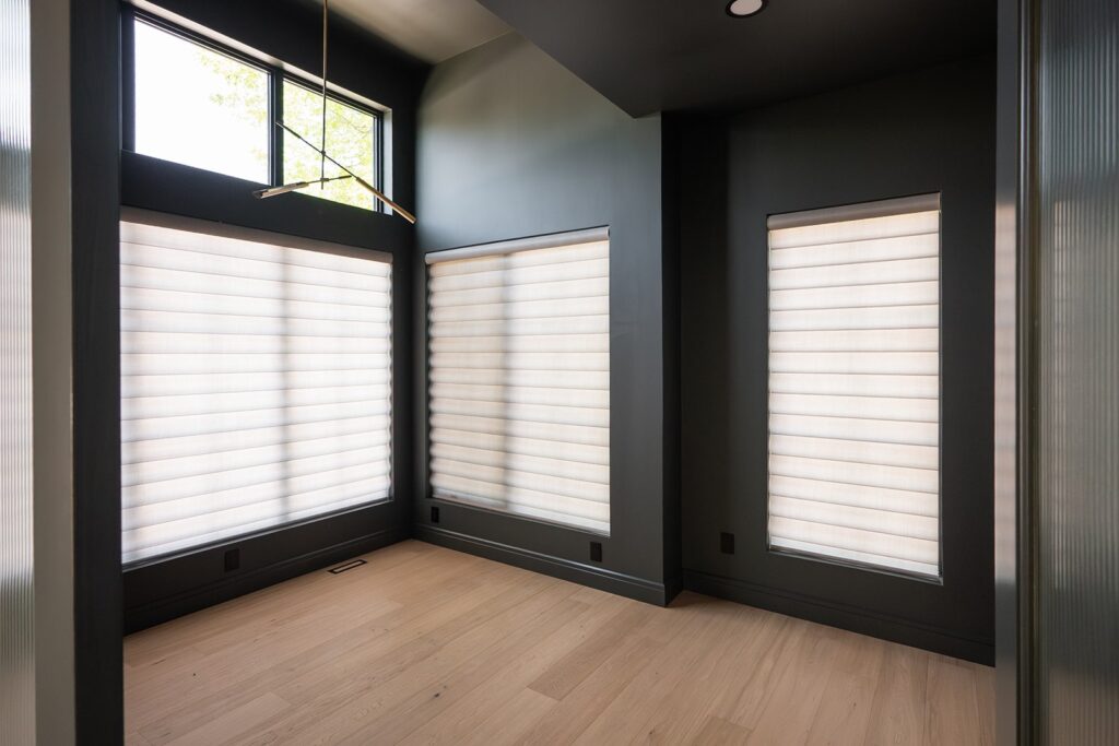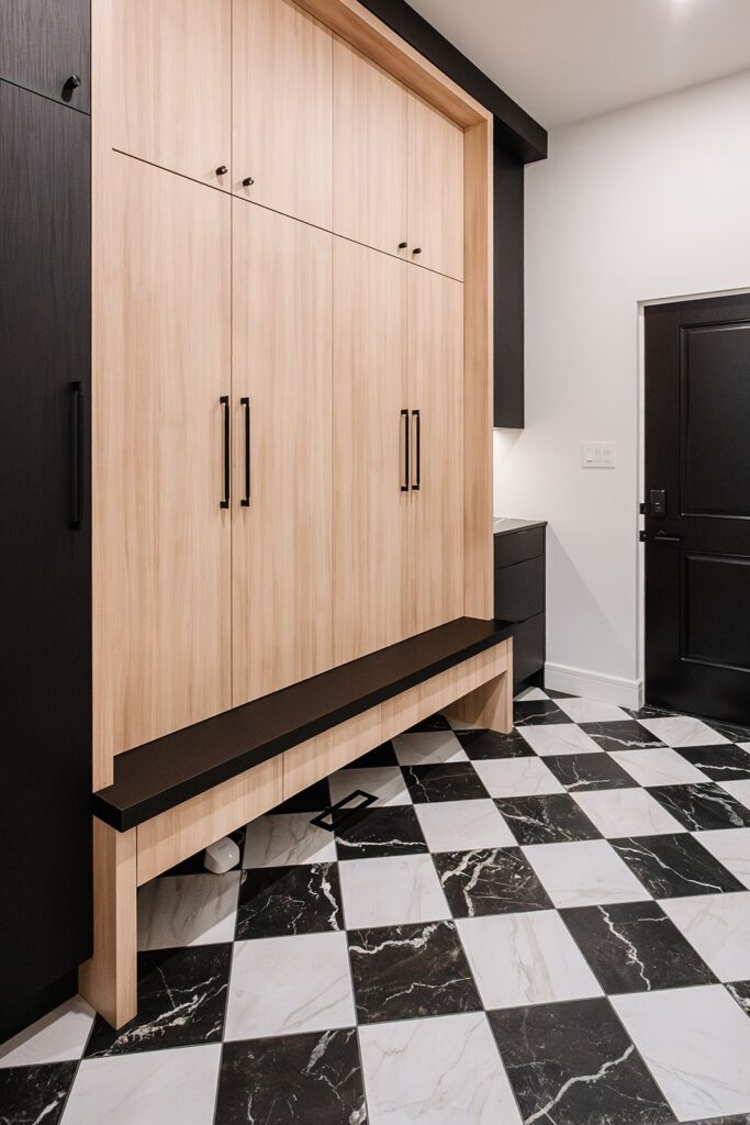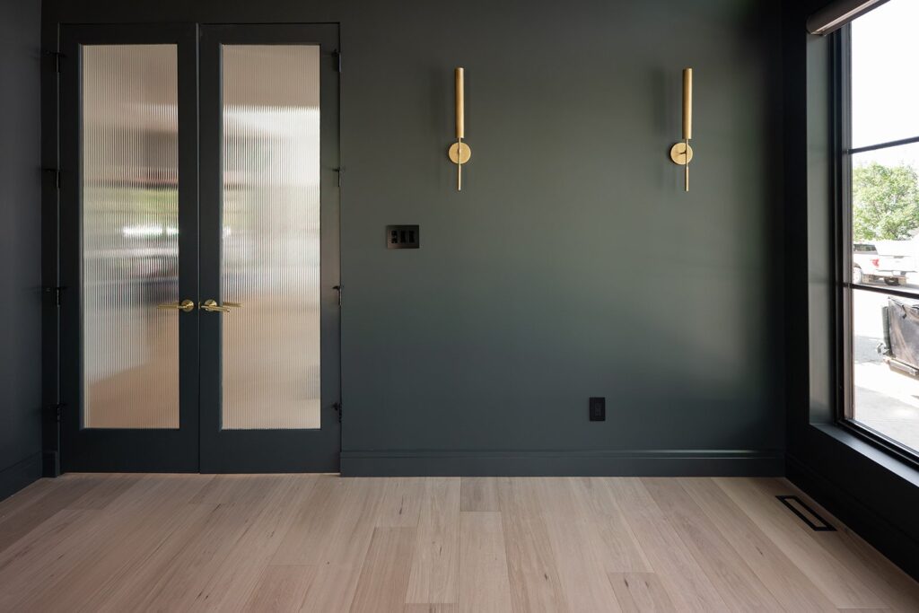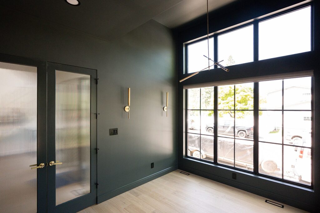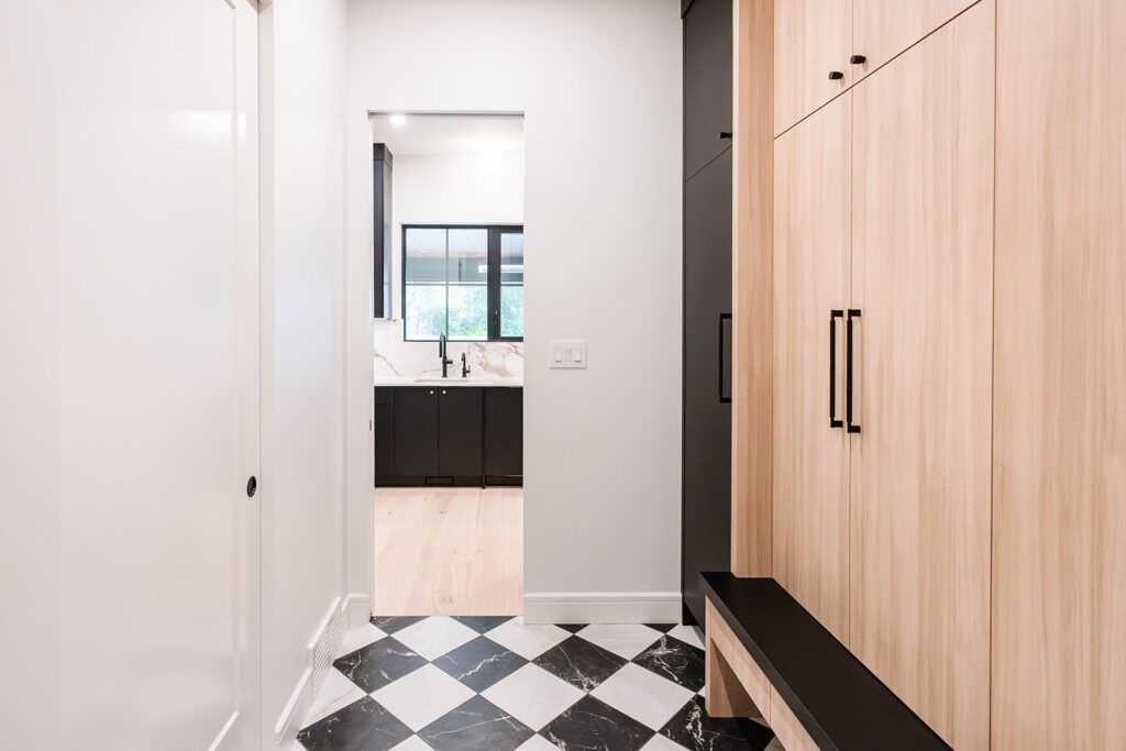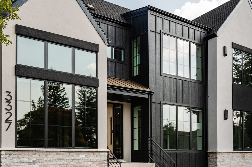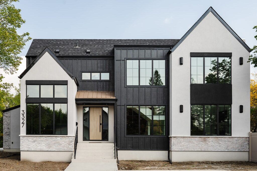 The exterior showcases a striking modern organic aesthetic with bold contrasts and refined textures. Black LP siding anchors the home with clean, contemporary lines, while cream stucco softens the façade and adds warmth. White-washed brick accents introduce subtle depth and a timeless, coastal-inspired touch. A large wood-look front door becomes the focal point, offering natural richness against the dark siding and topped by a sleek metal roof detail that enhances architectural interest. Large windows and streamlined forms complete the look, creating an exterior that feels both grounded and elevated.