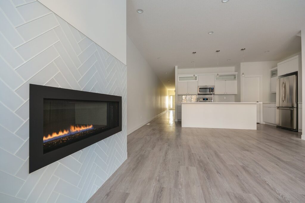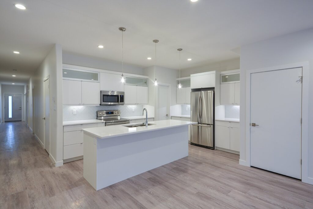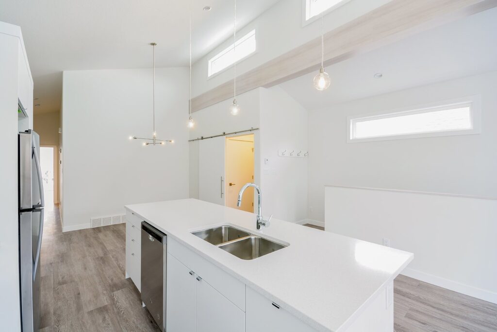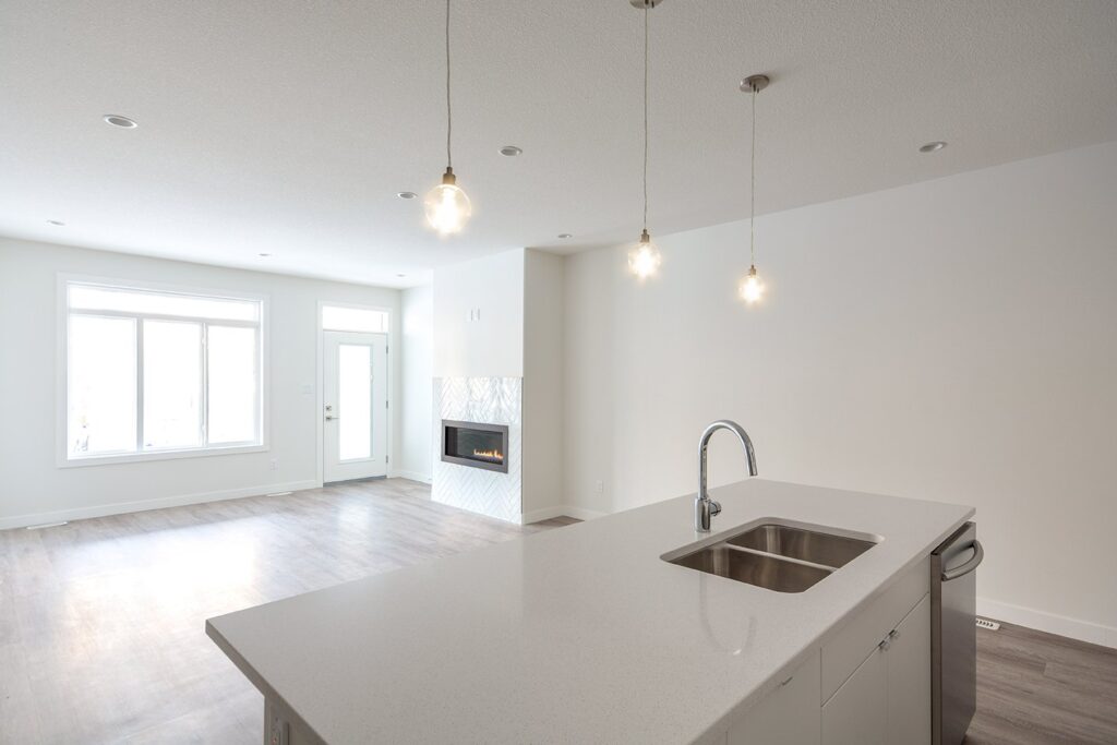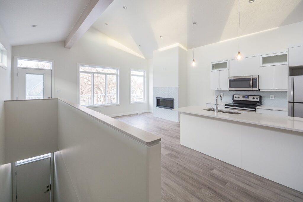 This custom home features a bright and open concept living area, kitchen, and high ceilings.