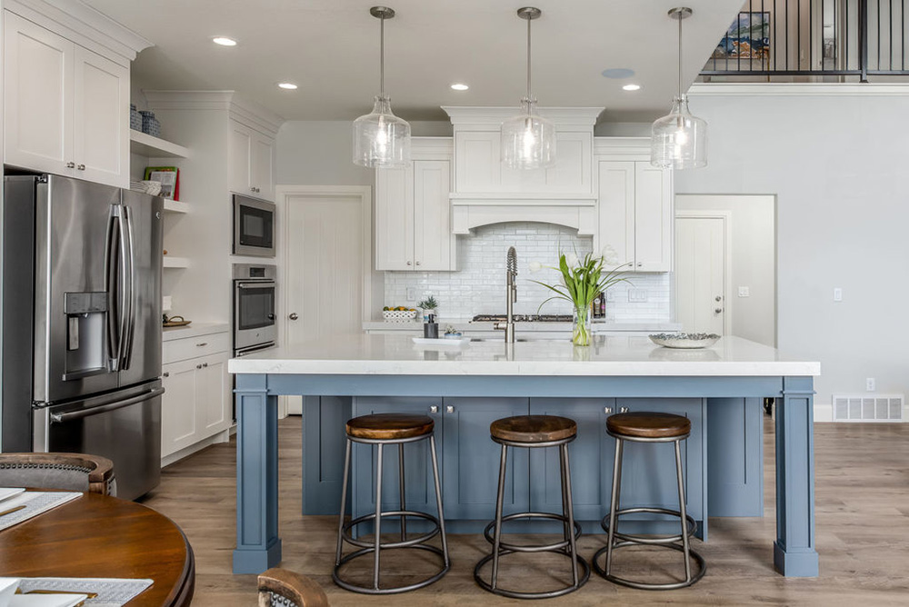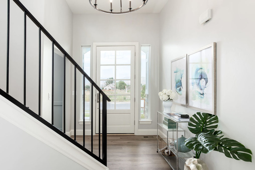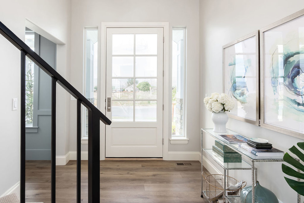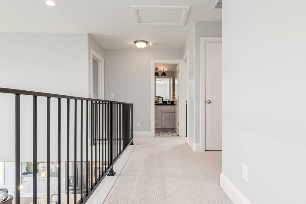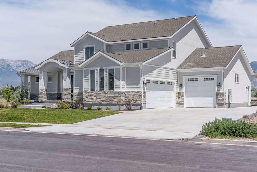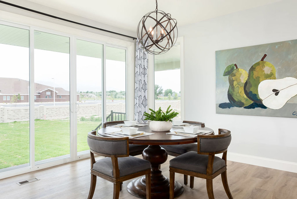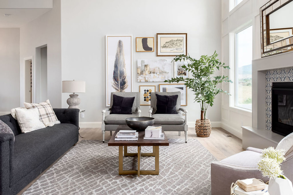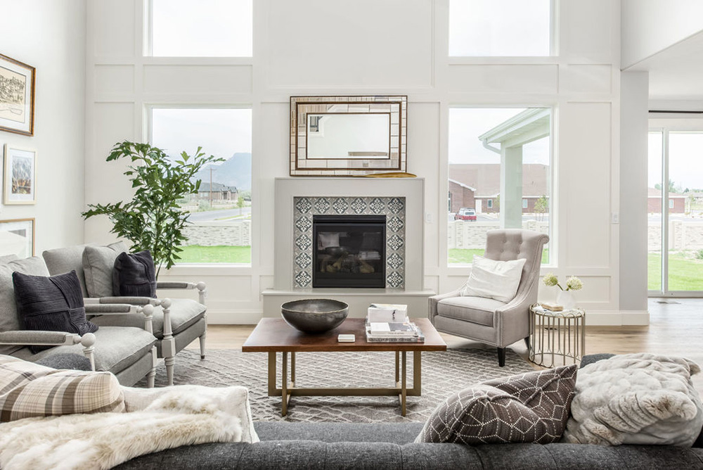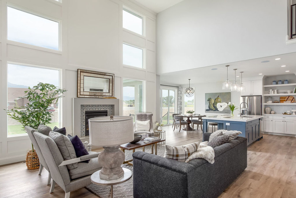 This custom home features an open concept great room with a soft color palette, hardwood floors, large windows, and high end finishes. The large windows bring in lots of natural light, giving the space a bright, open atmosphere.