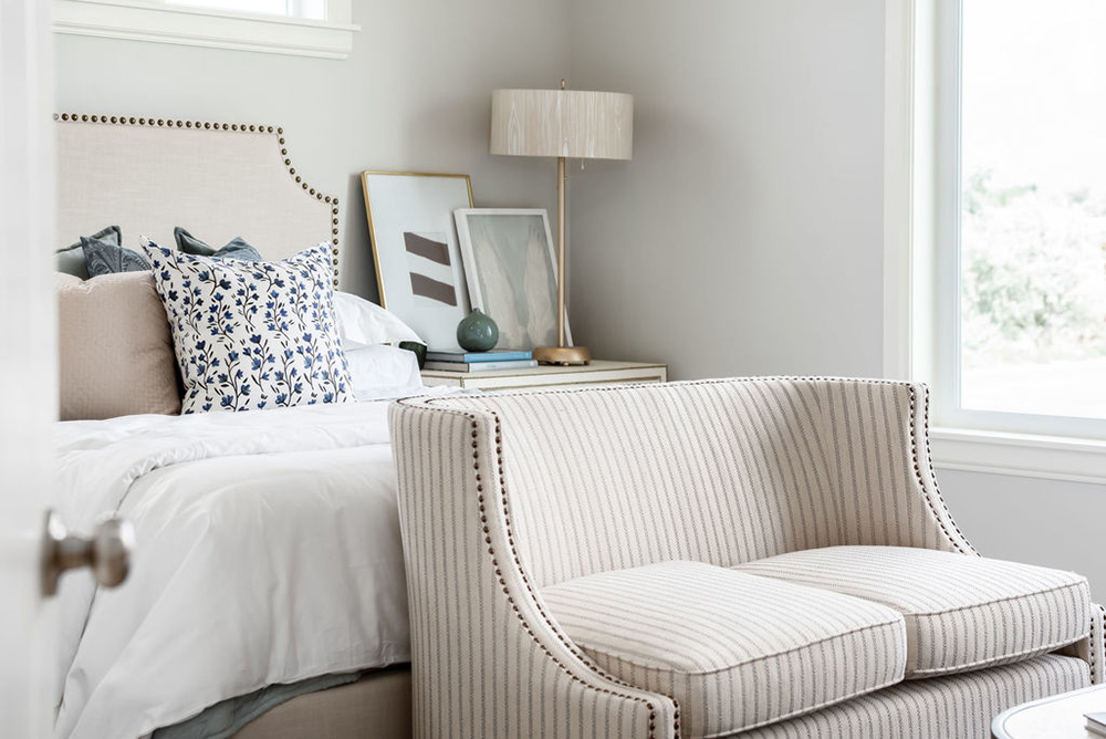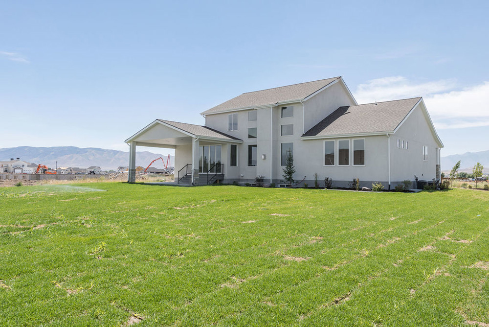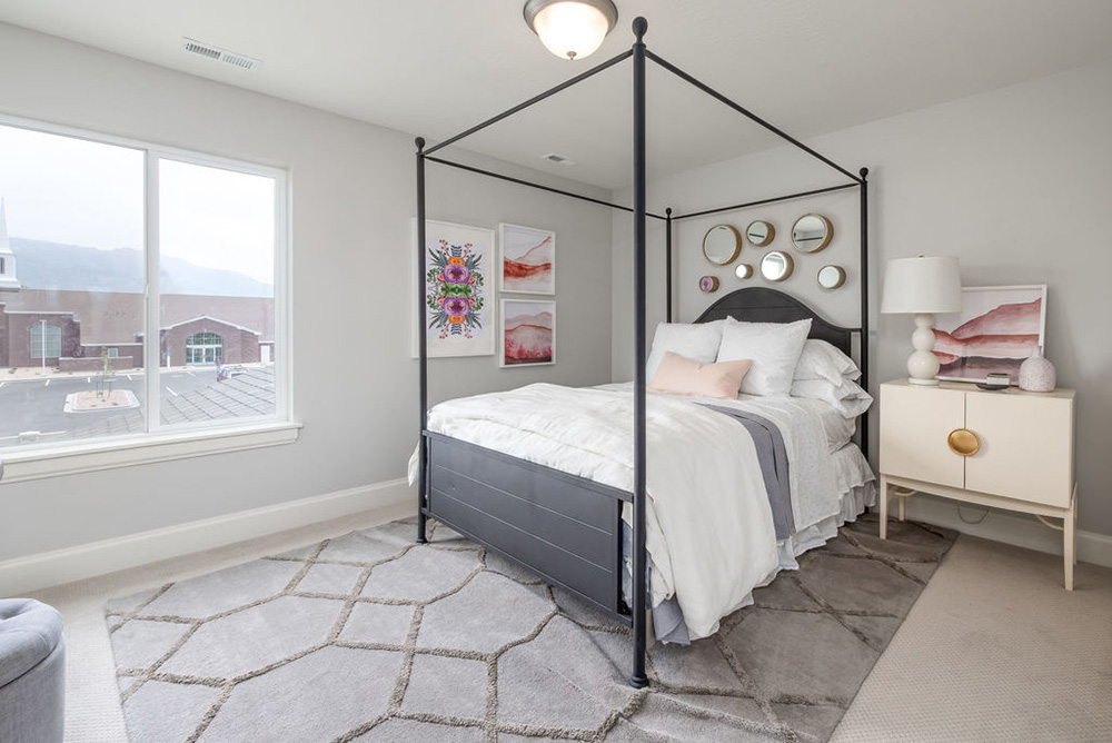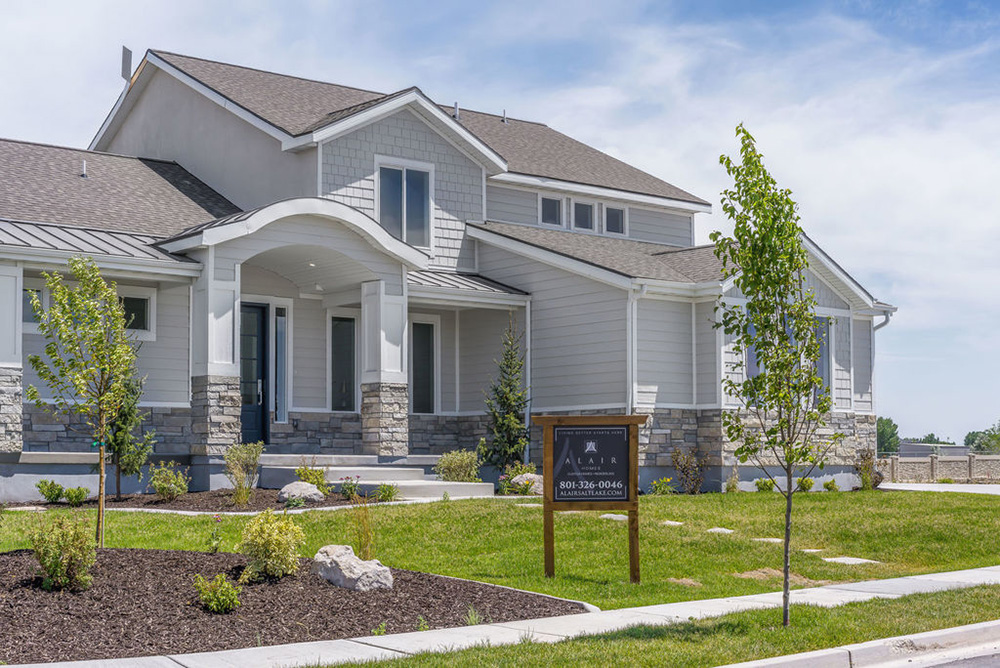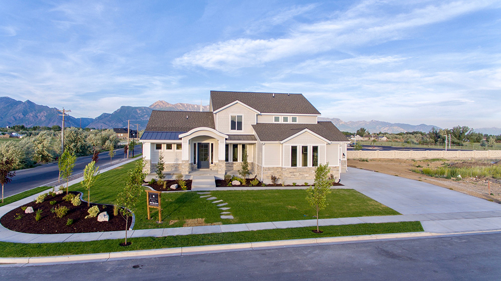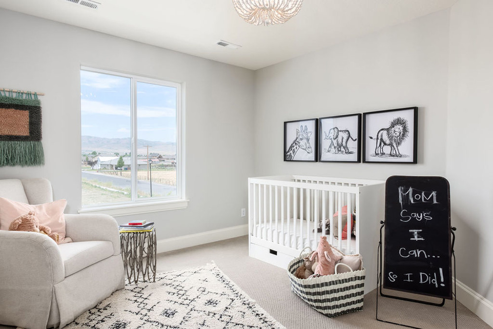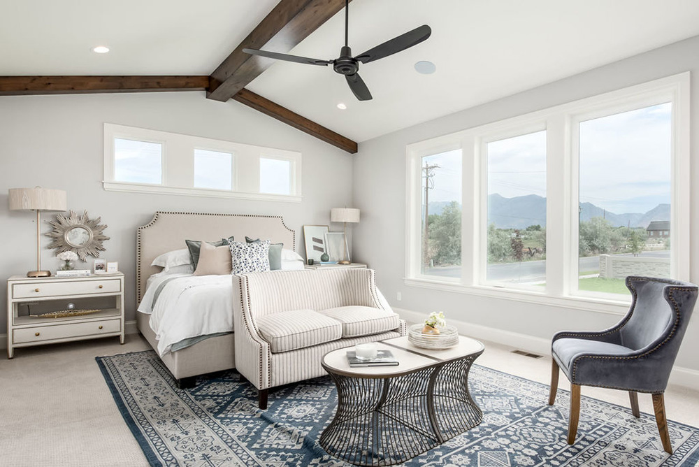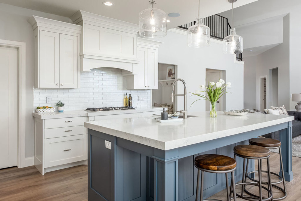 This custom home features an open concept great room with a soft color palette, hardwood floors, large windows, and high end finishes. The large windows bring in lots of natural light, giving the space a bright, open atmosphere.