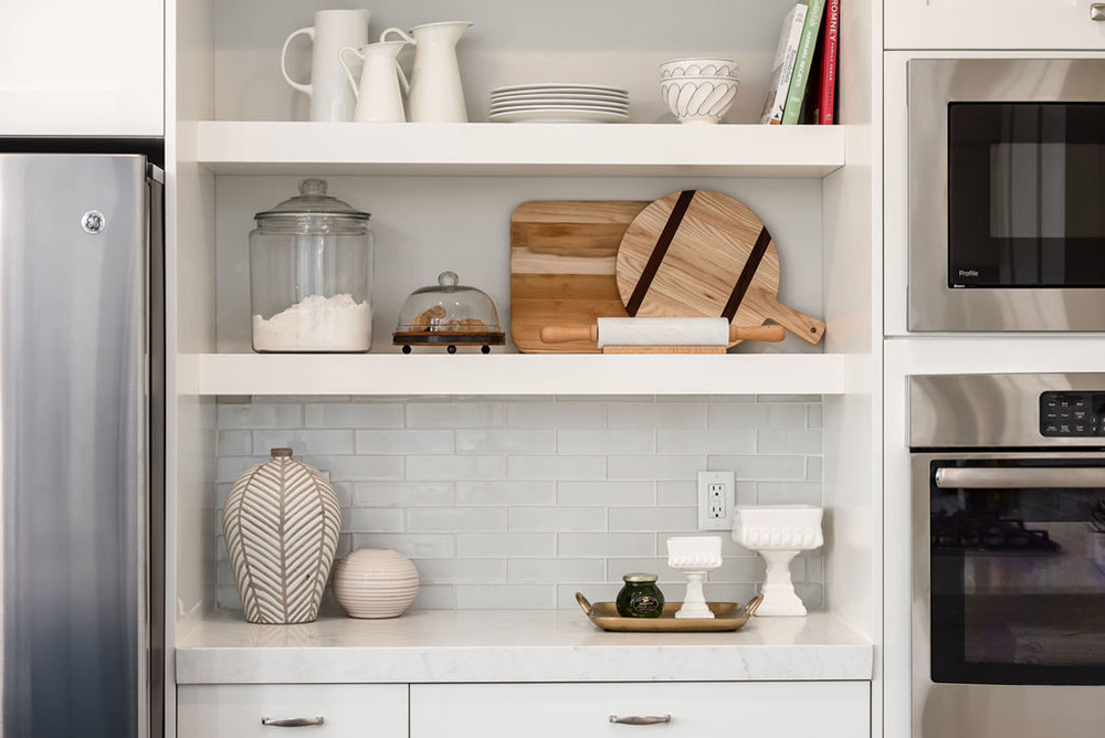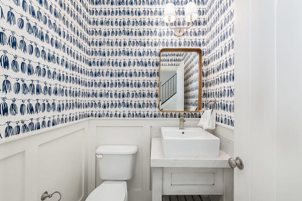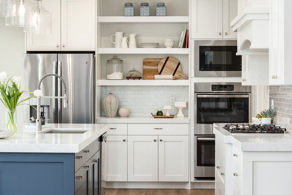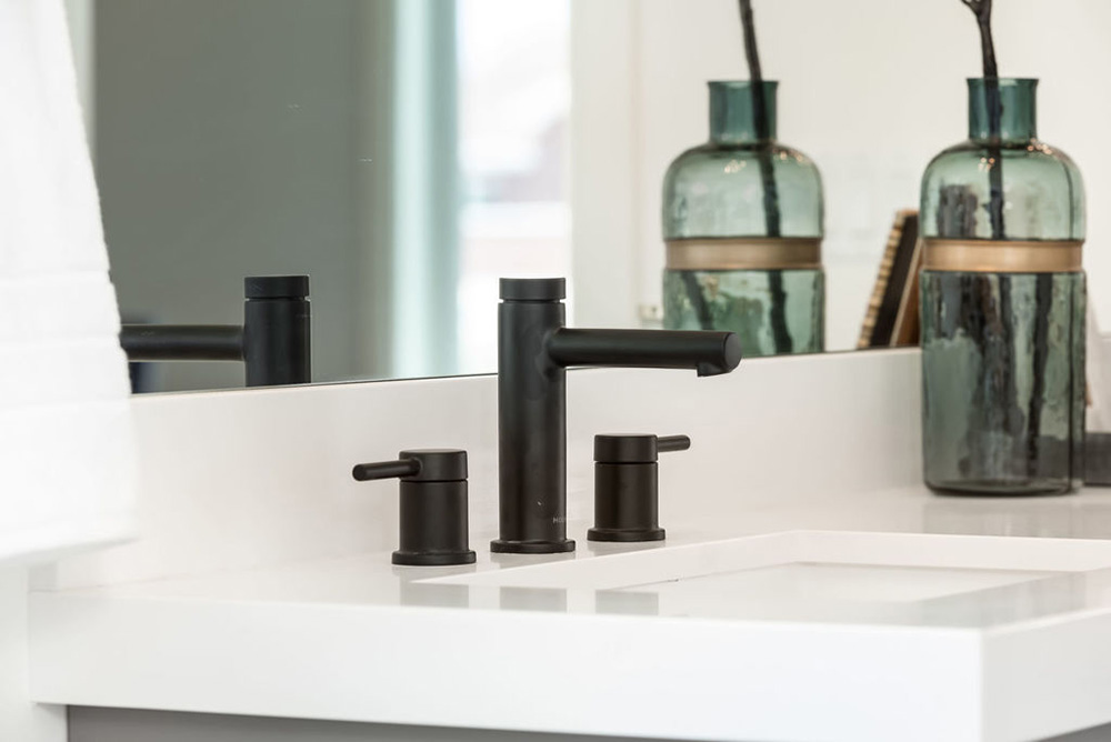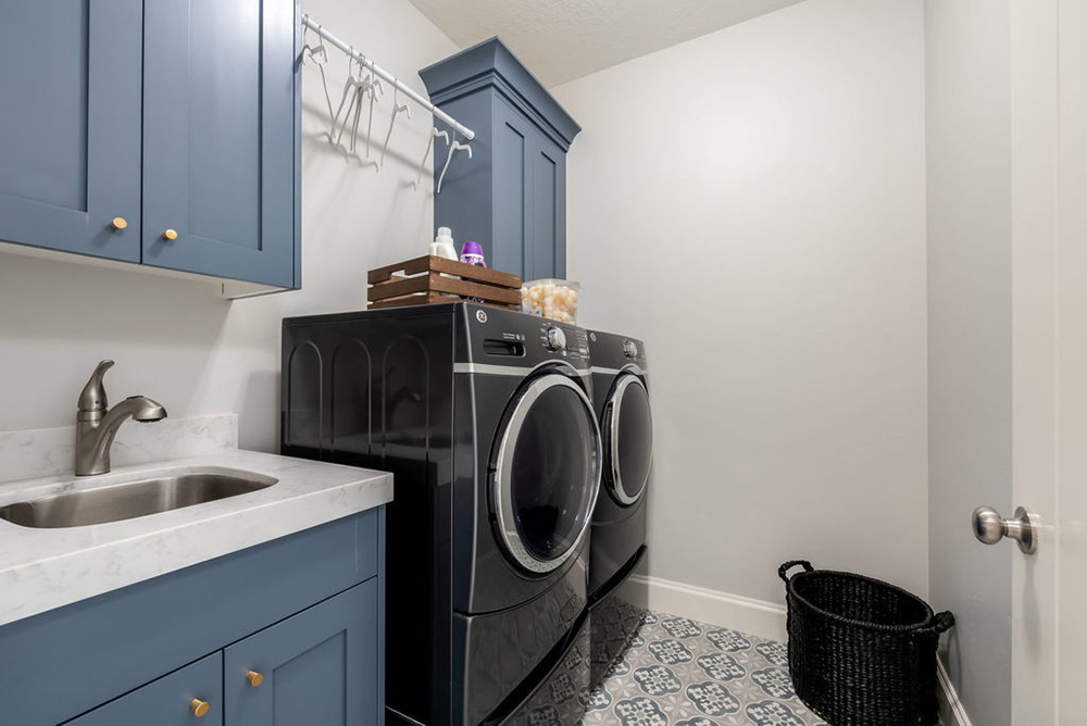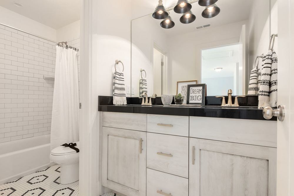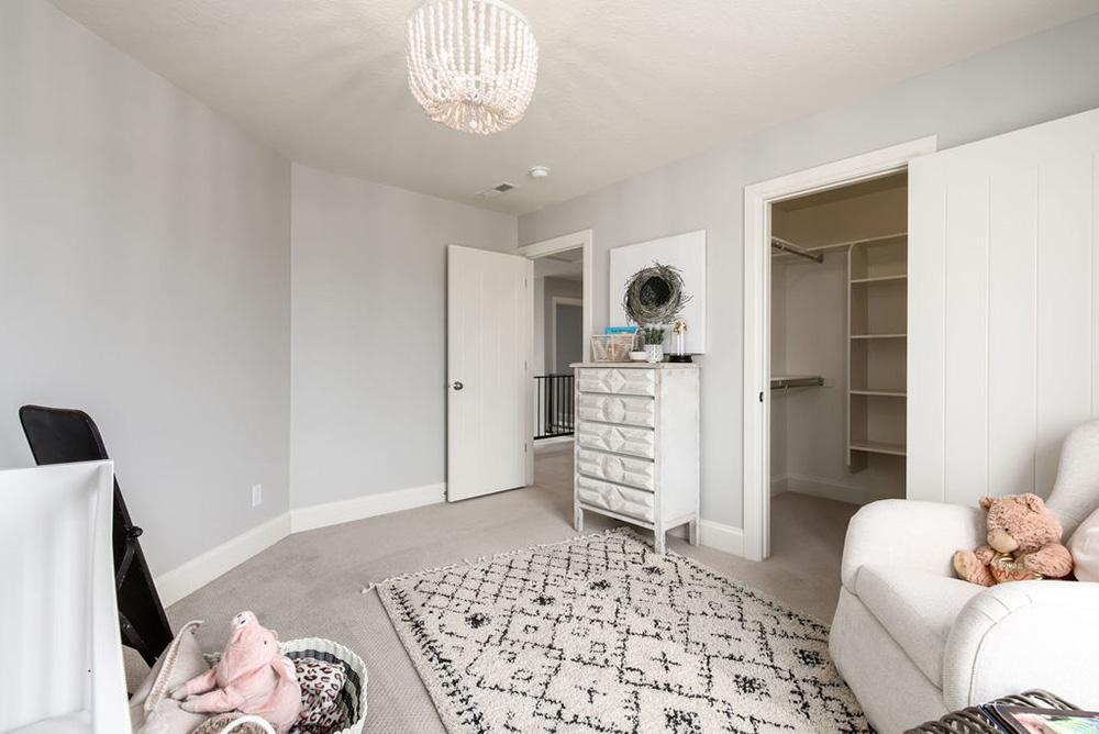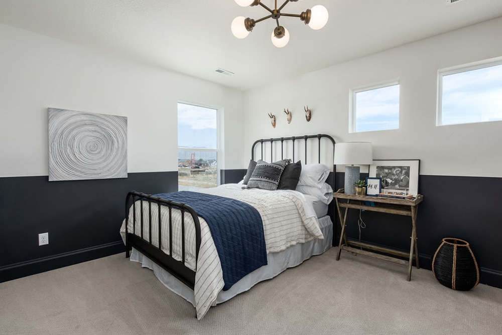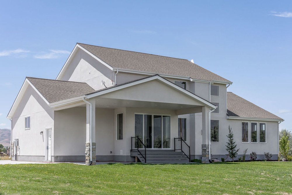 This custom home features an open concept great room with a soft color palette, hardwood floors, large windows, and high end finishes. The large windows bring in lots of natural light, giving the space a bright, open atmosphere.