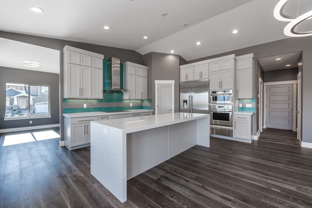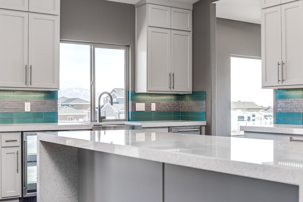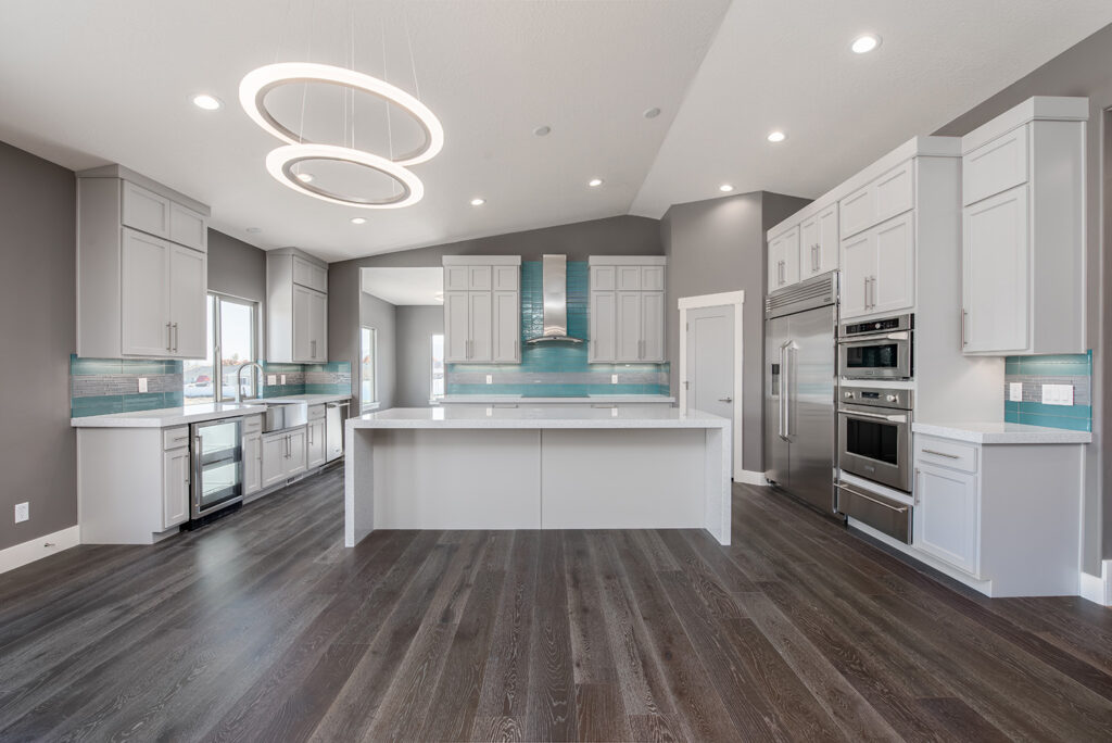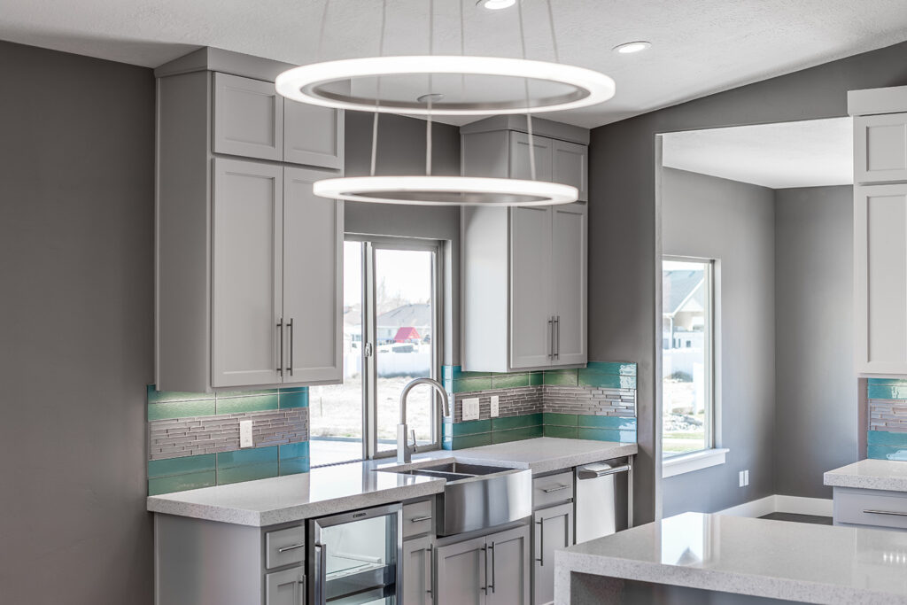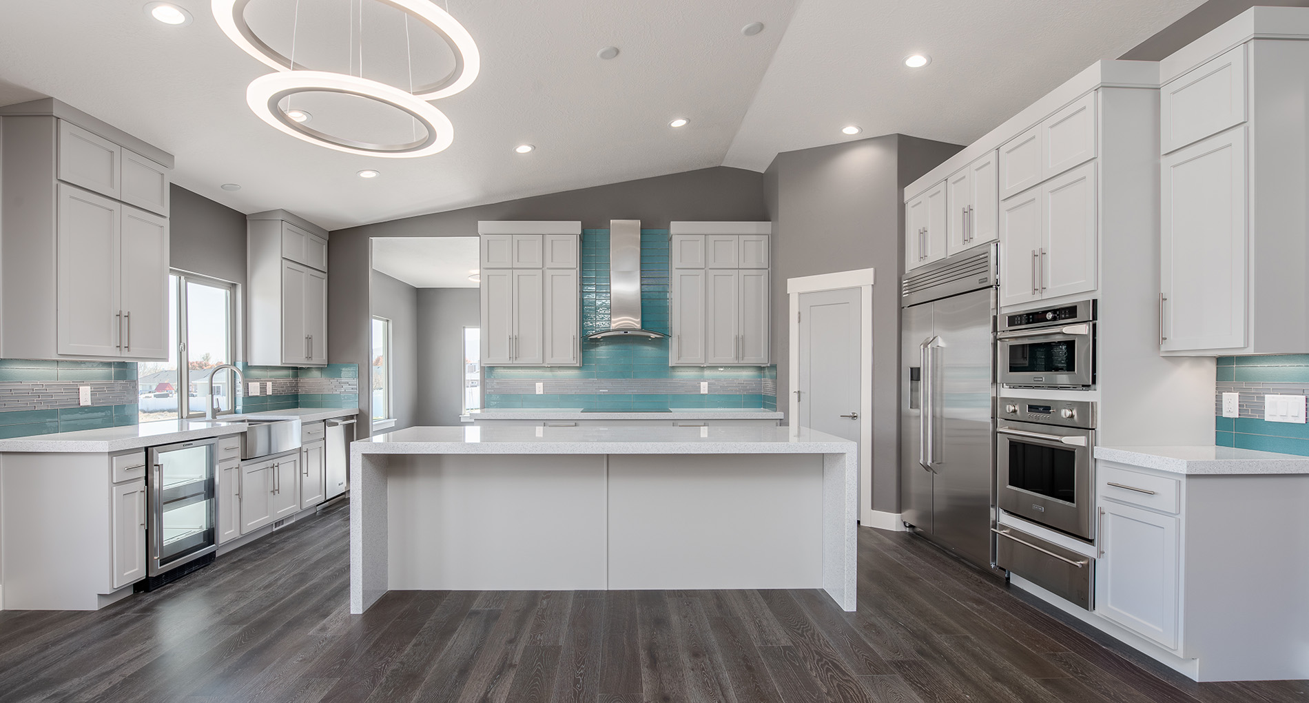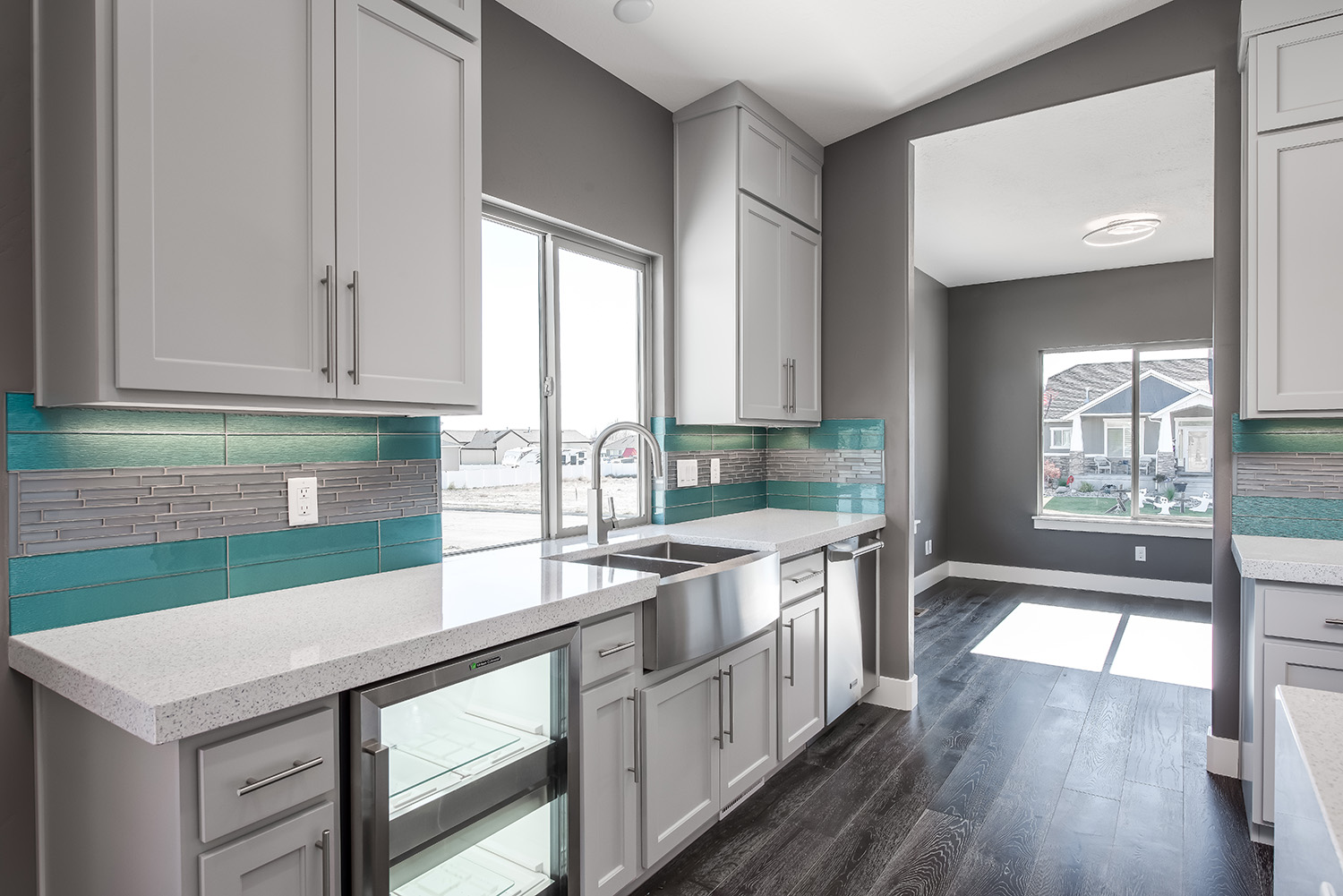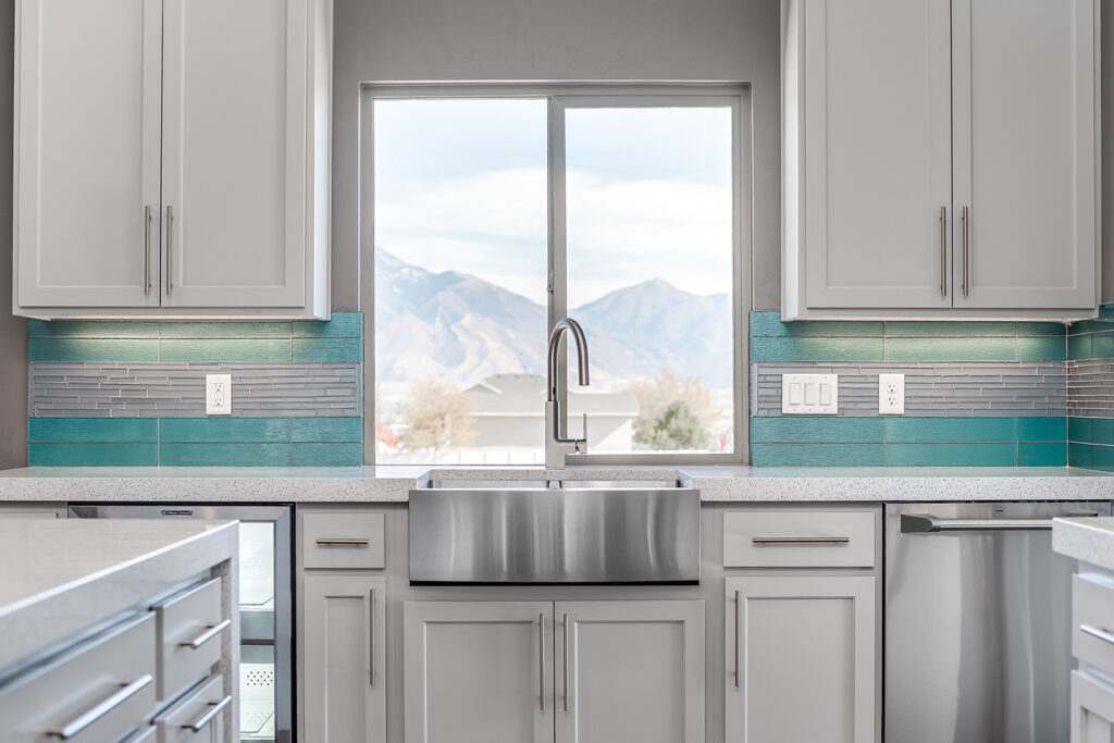 Staber residence features a large modern kitchen with stainless steel appliances, custom glass and matchstick tile backsplash, farmhouse style sink, and custom cabinetry.