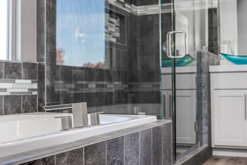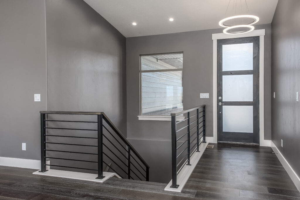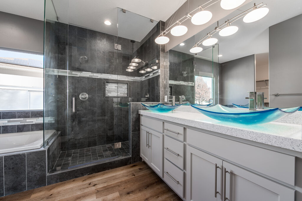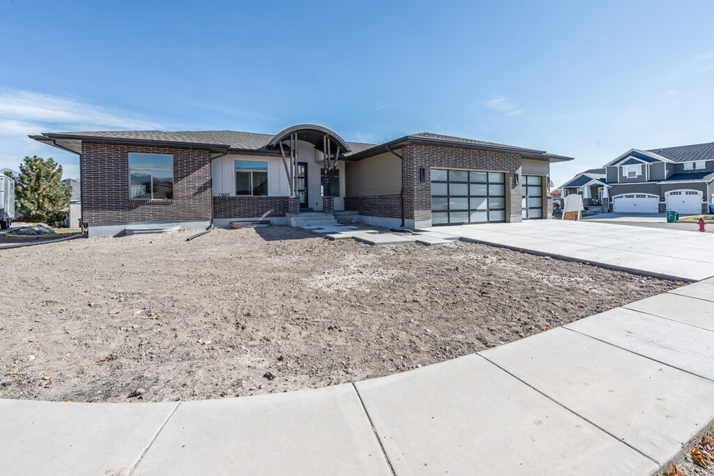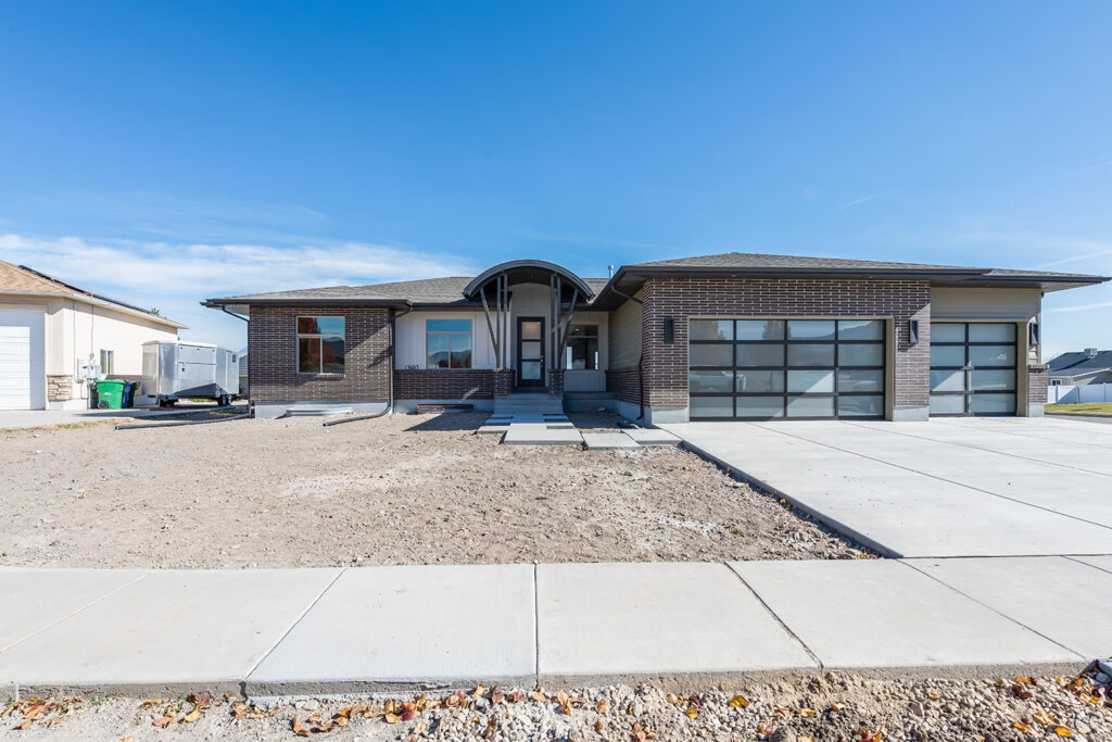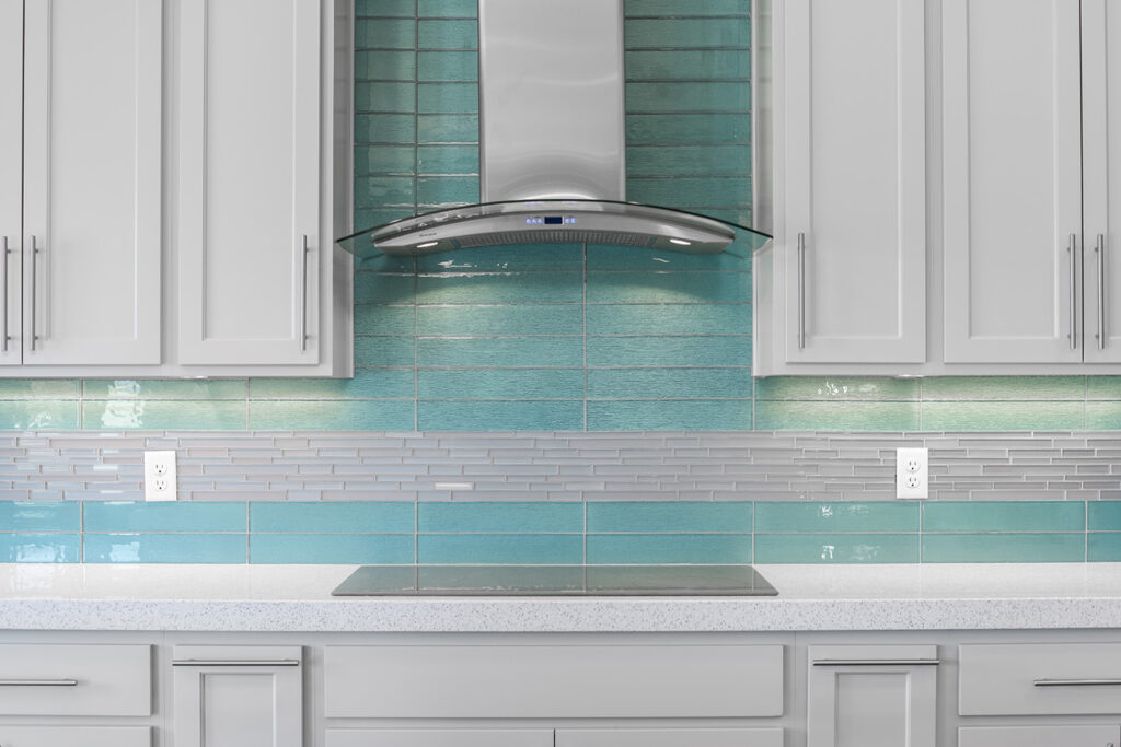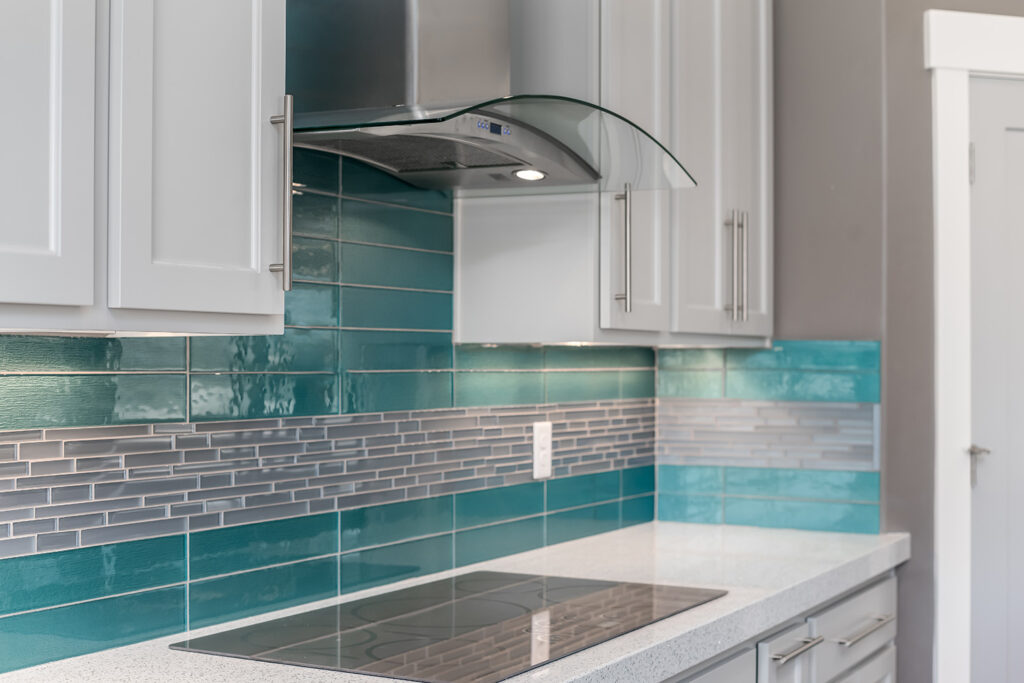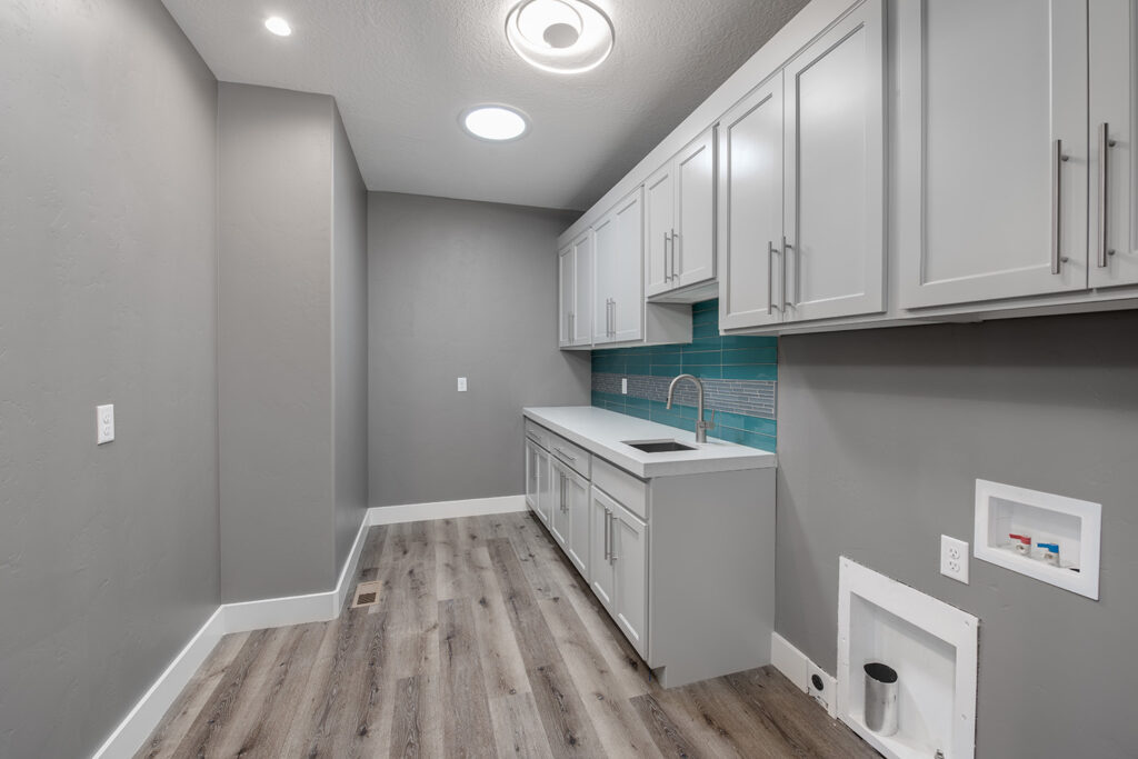 Staber residence features a large modern kitchen with stainless steel appliances, custom glass and matchstick tile backsplash, farmhouse style sink, and custom cabinetry.