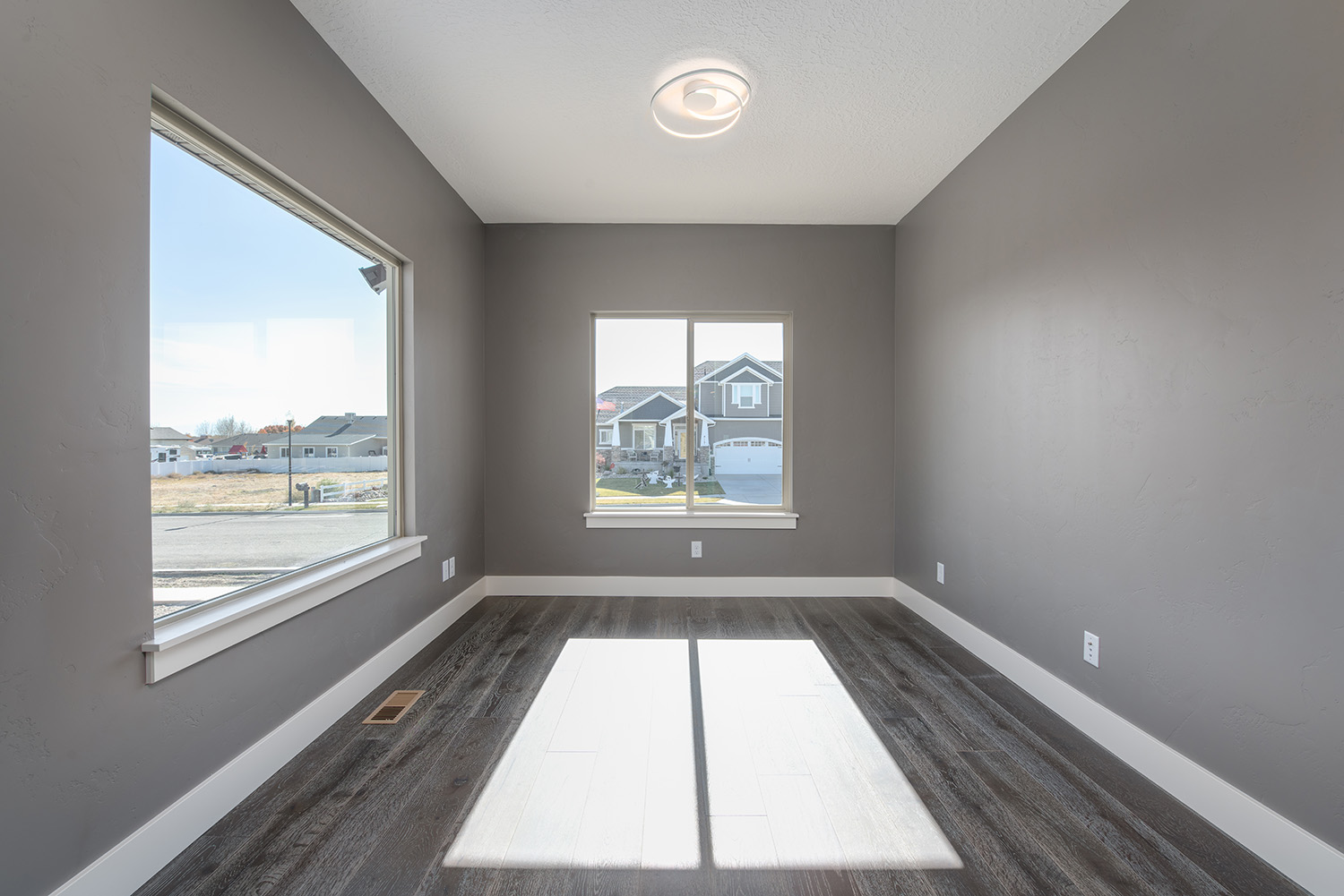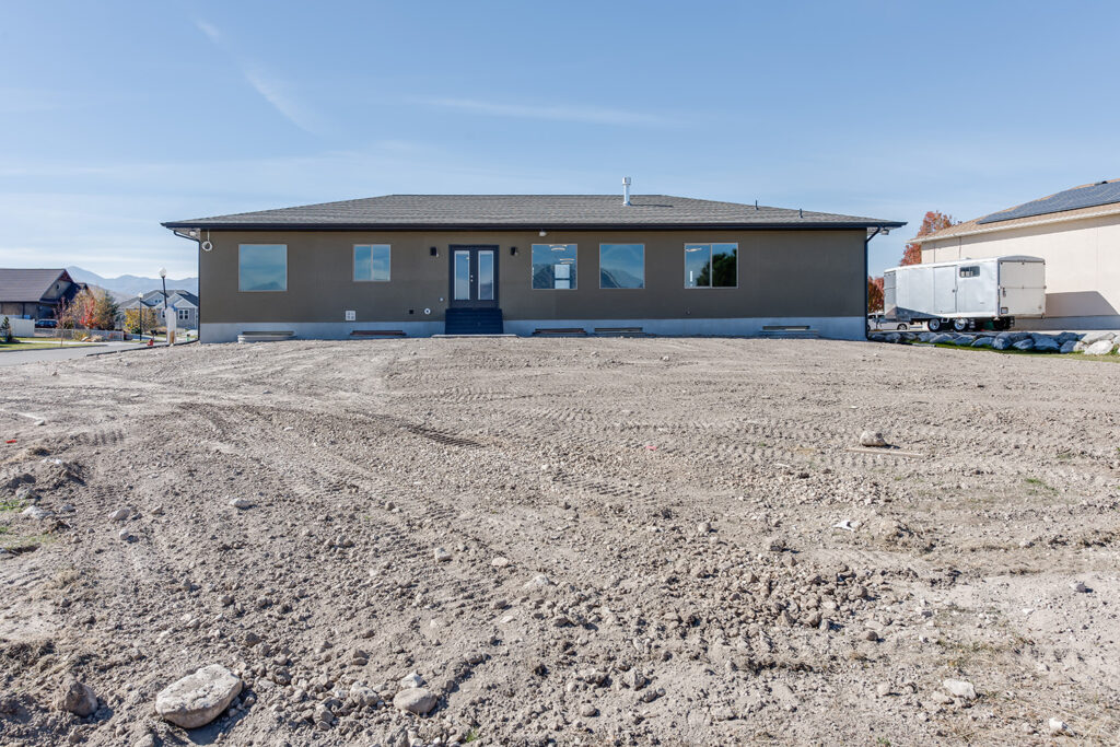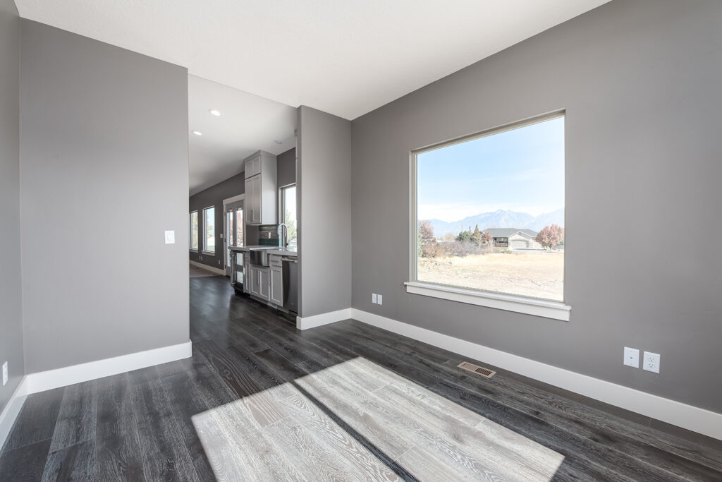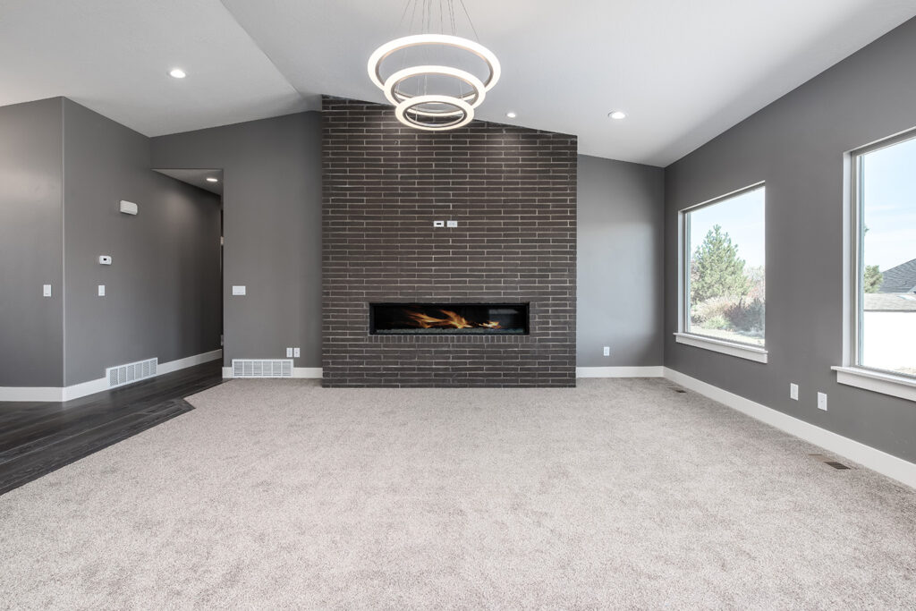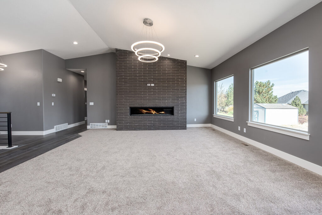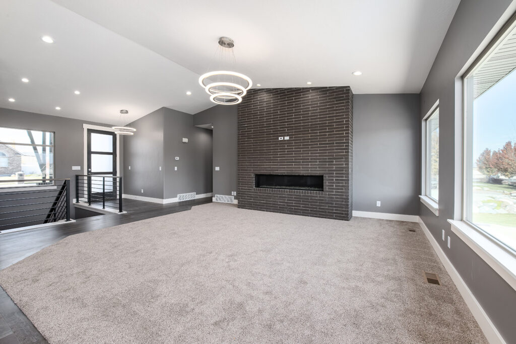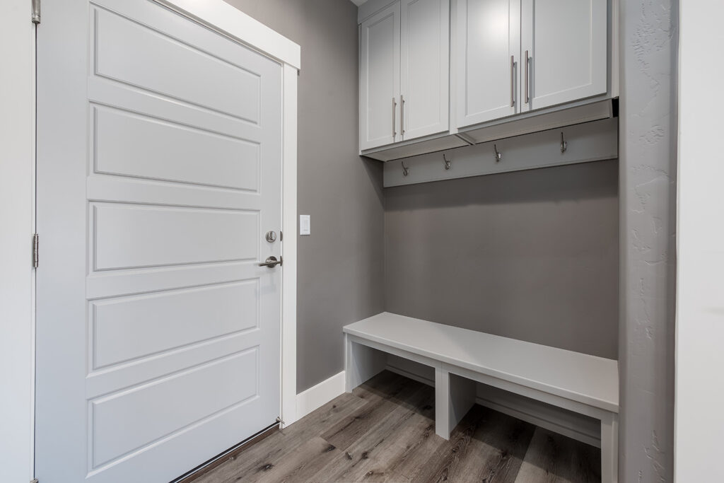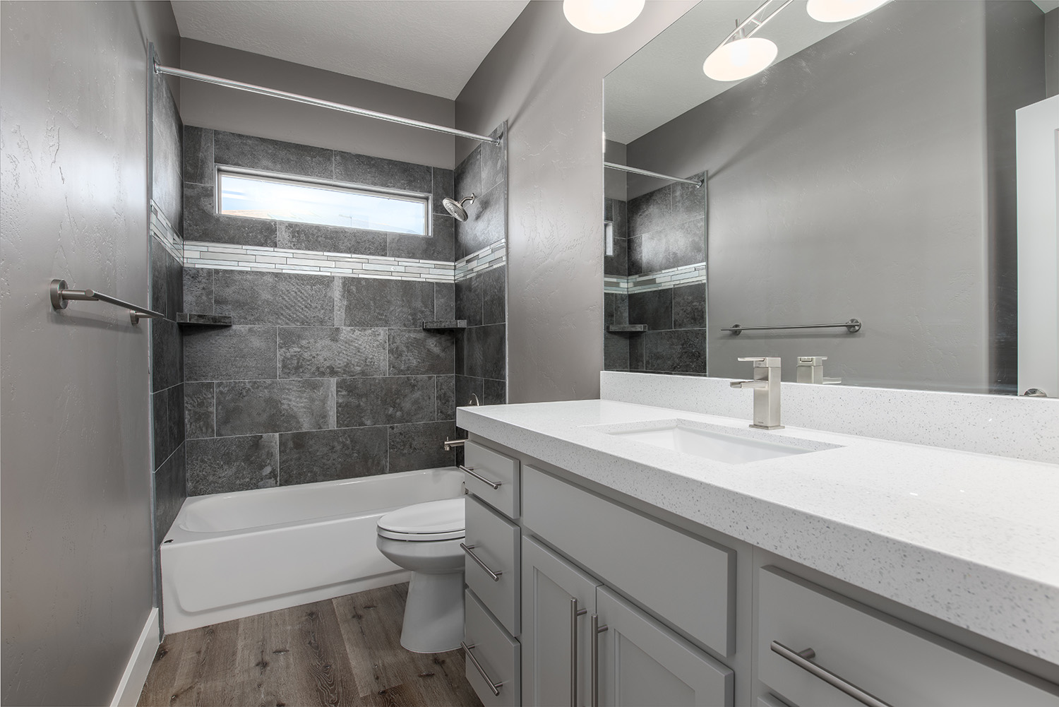 Staber residence features a large modern kitchen with stainless steel appliances, custom glass and matchstick tile backsplash, farmhouse style sink, and custom cabinetry.
