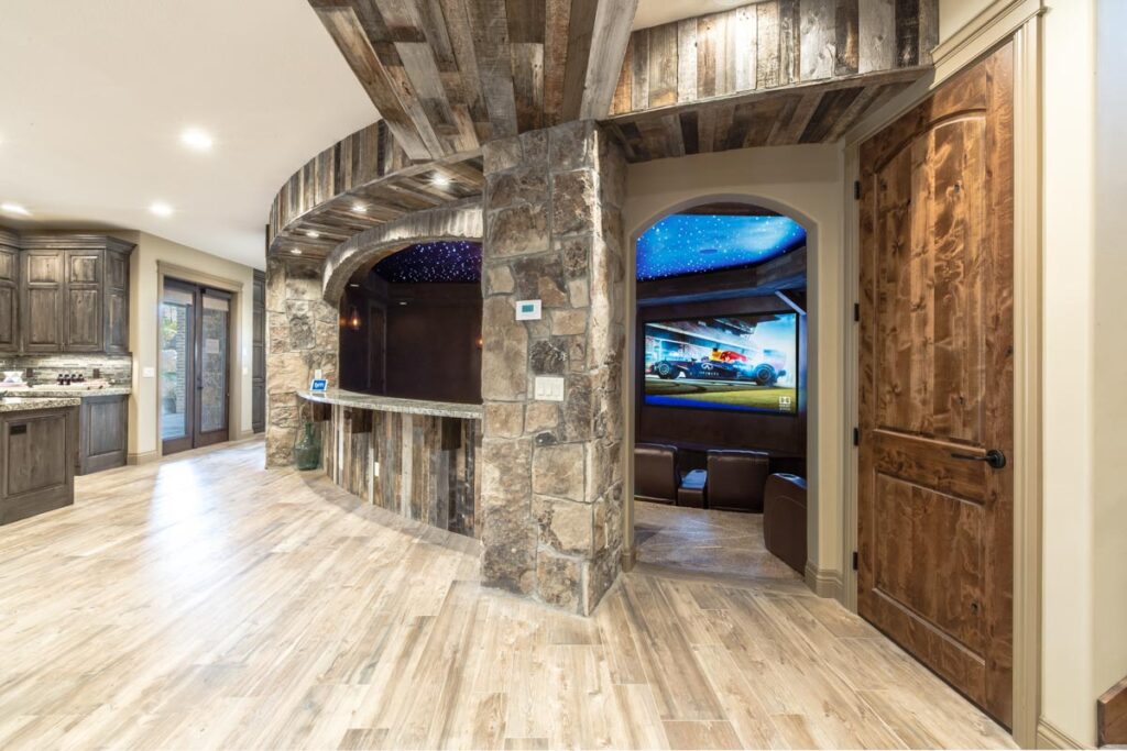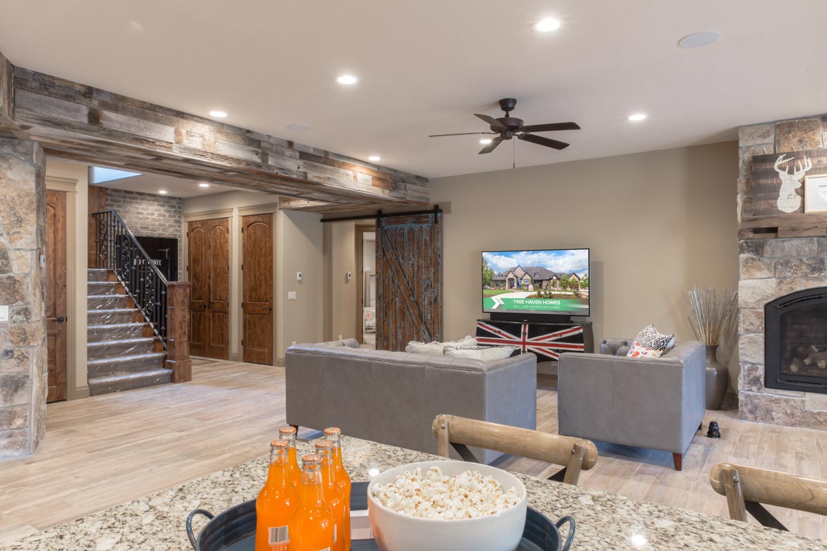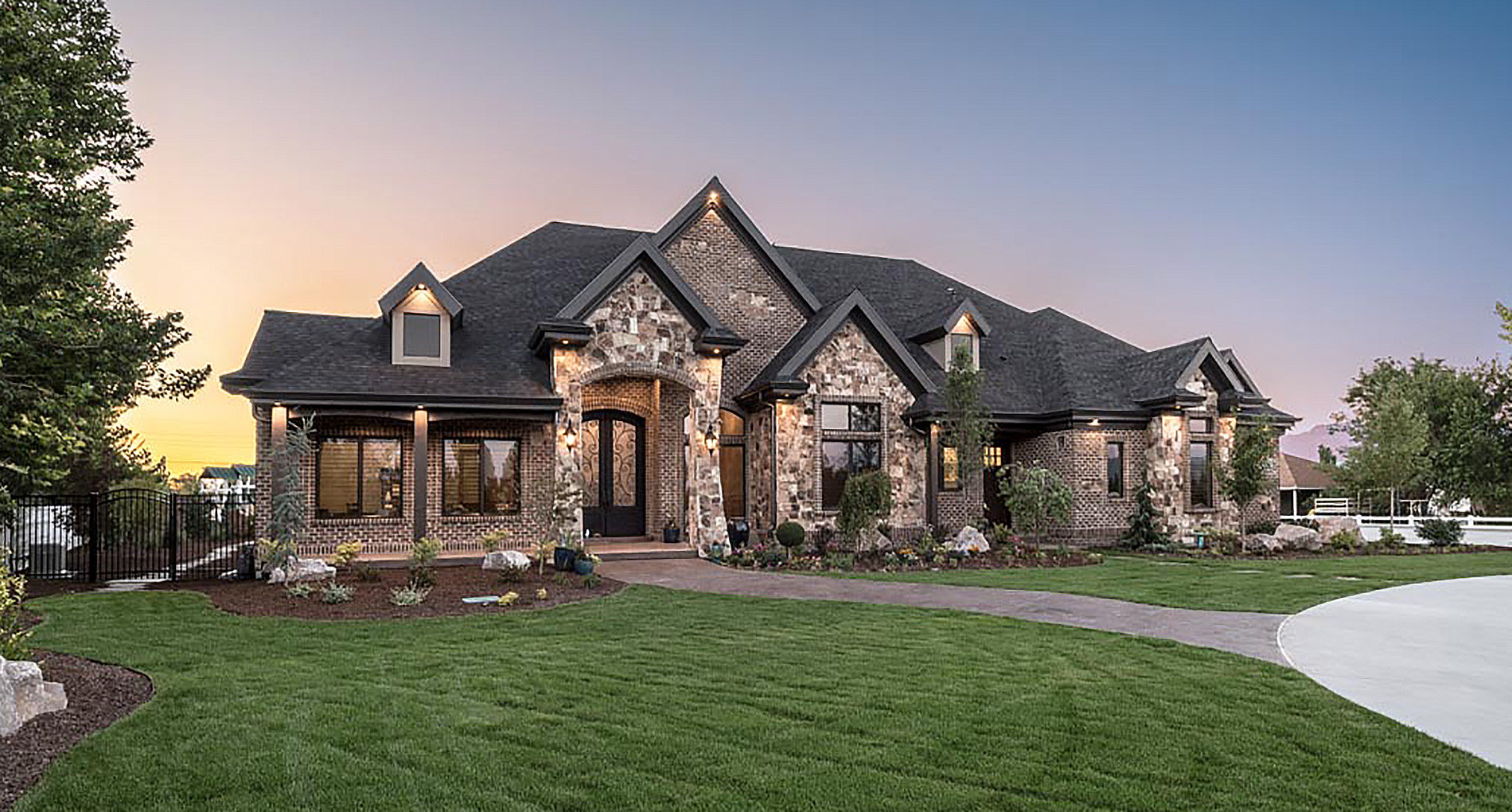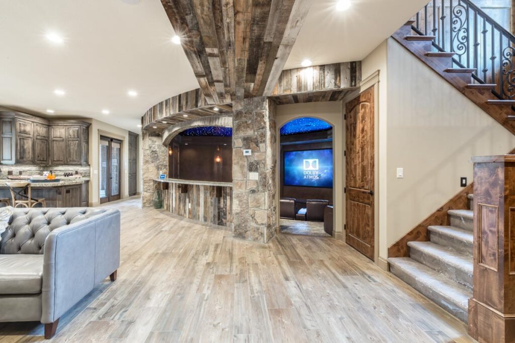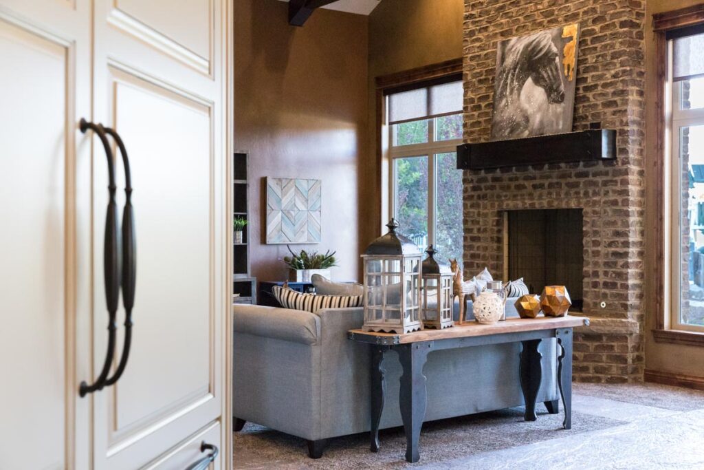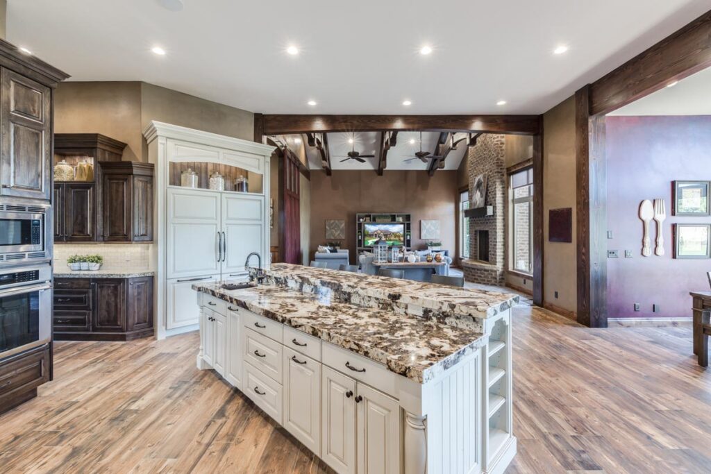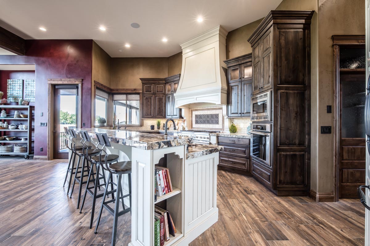 This stone and brick exterior custom home features a gourmet kitchen, dining room with a view, cozy living room, master suite, and large home theatre. The living room has a brick fireplace and vaulted ceiling with exposed wooden beams.