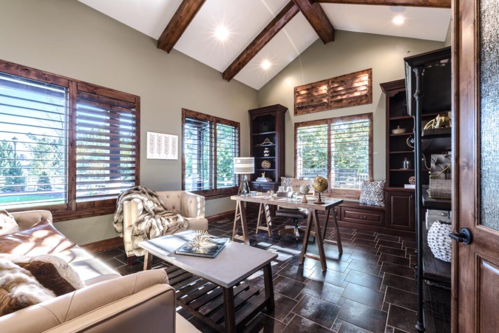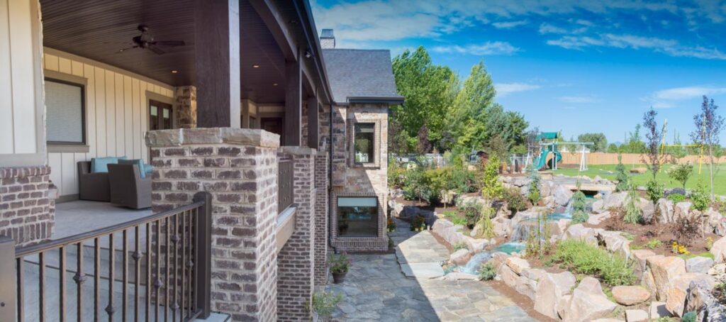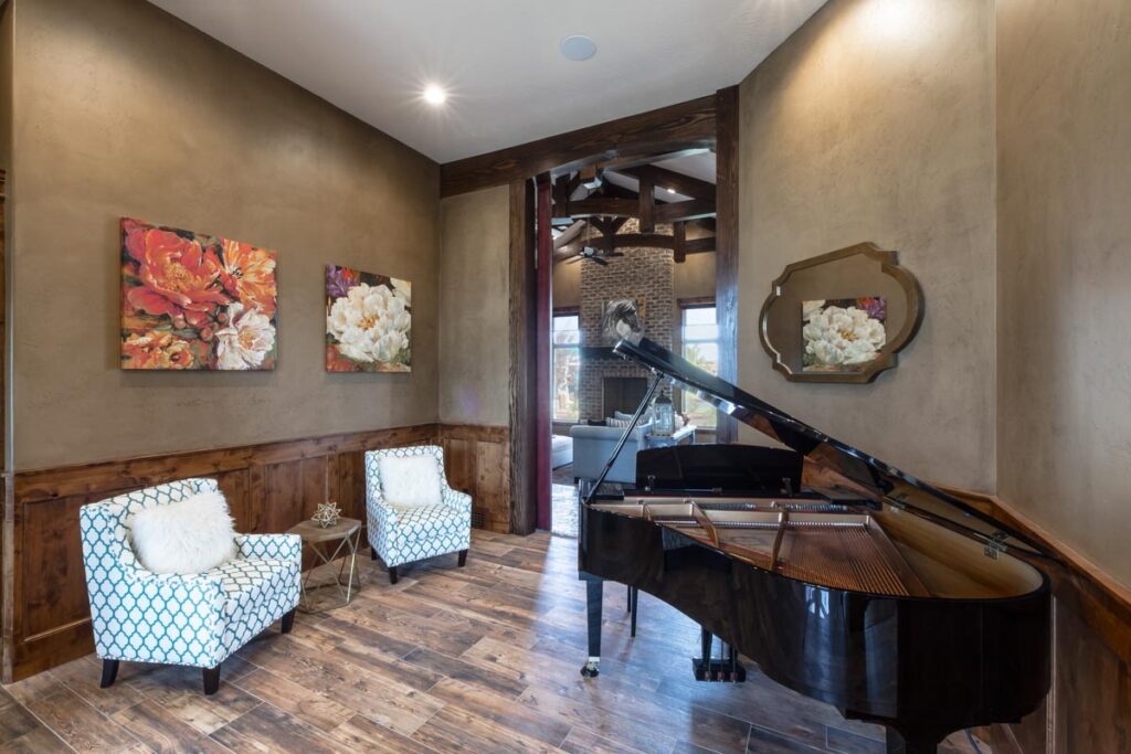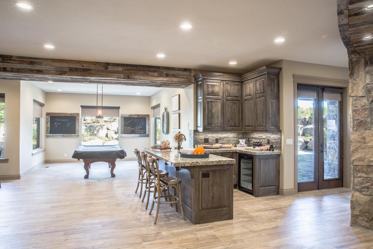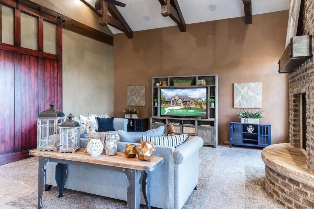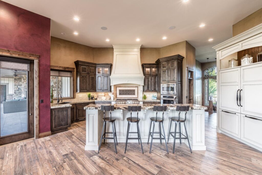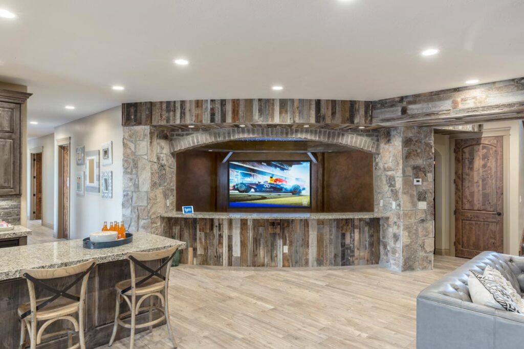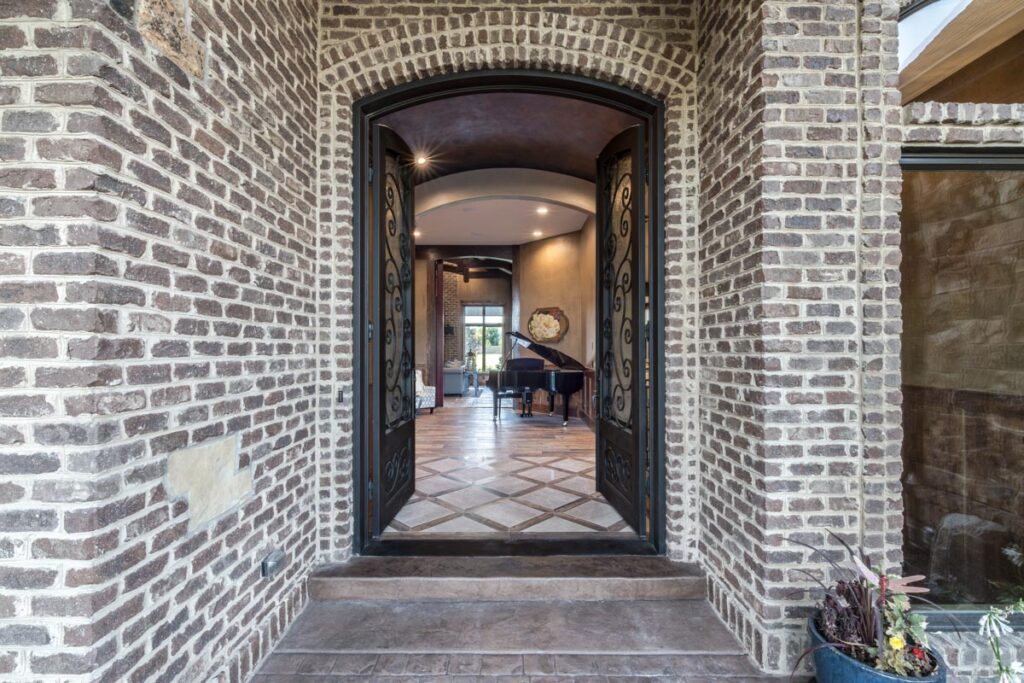 This stone and brick exterior custom home features a gourmet kitchen, dining room with a view, cozy living room, master suite, and large home theatre. The living room has a brick fireplace and vaulted ceiling with exposed wooden beams.
