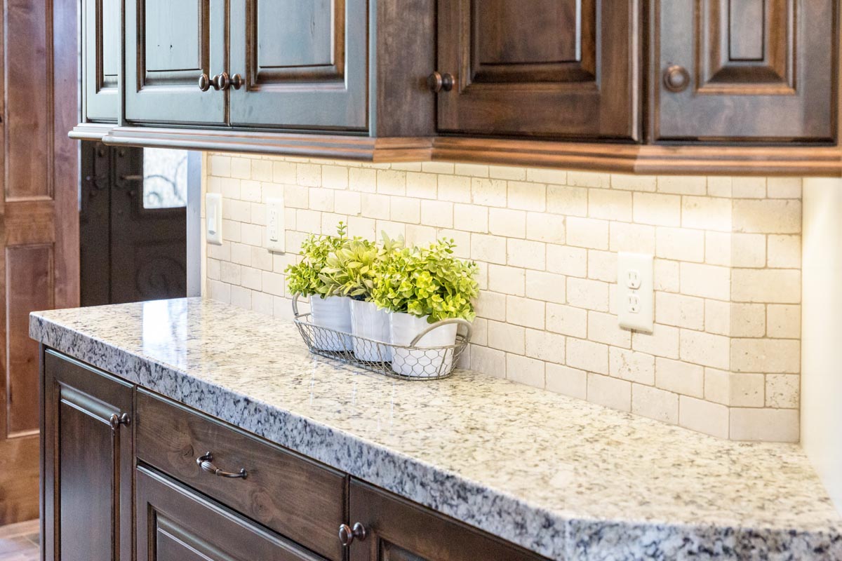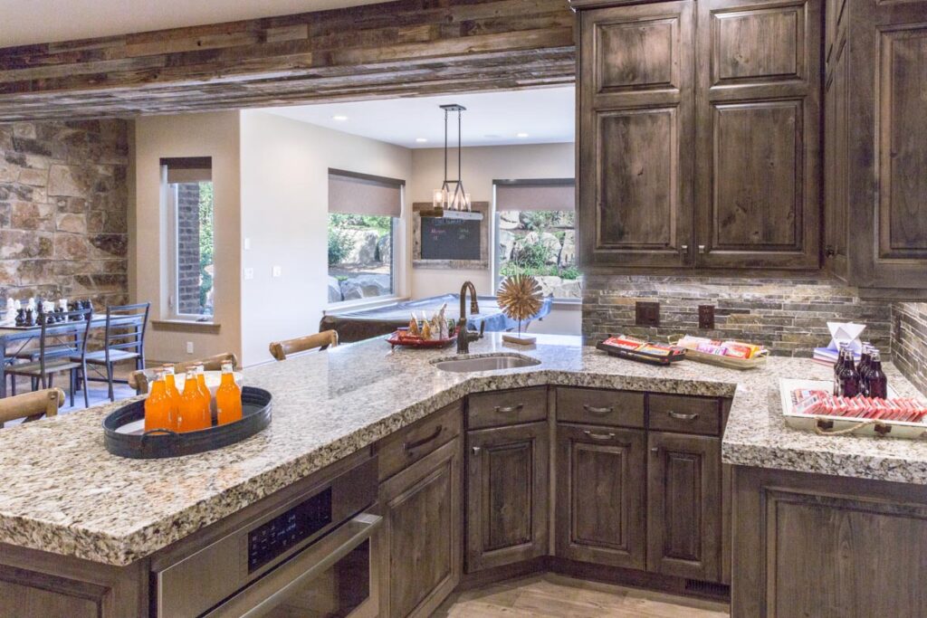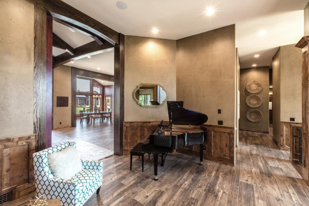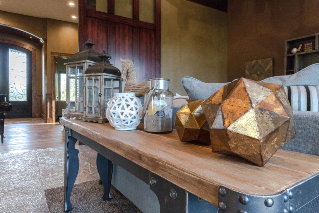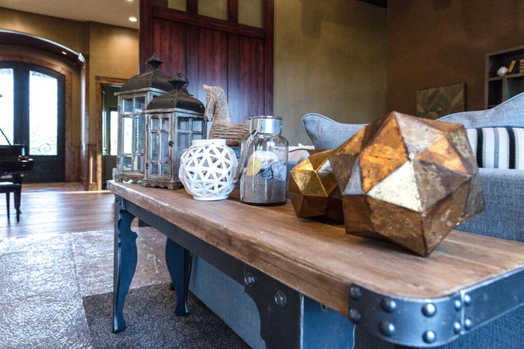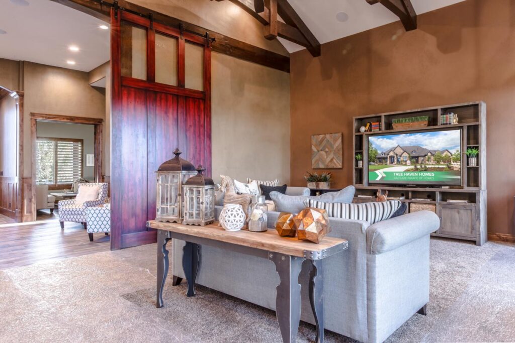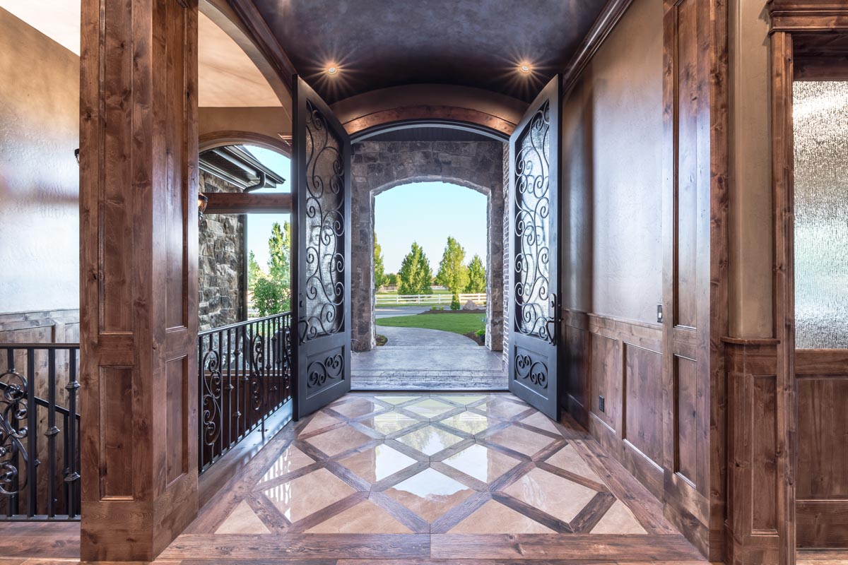 This stone and brick exterior custom home features a gourmet kitchen, dining room with a view, cozy living room, master suite, and large home theatre. The living room has a brick fireplace and vaulted ceiling with exposed wooden beams.