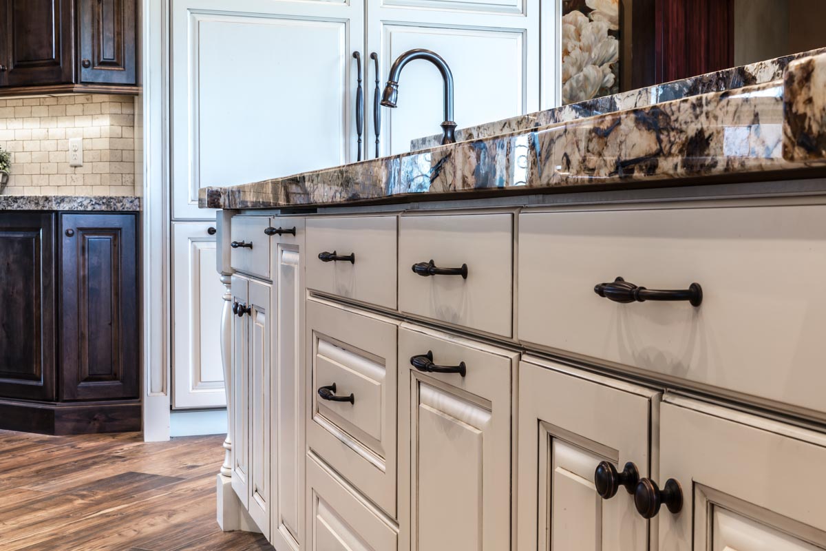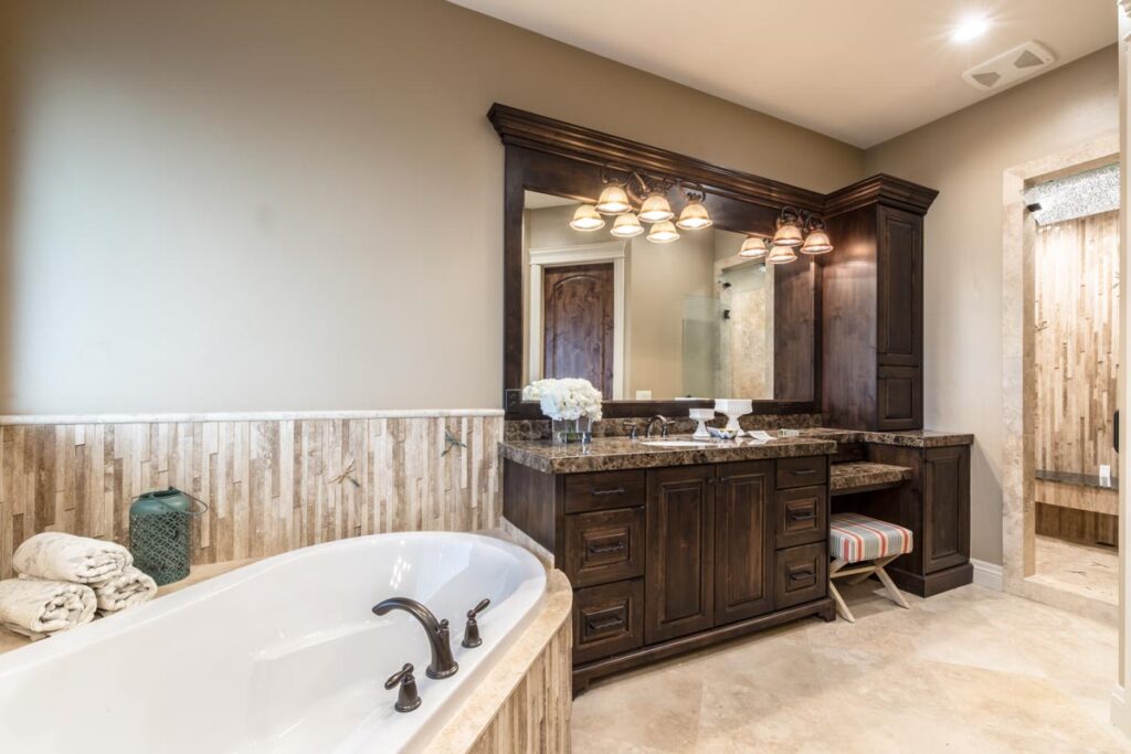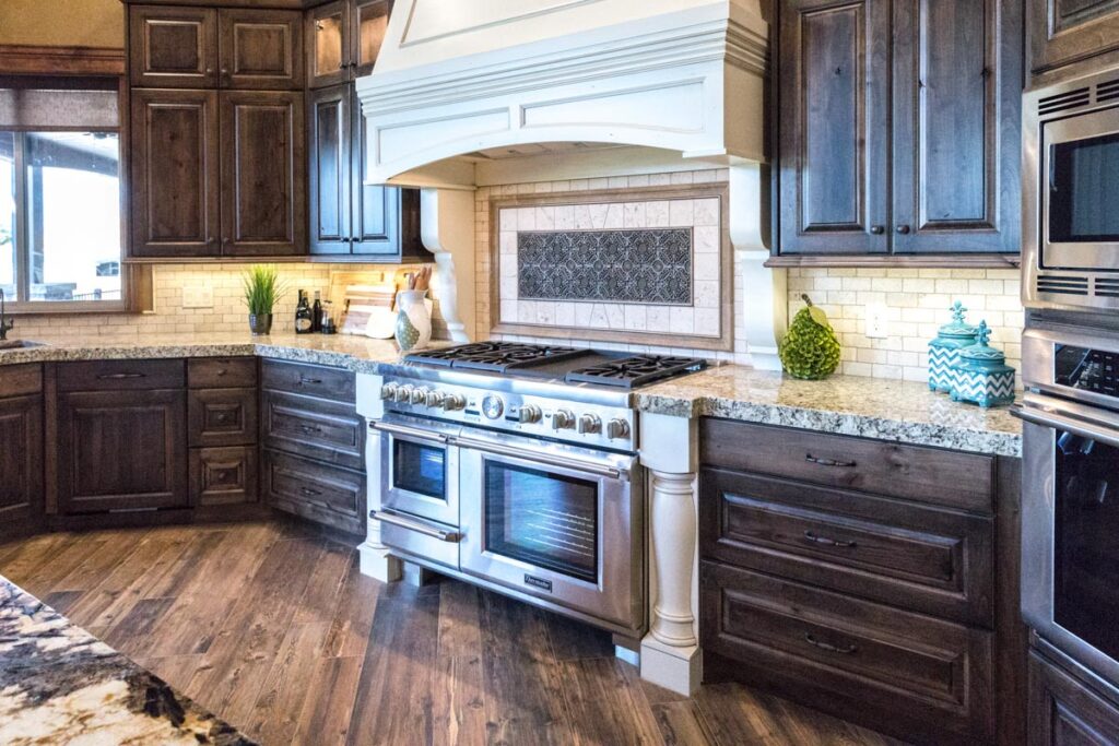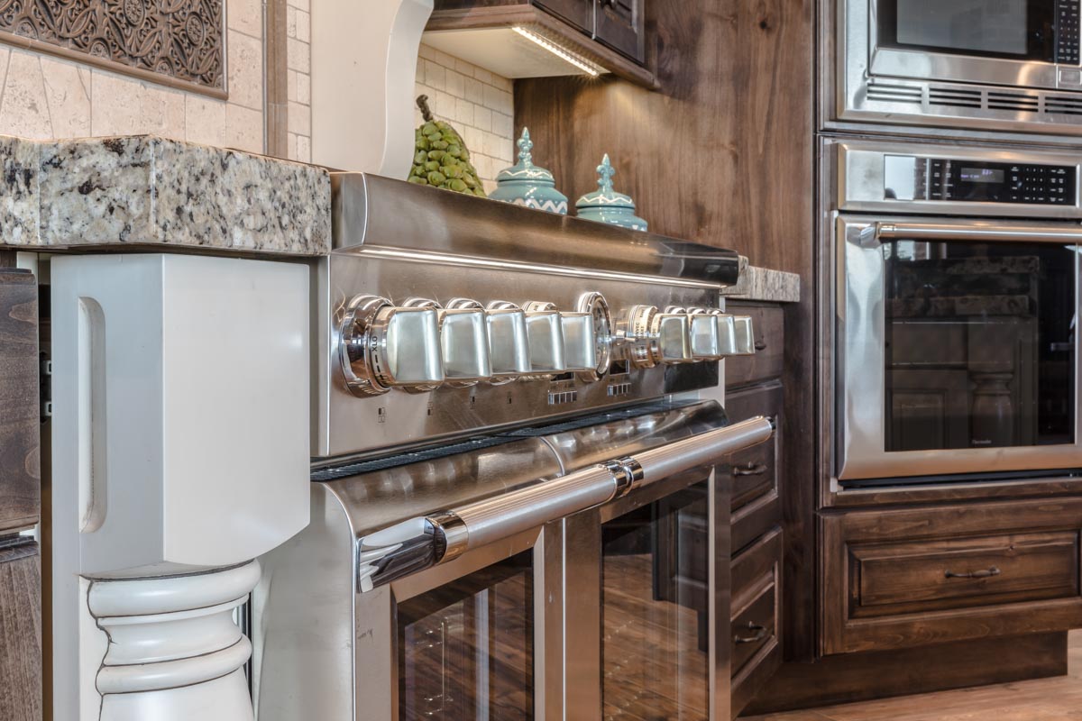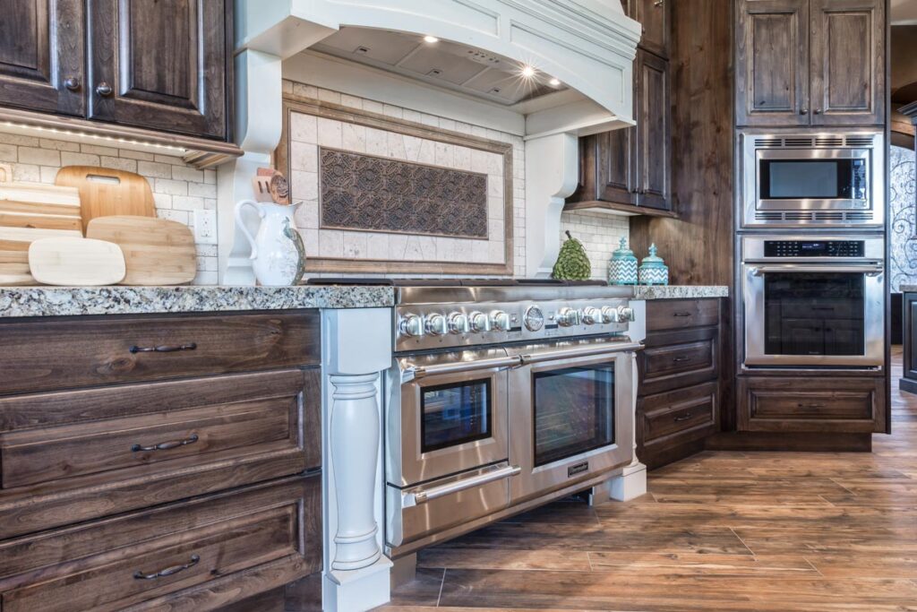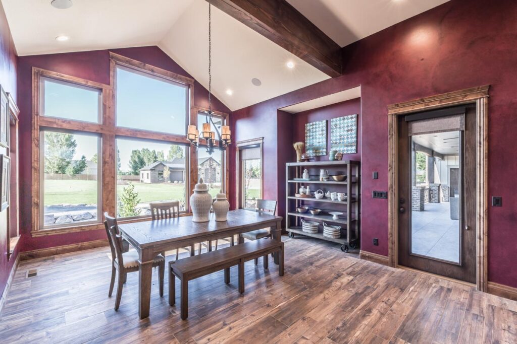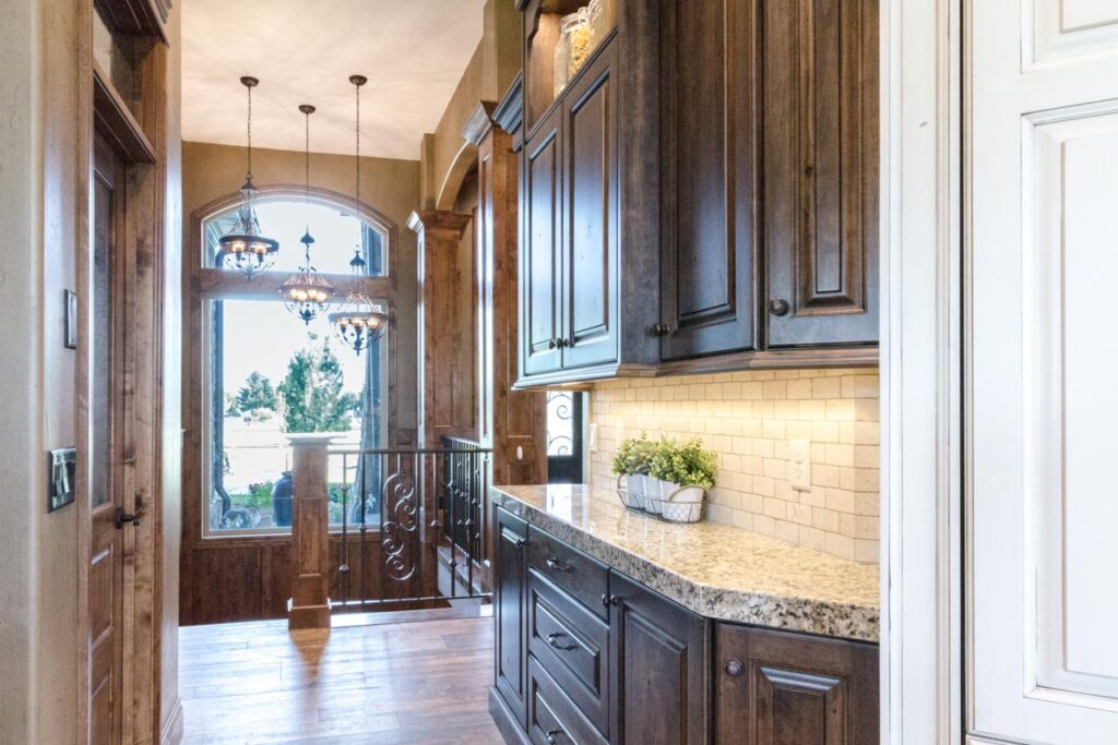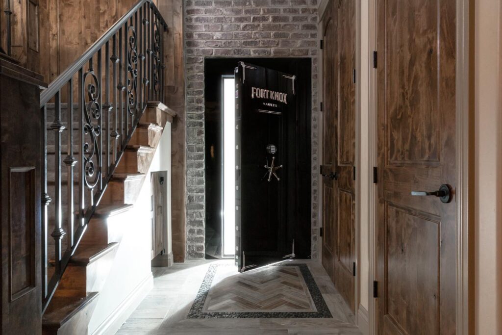 This stone and brick exterior custom home features a gourmet kitchen, dining room with a view, cozy living room, master suite, and large home theatre. The living room has a brick fireplace and vaulted ceiling with exposed wooden beams.