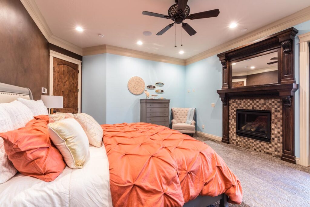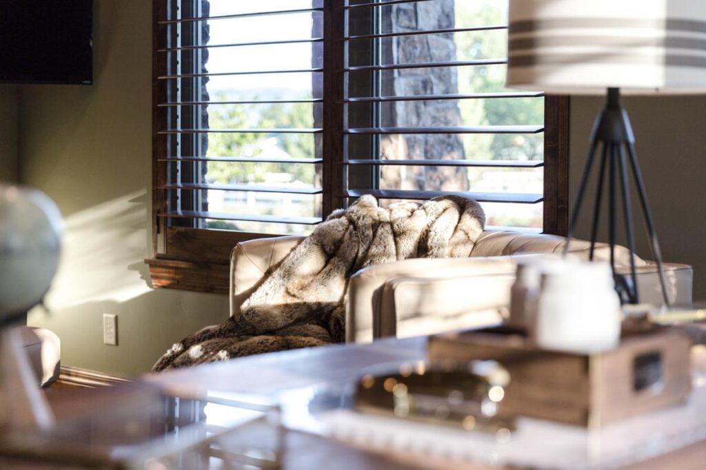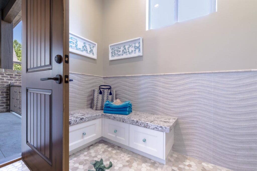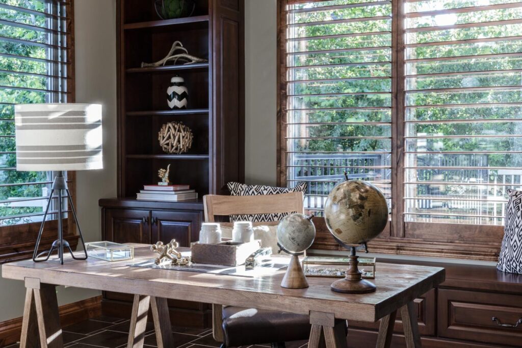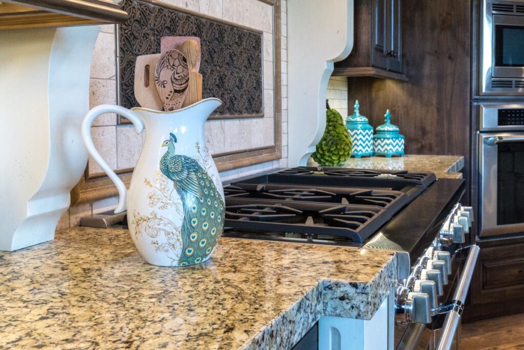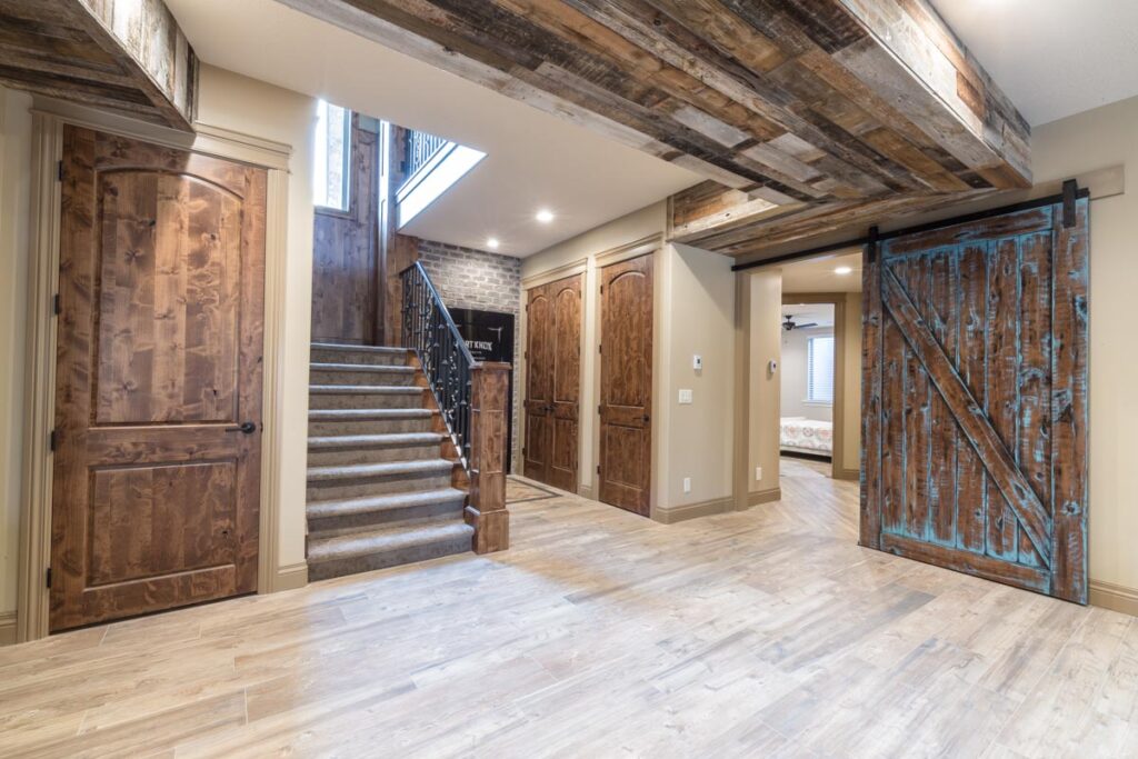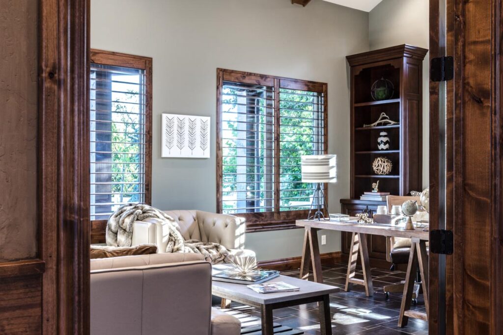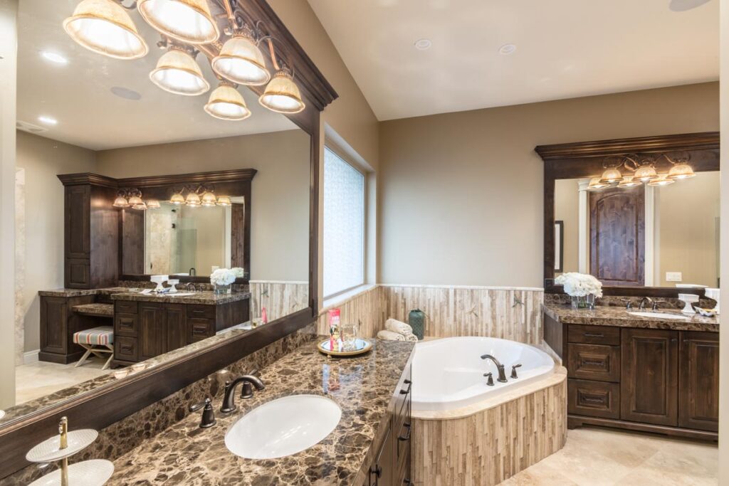 This stone and brick exterior custom home features a gourmet kitchen, dining room with a view, cozy living room, master suite, and large home theatre. The living room has a brick fireplace and vaulted ceiling with exposed wooden beams.