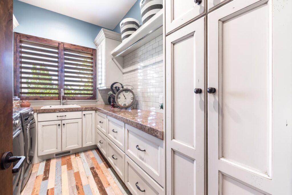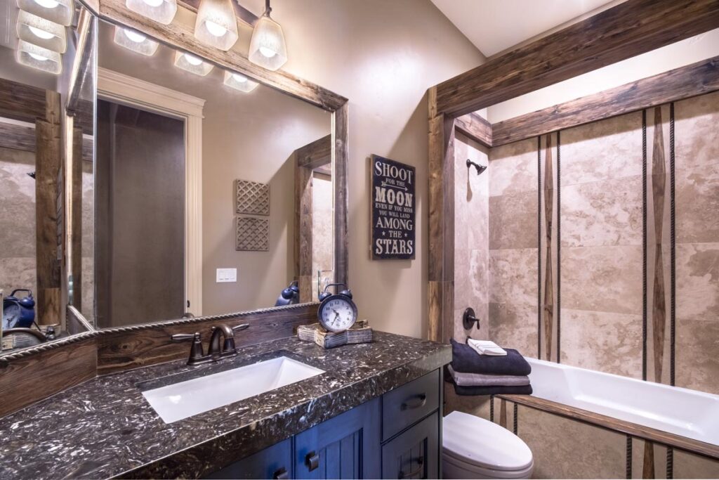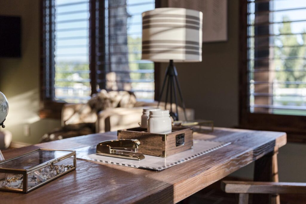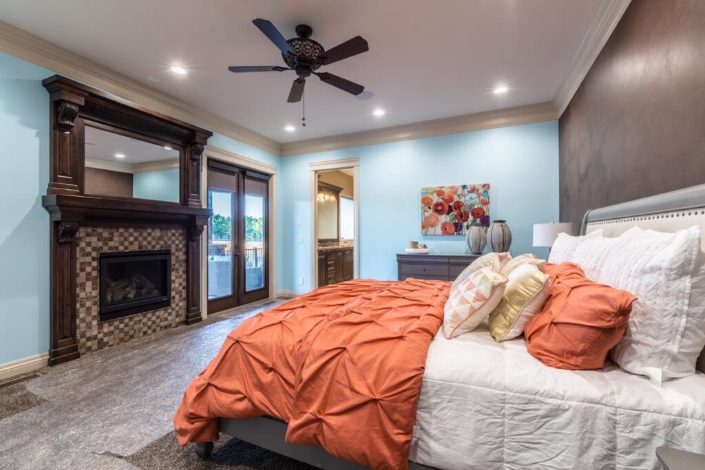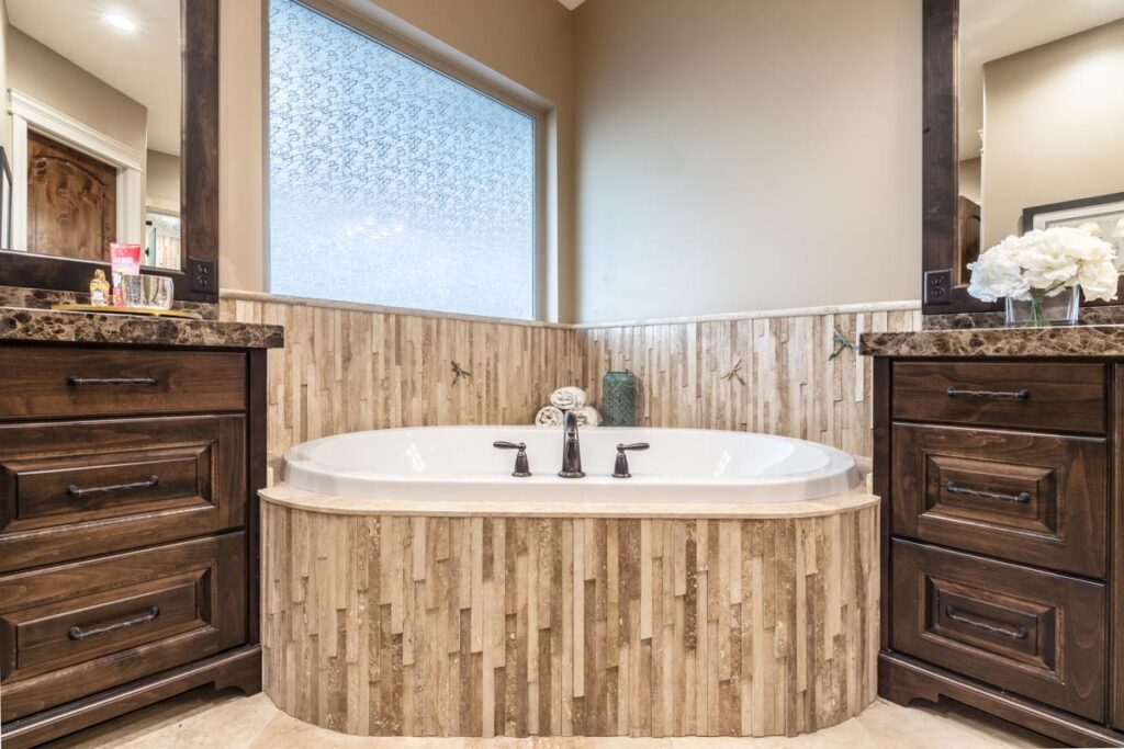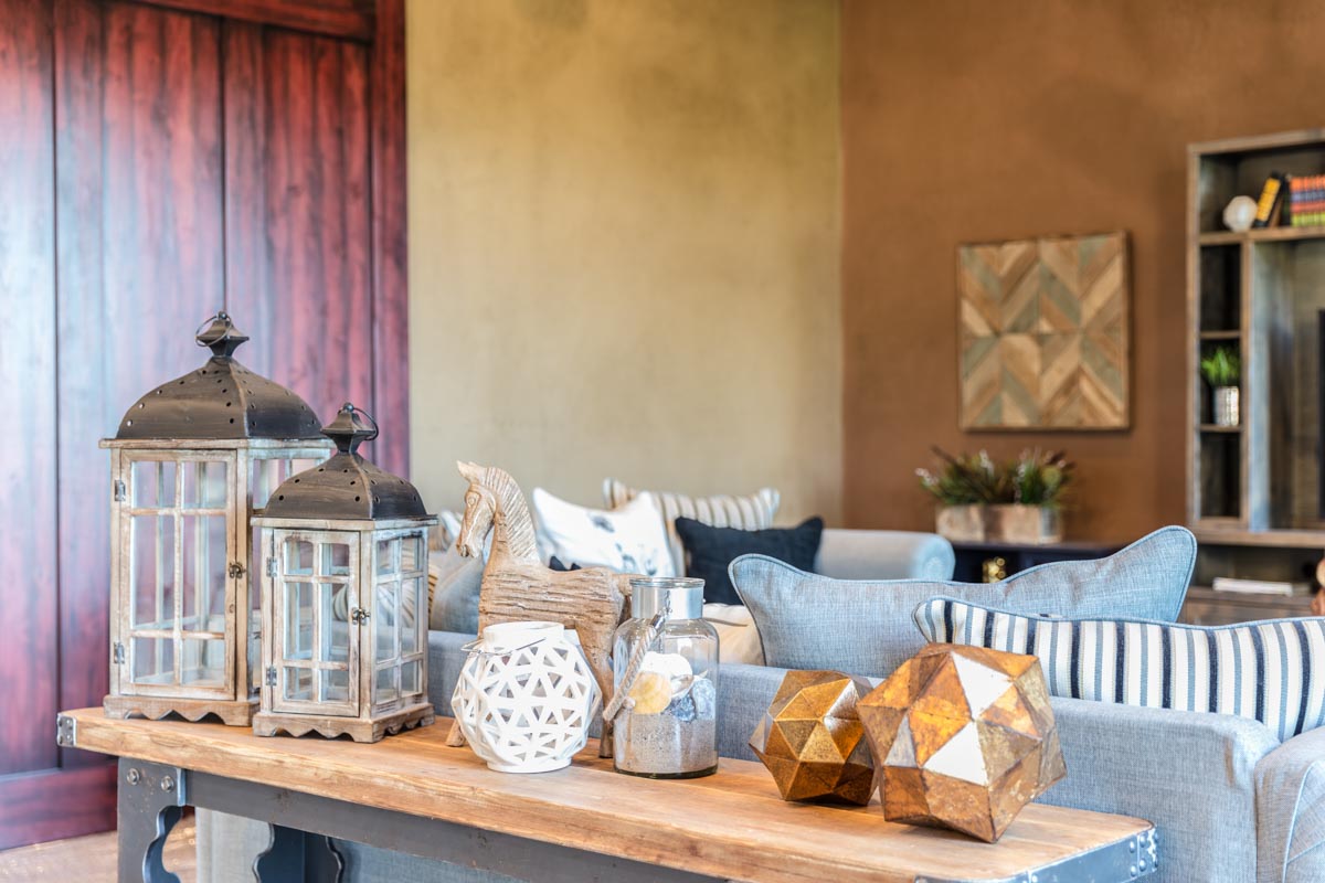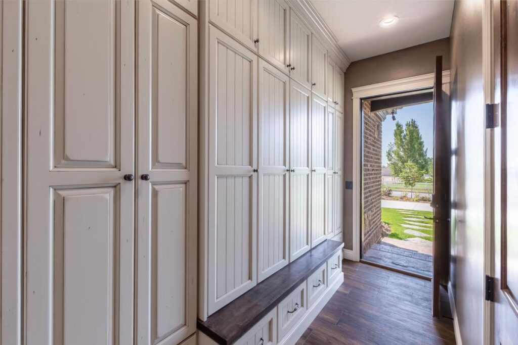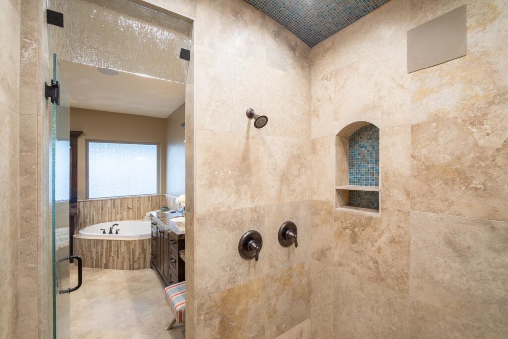 This stone and brick exterior custom home features a gourmet kitchen, dining room with a view, cozy living room, master suite, and large home theatre. The living room has a brick fireplace and vaulted ceiling with exposed wooden beams.