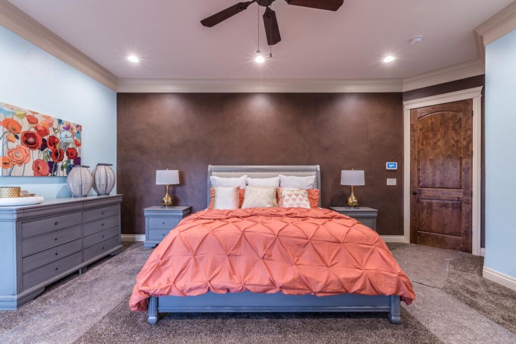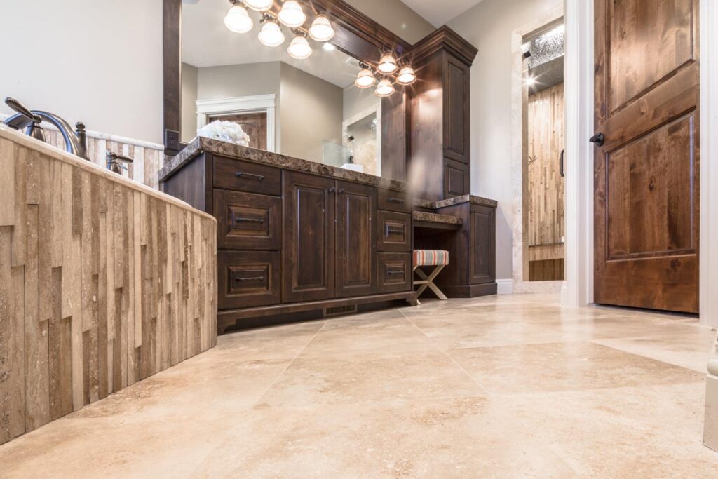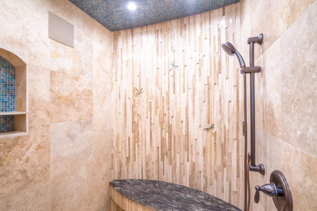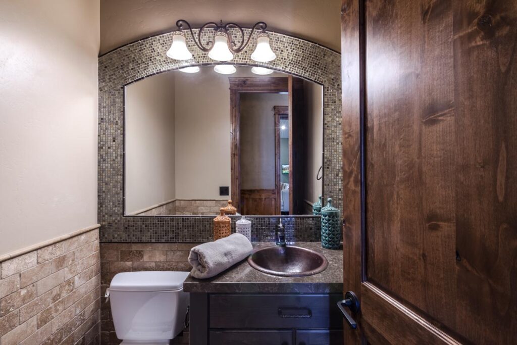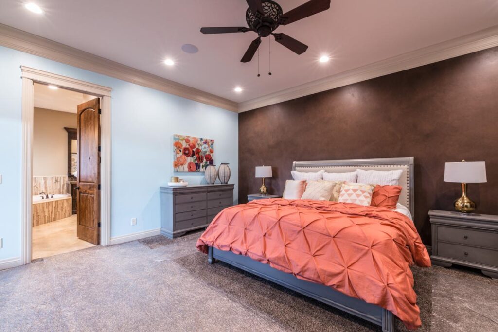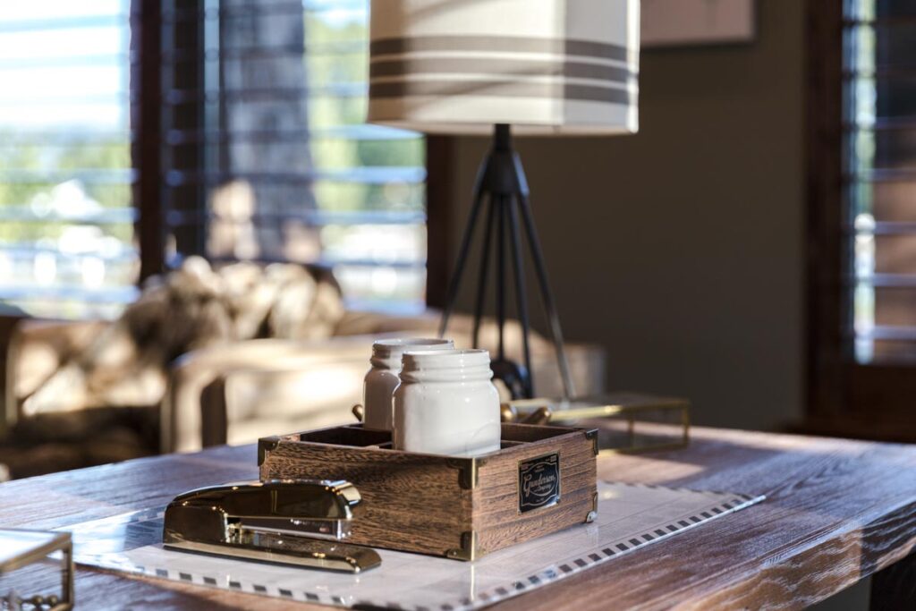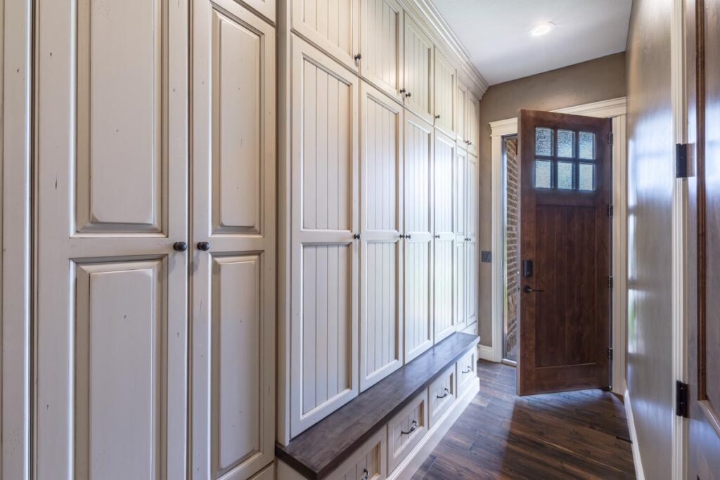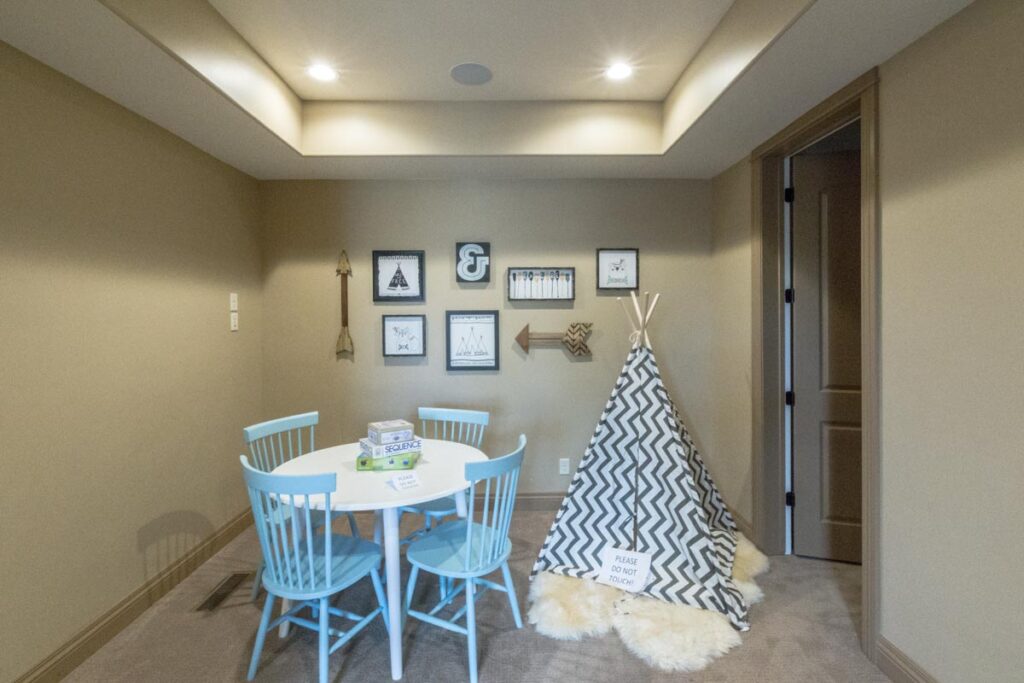 This stone and brick exterior custom home features a gourmet kitchen, dining room with a view, cozy living room, master suite, and large home theatre. The living room has a brick fireplace and vaulted ceiling with exposed wooden beams.