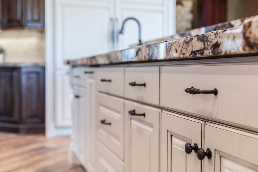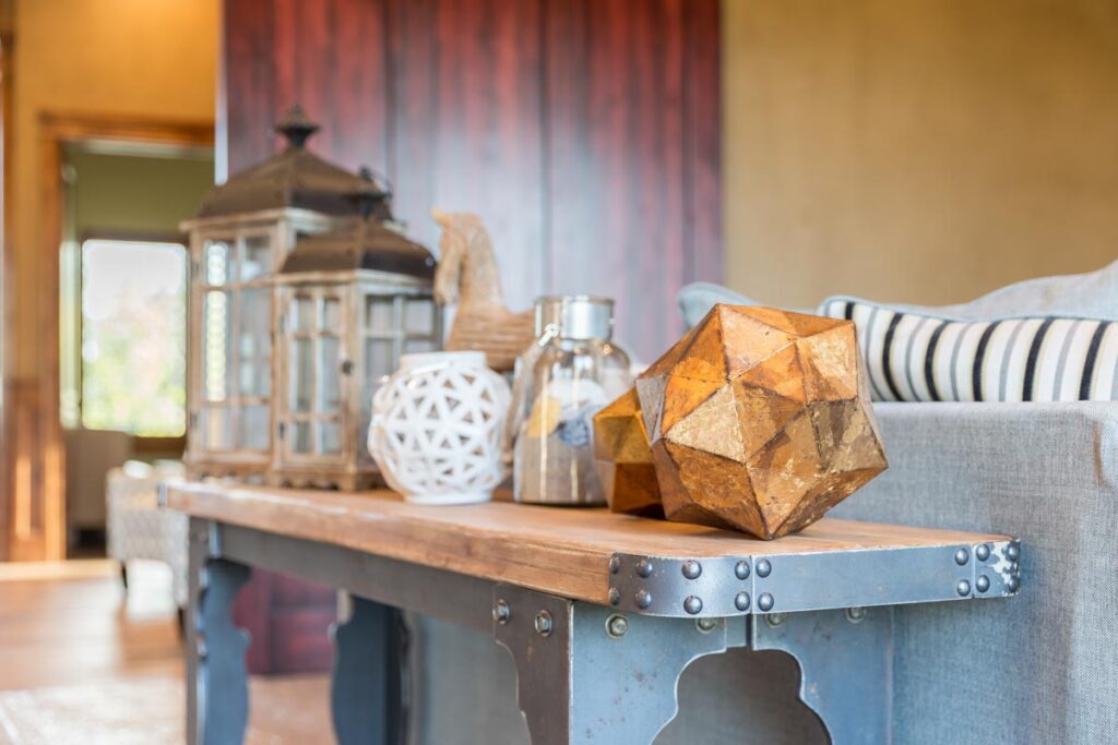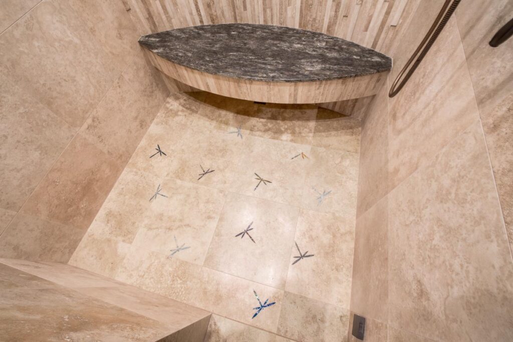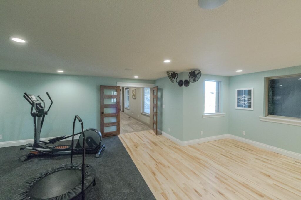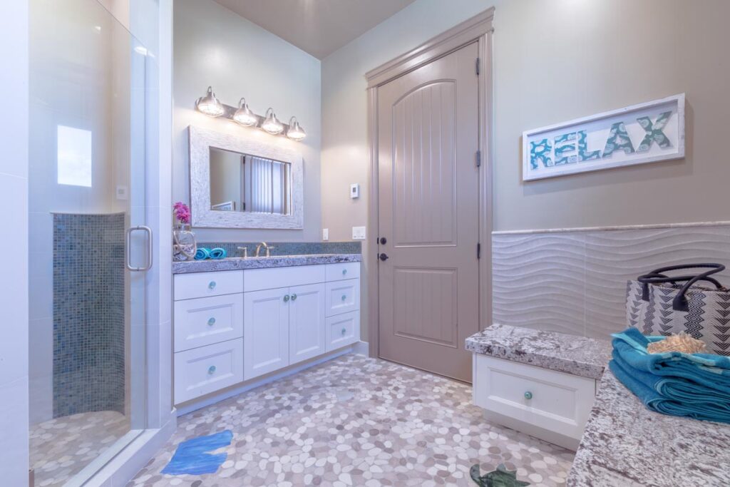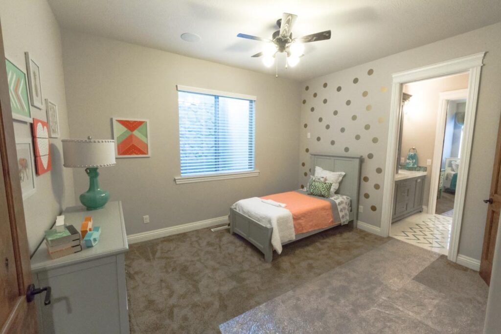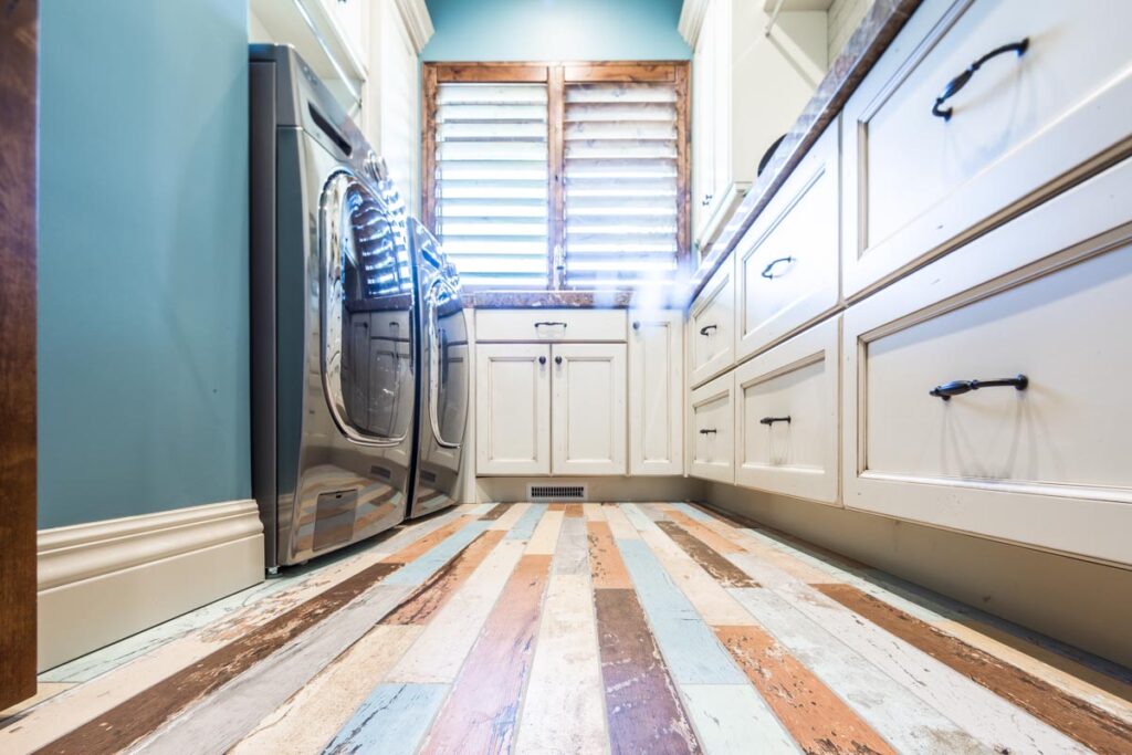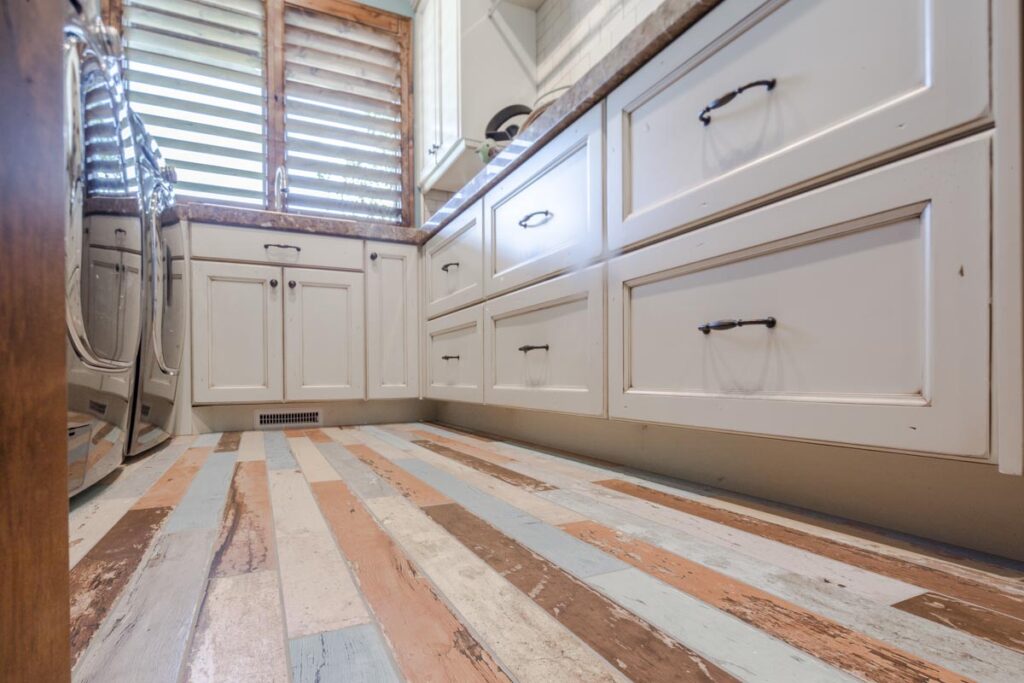This stone and brick exterior custom home features a gourmet kitchen, dining room with a view, cozy living room, master suite, and large home theatre. The living room has a brick fireplace and vaulted ceiling with exposed wooden beams.