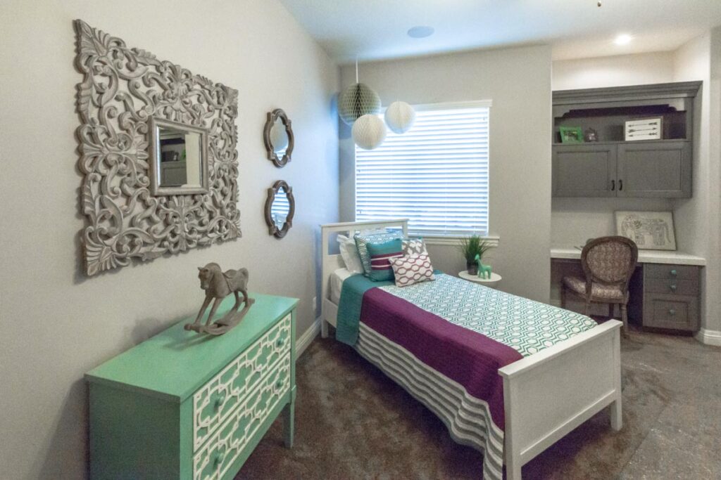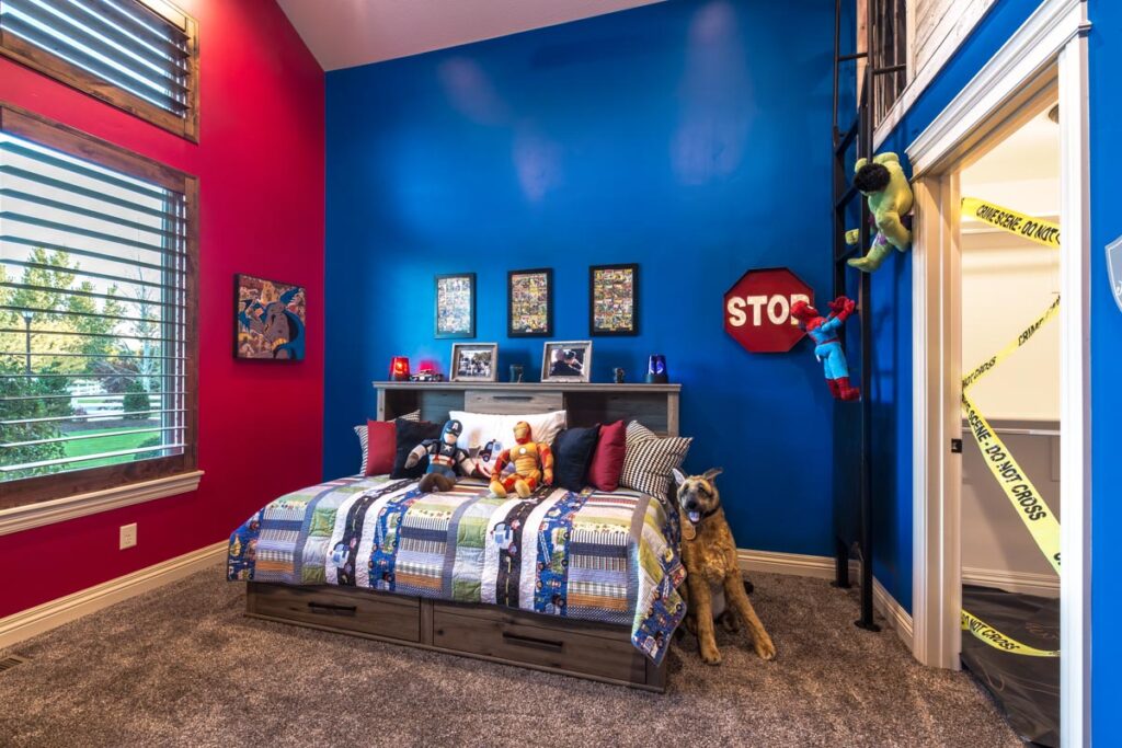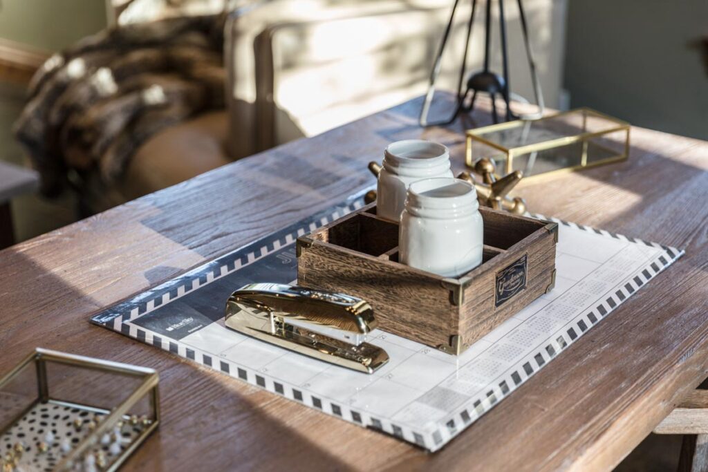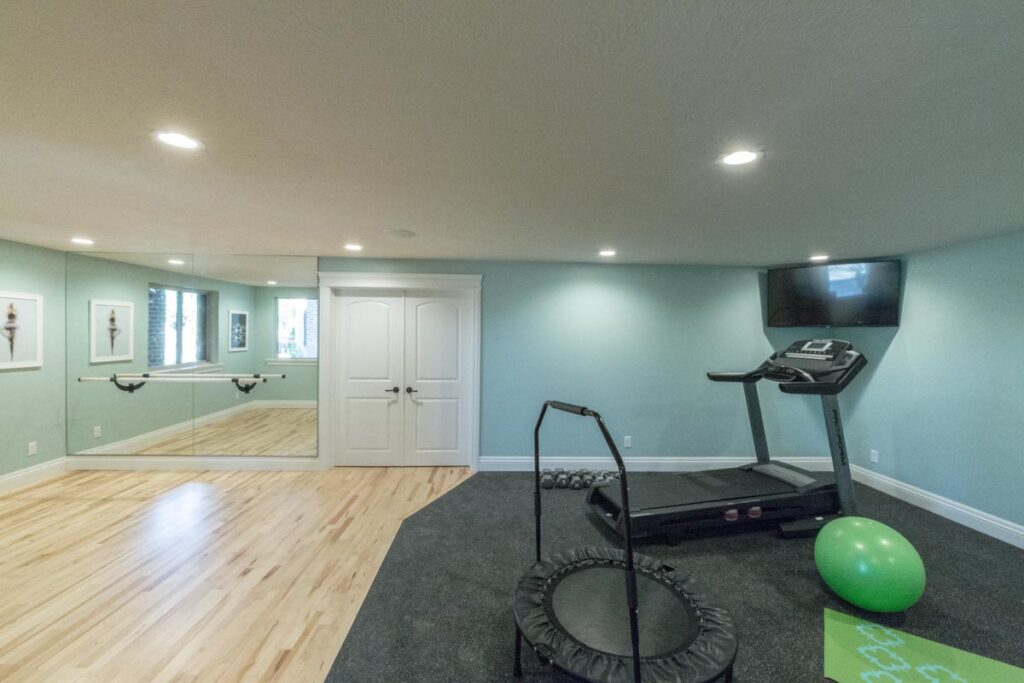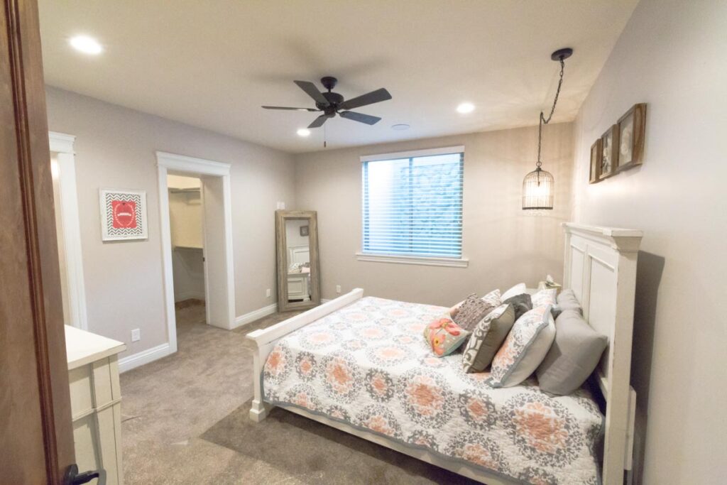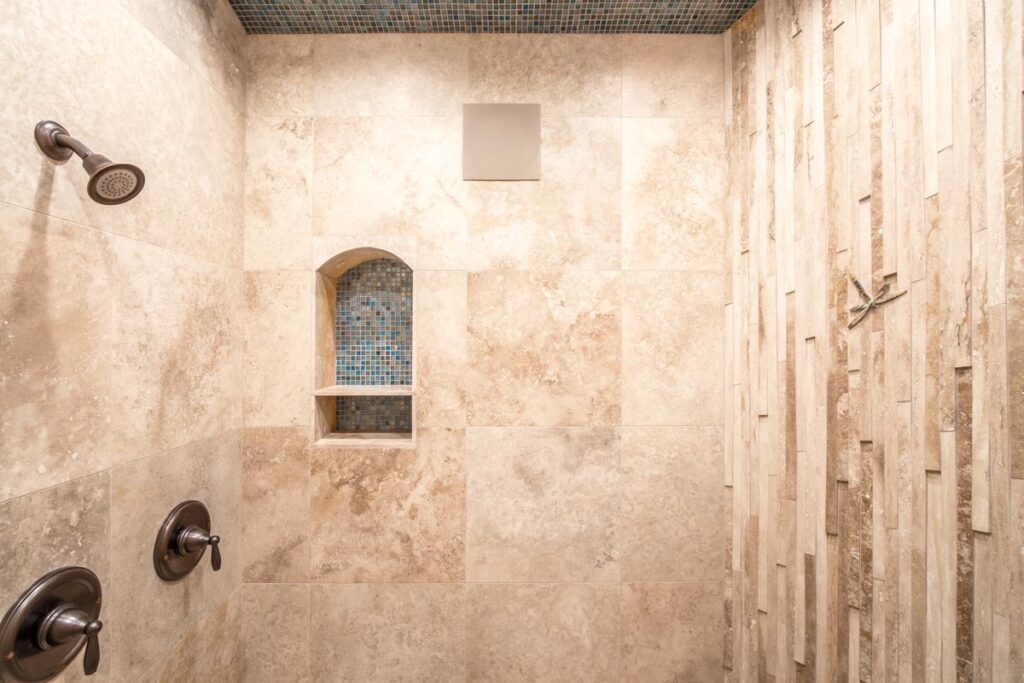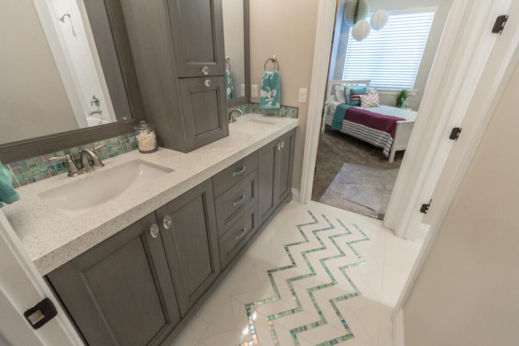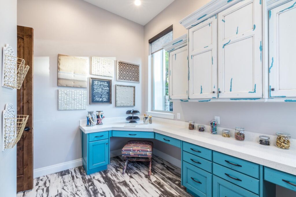 This stone and brick exterior custom home features a gourmet kitchen, dining room with a view, cozy living room, master suite, and large home theatre. The living room has a brick fireplace and vaulted ceiling with exposed wooden beams.