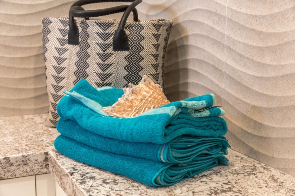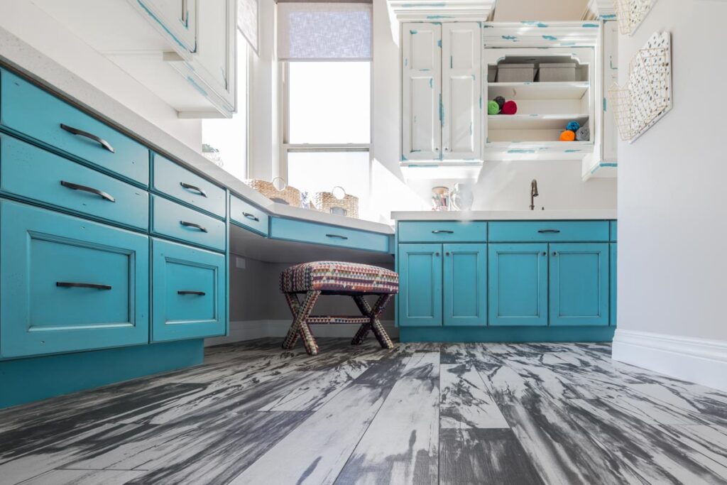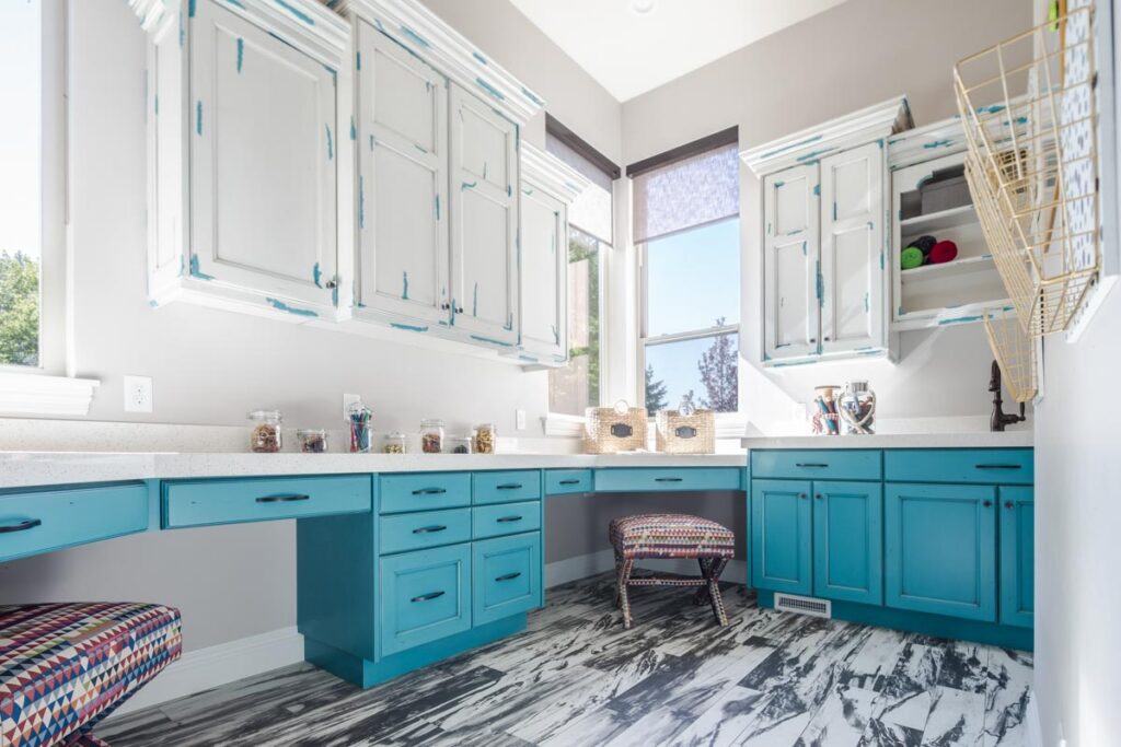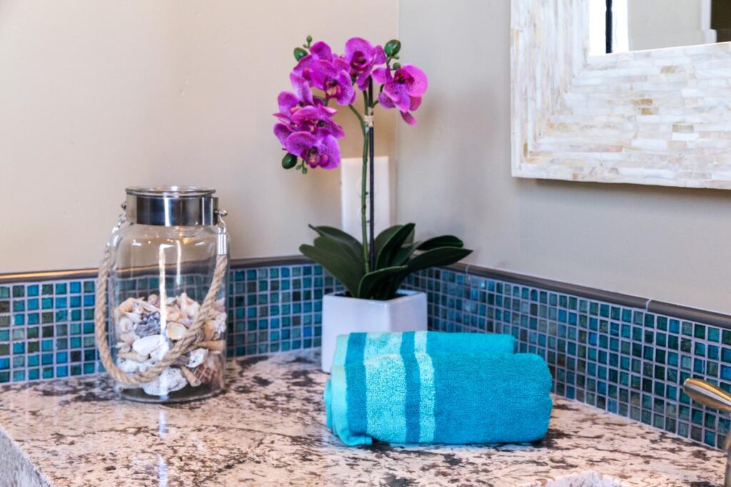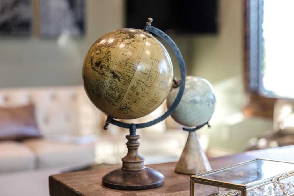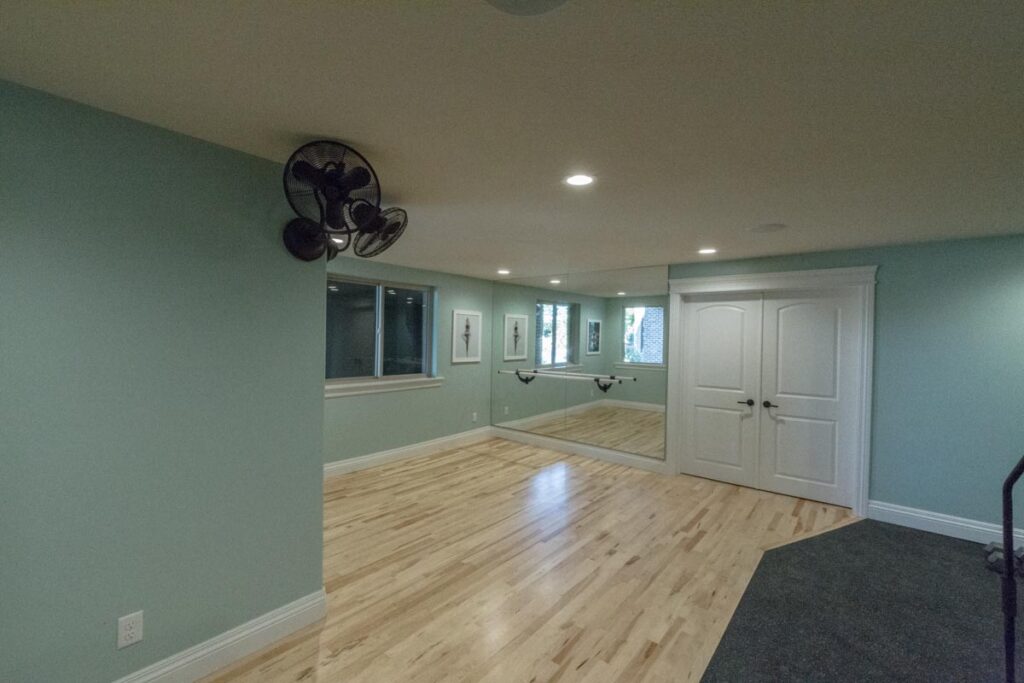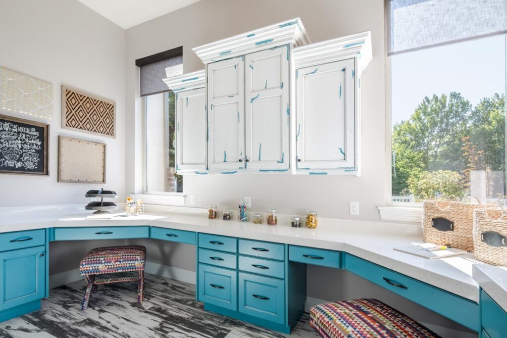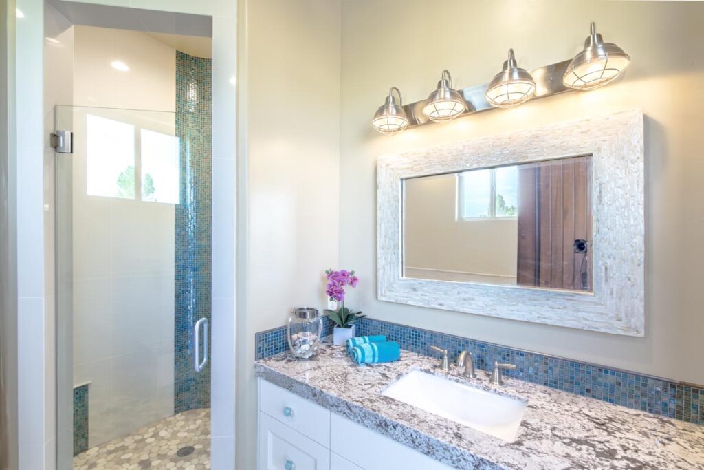 This stone and brick exterior custom home features a gourmet kitchen, dining room with a view, cozy living room, master suite, and large home theatre. The living room has a brick fireplace and vaulted ceiling with exposed wooden beams.
