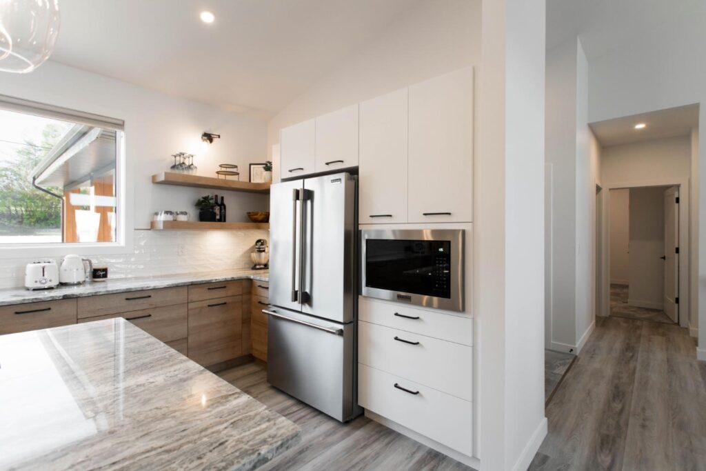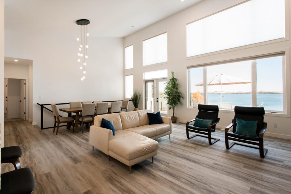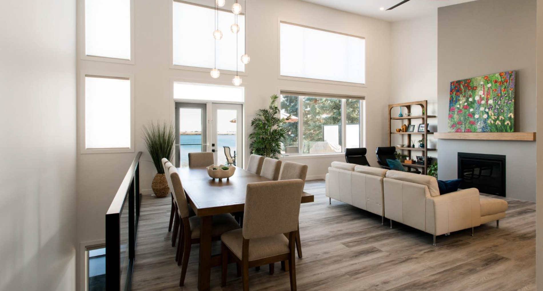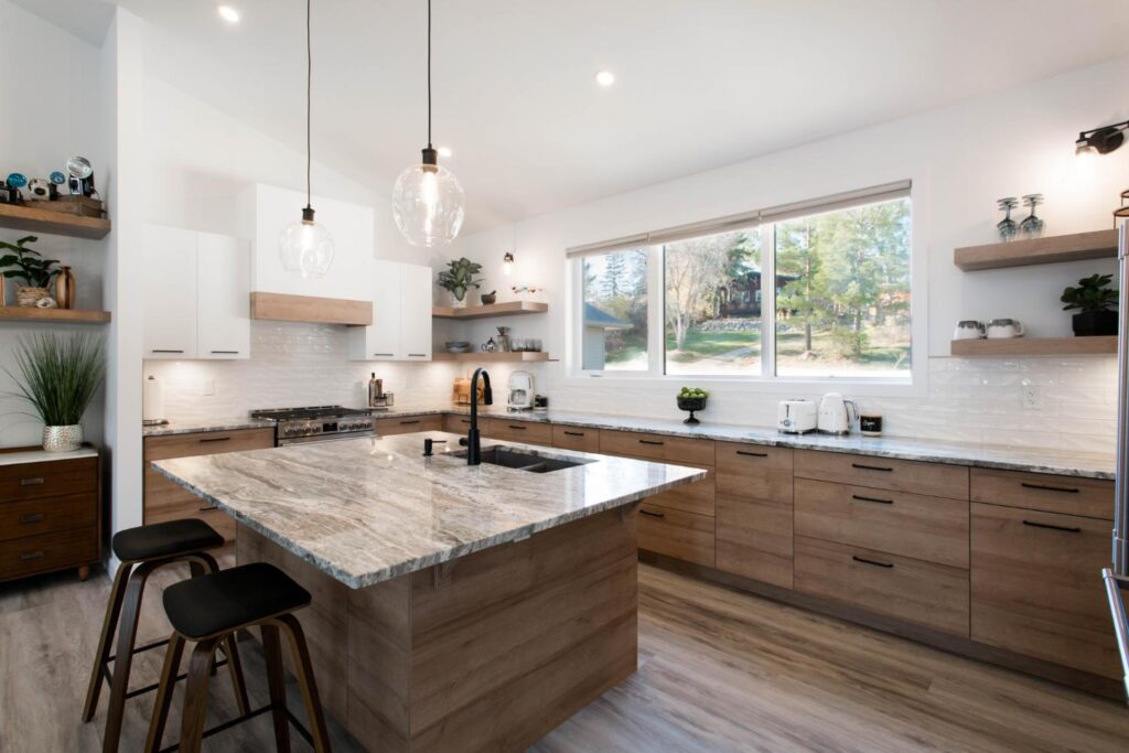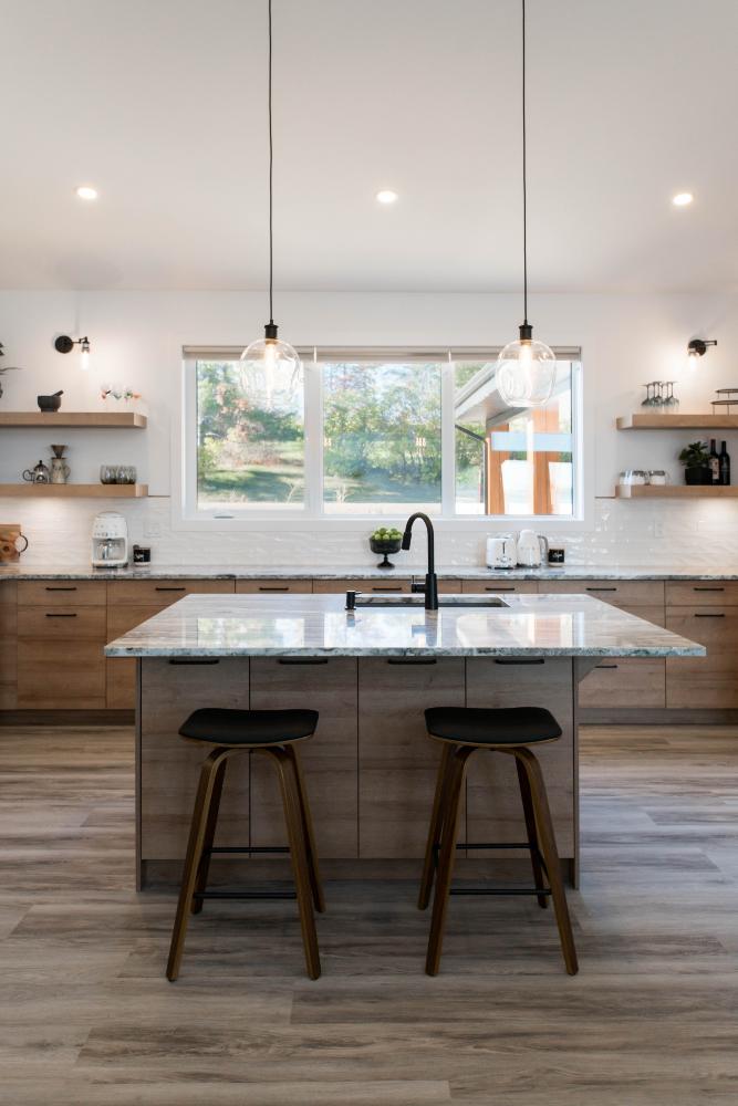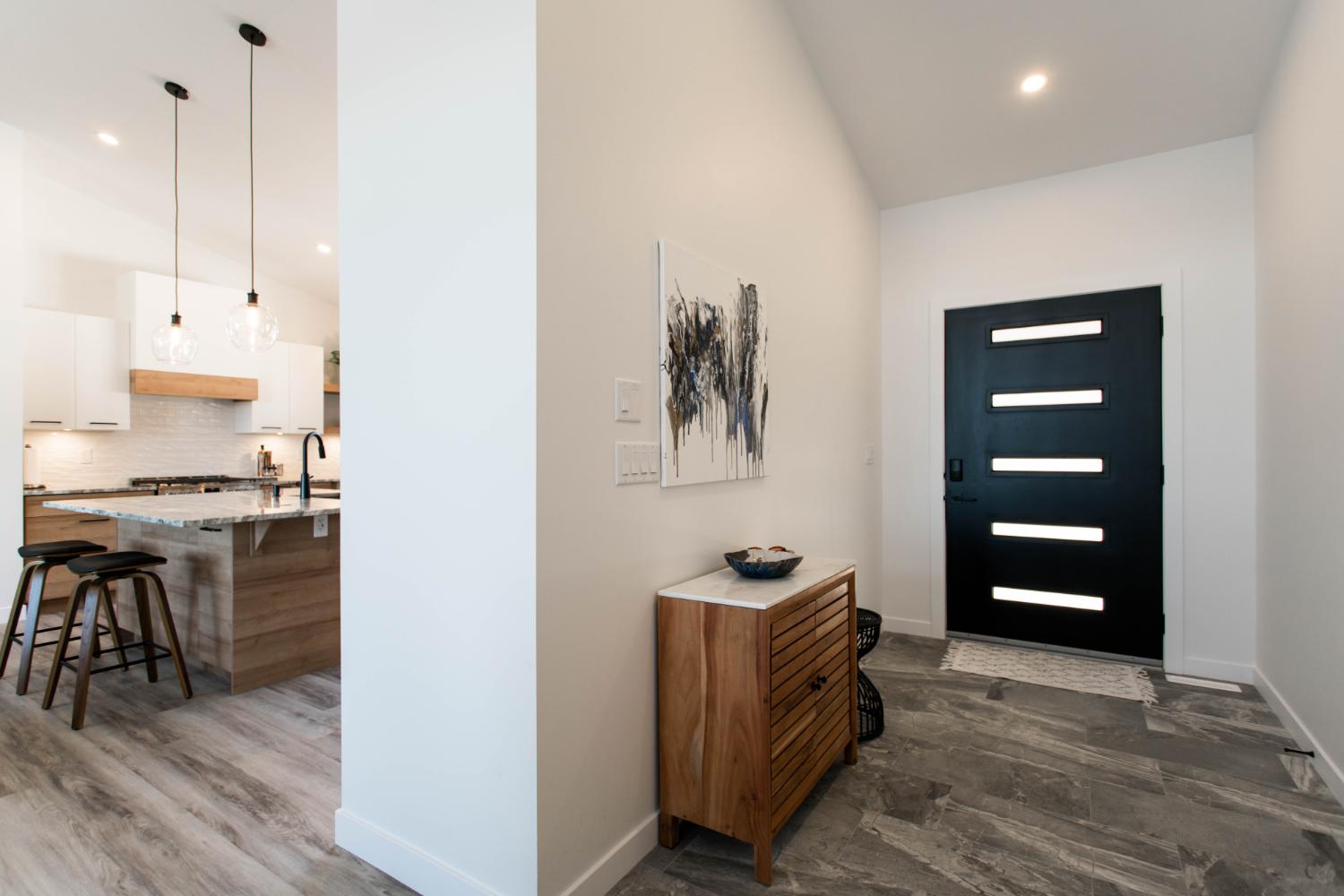 This project started as a meeting to renovate the old home on this lot. The property is on the shores of Balckstrap Lake south of Saskatoon. When it was realized that the home could not be renovated, we moved on to planning a custom home that fits their needs. The client always said that all she wanted was to stand at her island and look out onto the lake. That was accomplished by incorporating large high windows facing the lake which gives some spectacular views of the lake.