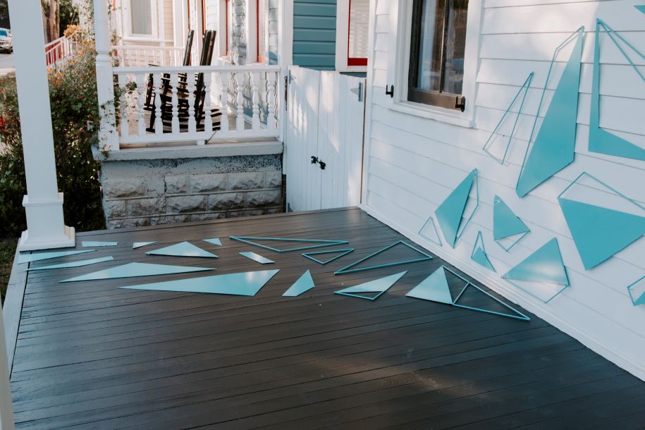 The installation involved many triangles placed all over the exterior walls of our porch. We loved watching the reactions of passersby. The public?s reaction was overwhelmingly positive.