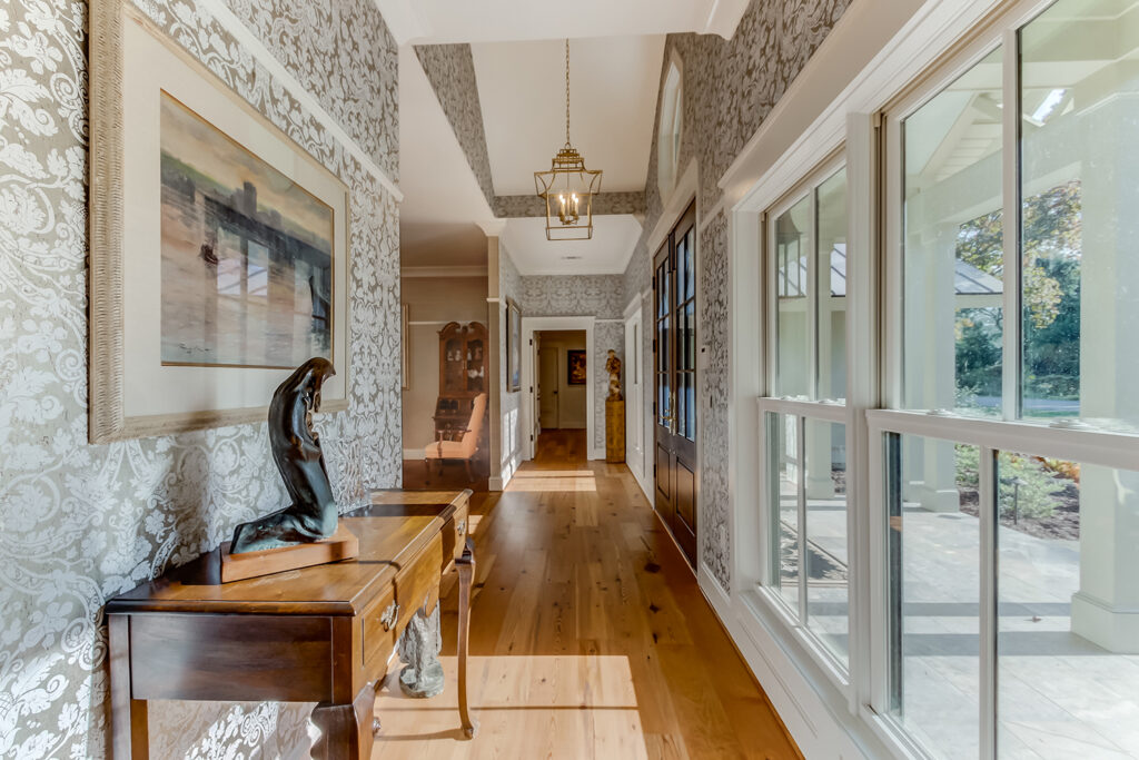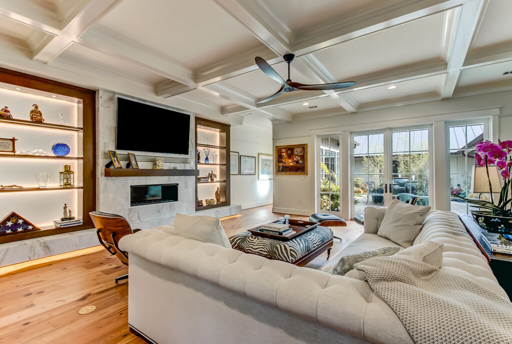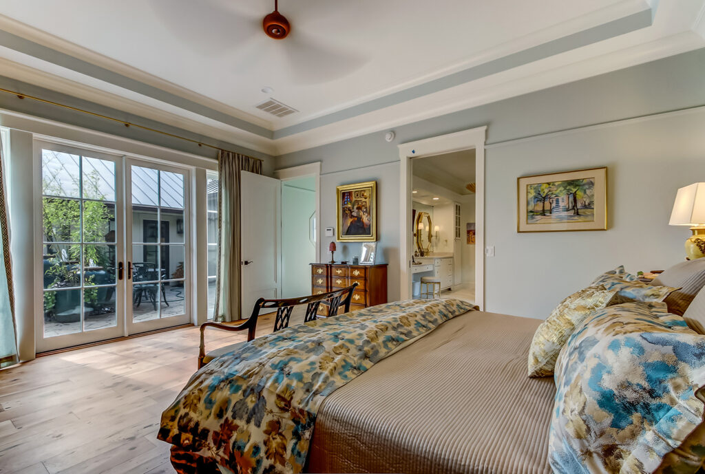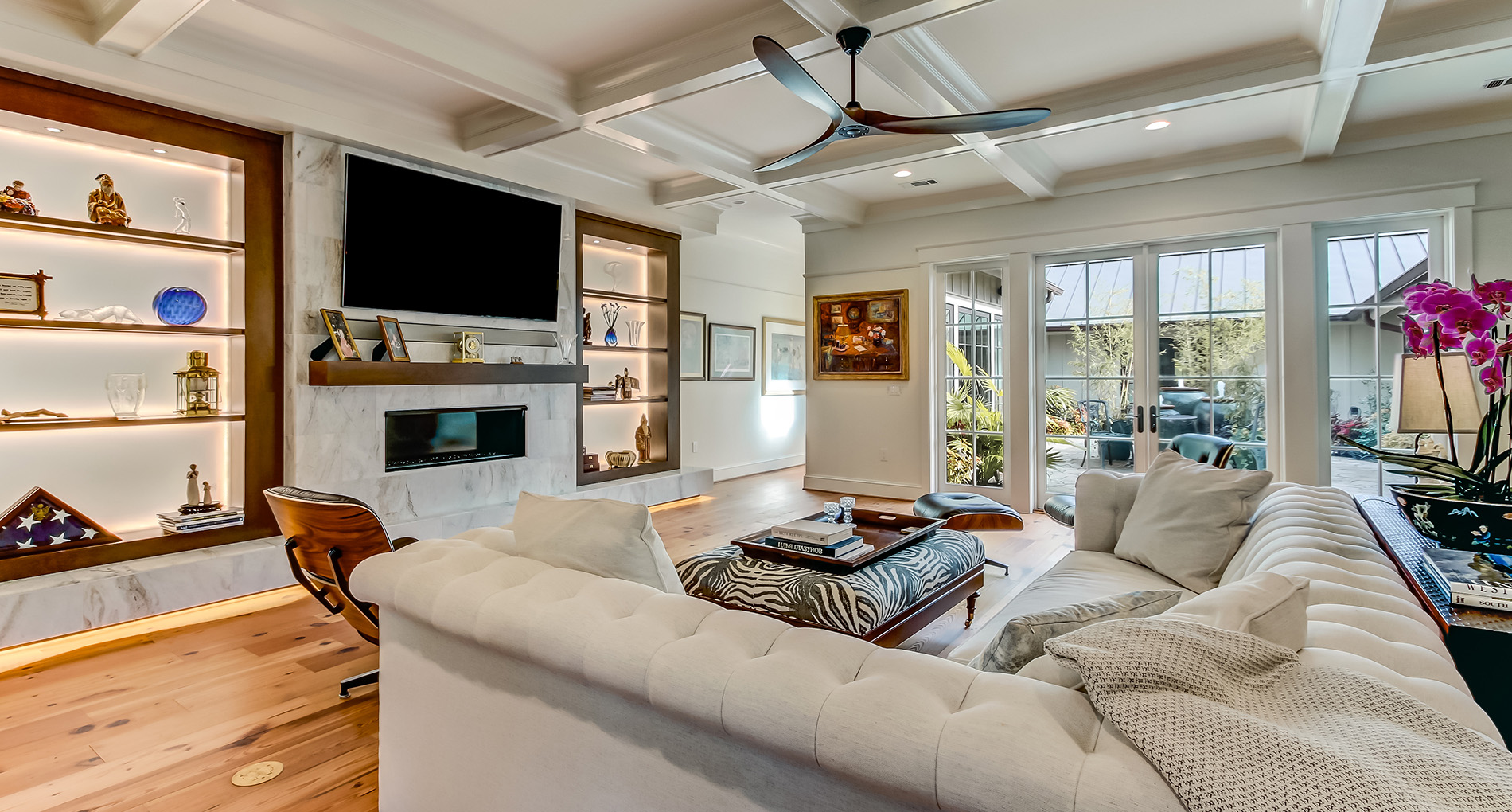 This floor plan includes a central courtyard with doors that open to outdoor spaces from interior living spaces. Features Coffered ceilings, a marble fireplace, and amazing walk-in shower in the master bath.