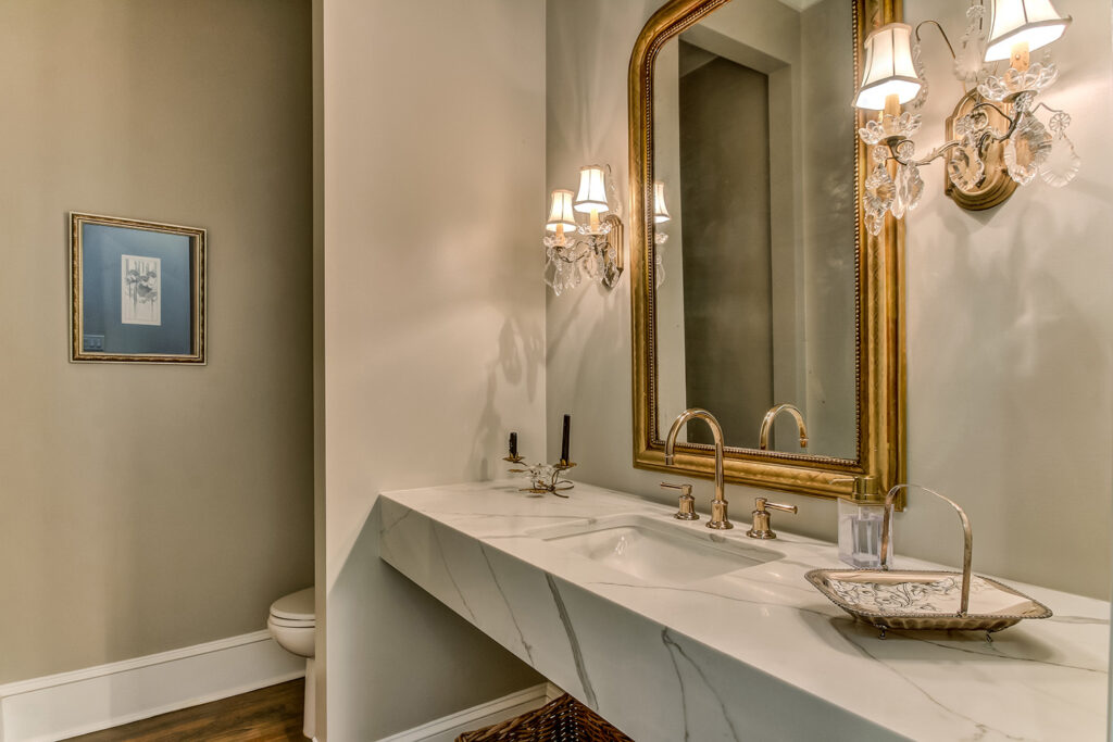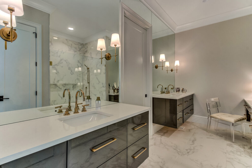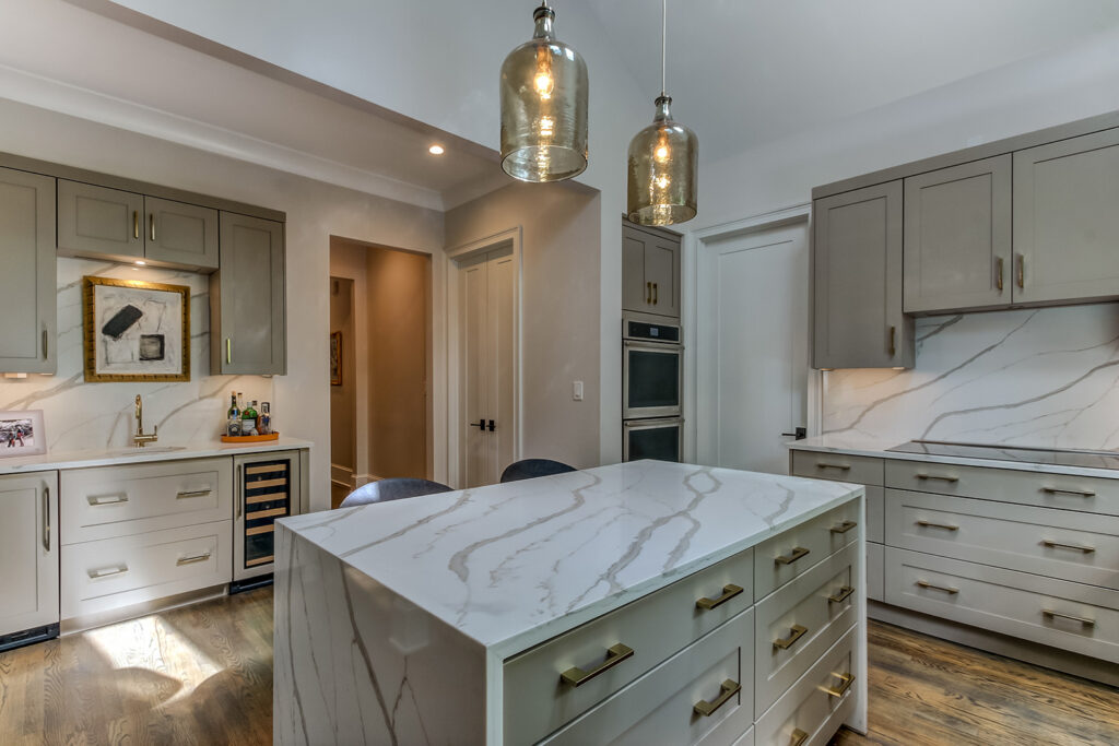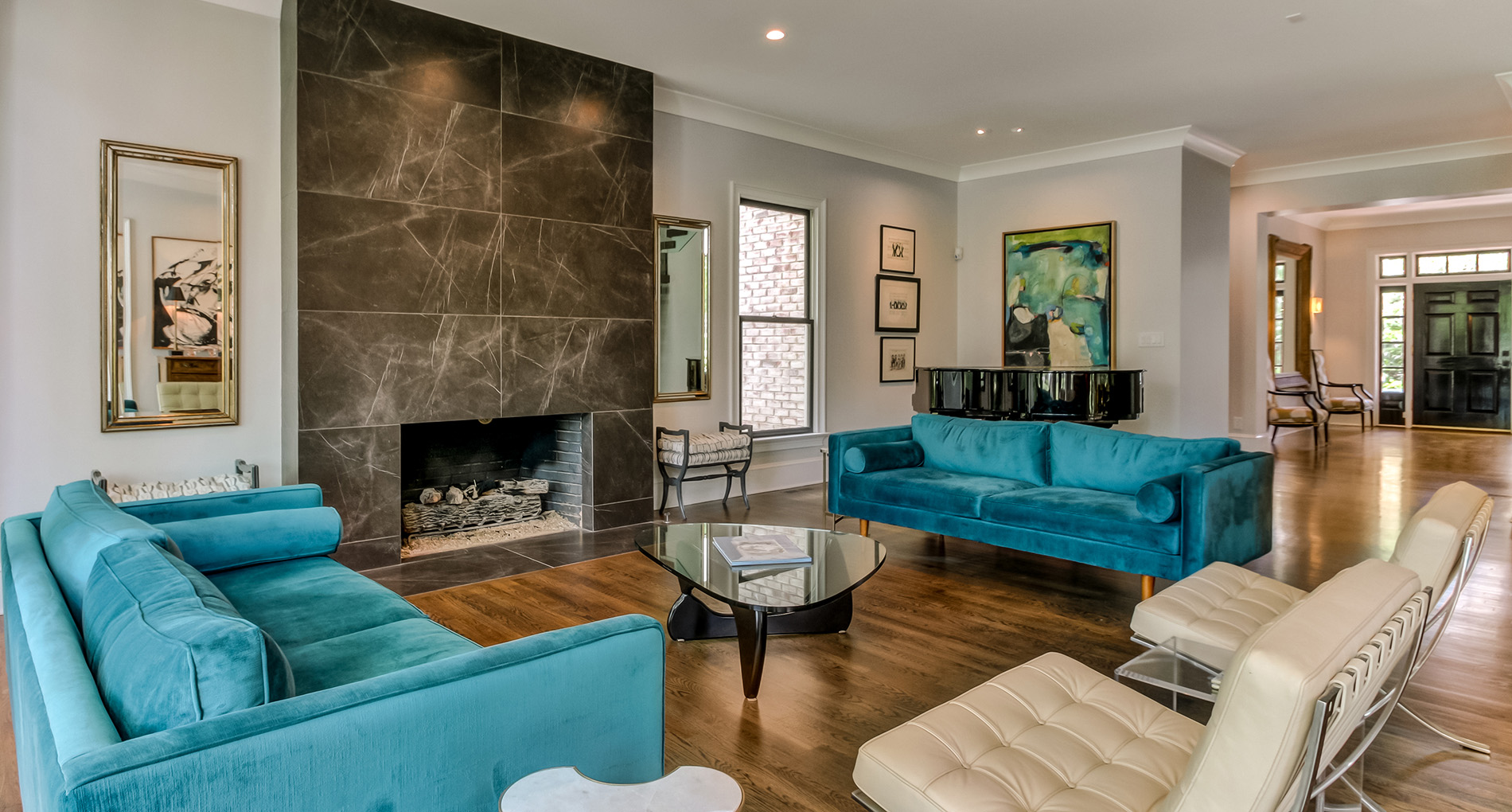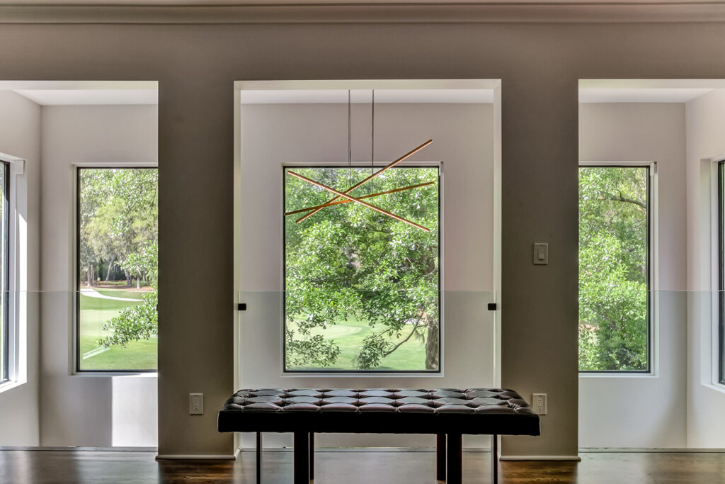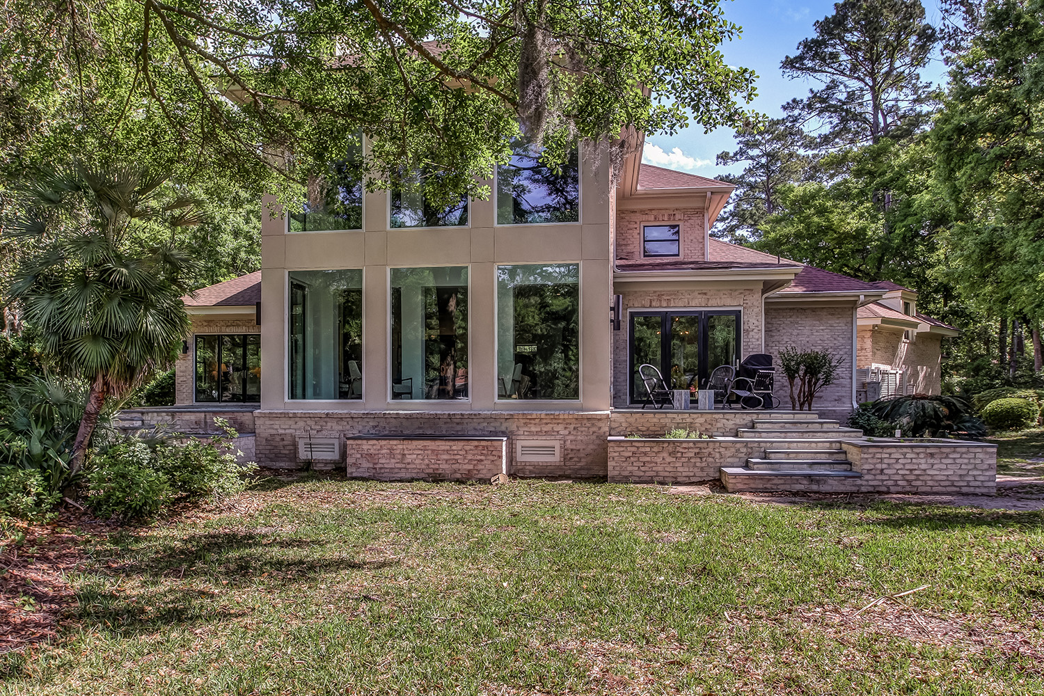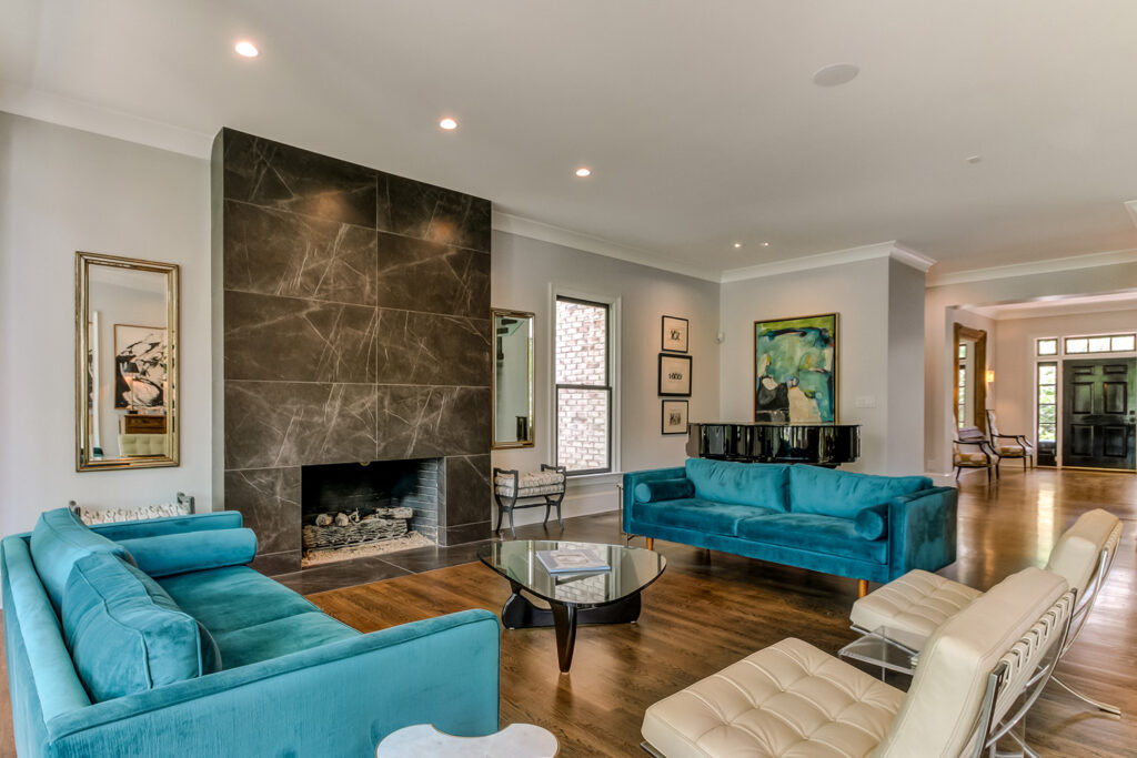 This interior renovation project took a traditional home in The Landings to a mid-century showpiece. There is a beautiful floating staircase as a focal point in the open floor plan. The black marble fireplace surround is a dramatic feature that spans both levels of this home. A folding door in the eating nook allows for easy access to the terraced back patio and two story sunroom provides great natural light in the living spaces of the home. A hidden door in the hall closet allows access to the technology of the home.