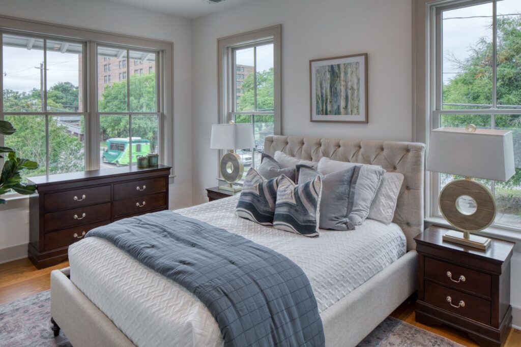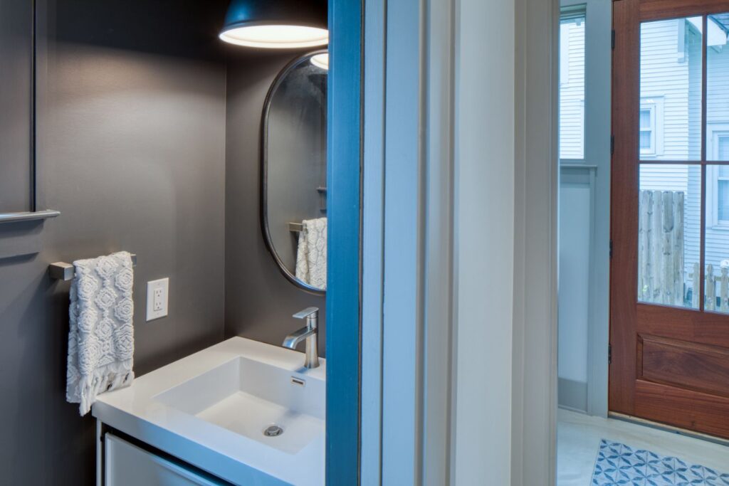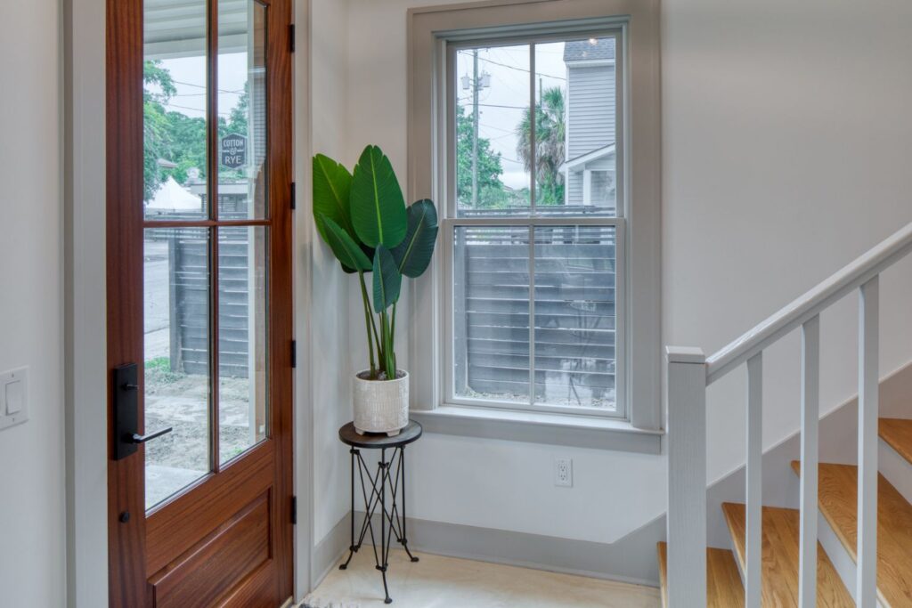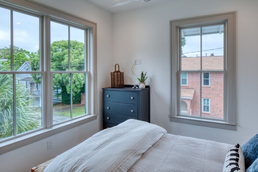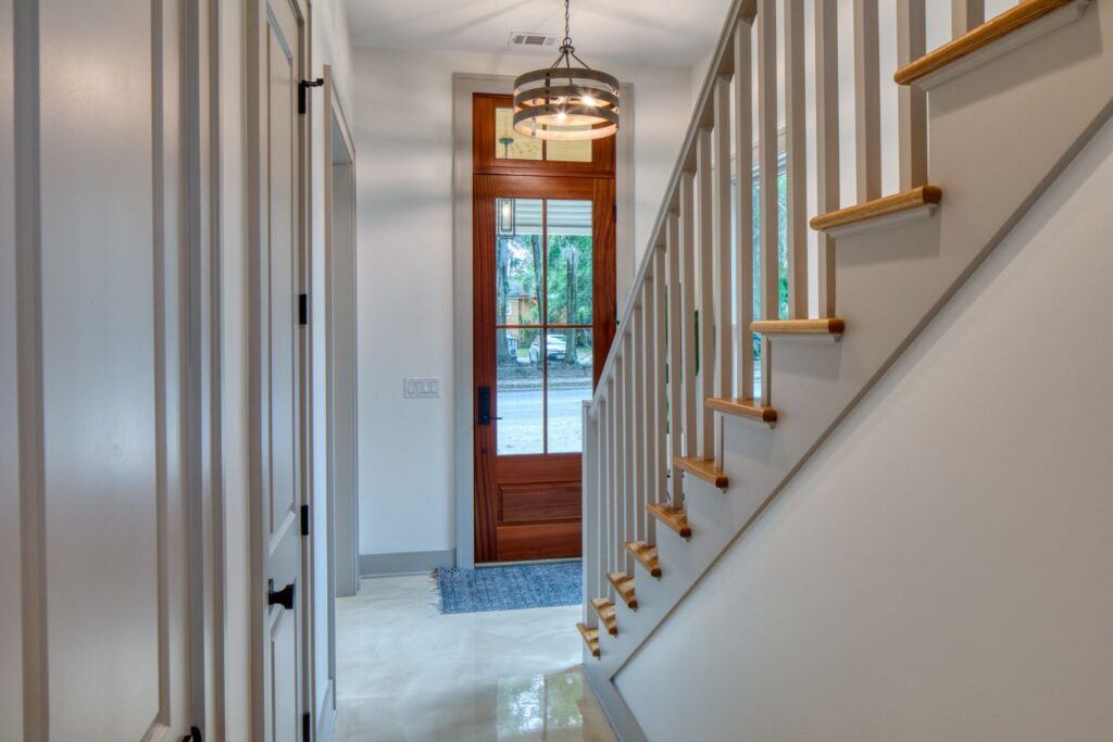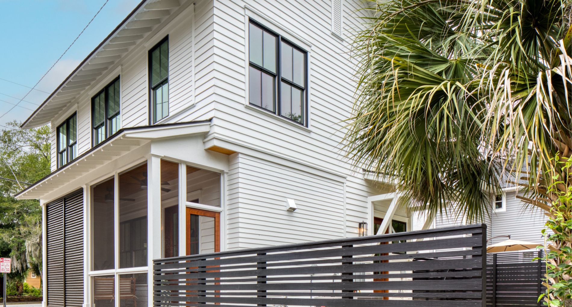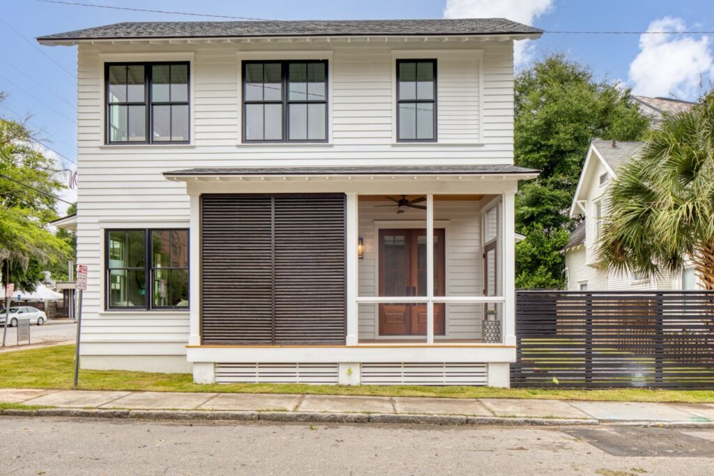 This three-bedroom, 2.5 bedroom home was built in the historic district of Thomas Square. The architect, Josh Ward, of ward preservation + architecture, referenced a neighbor’s home to make this infill home fit in with the scale of the neighborhood while still giving it is own modern feeling. The exterior uses James Hardie Artisan siding to get a clean-metered edge on the corners which gives the home a contemporary look. The black and white palette are modern without being stark. The interior features polished concrete floors on the first floor, white oak floors on the second floor, funky tiles and fun lighting fixtures.