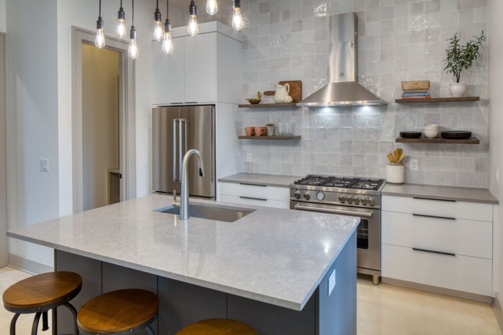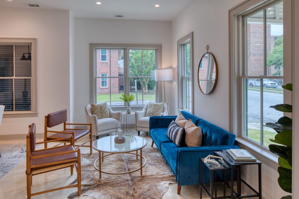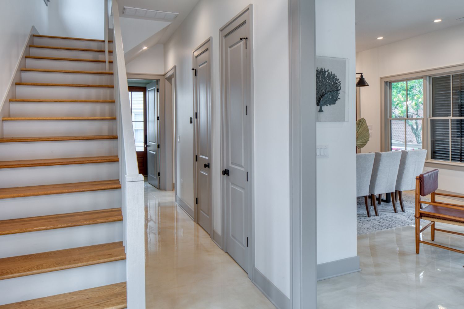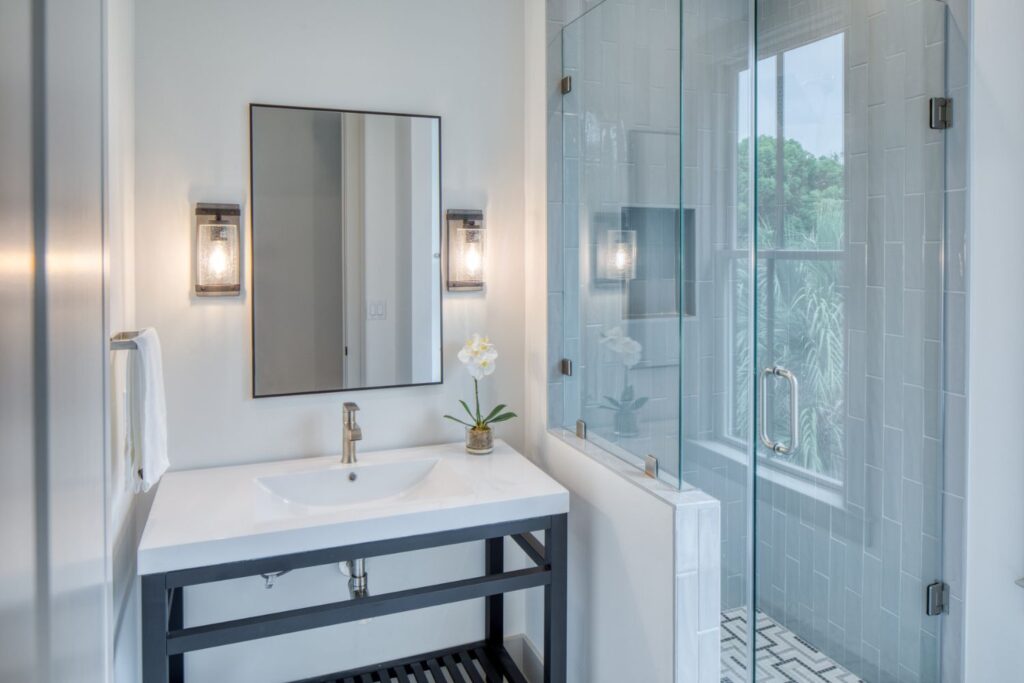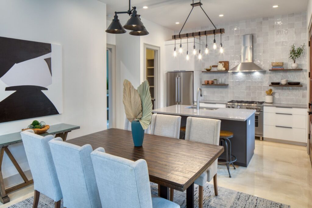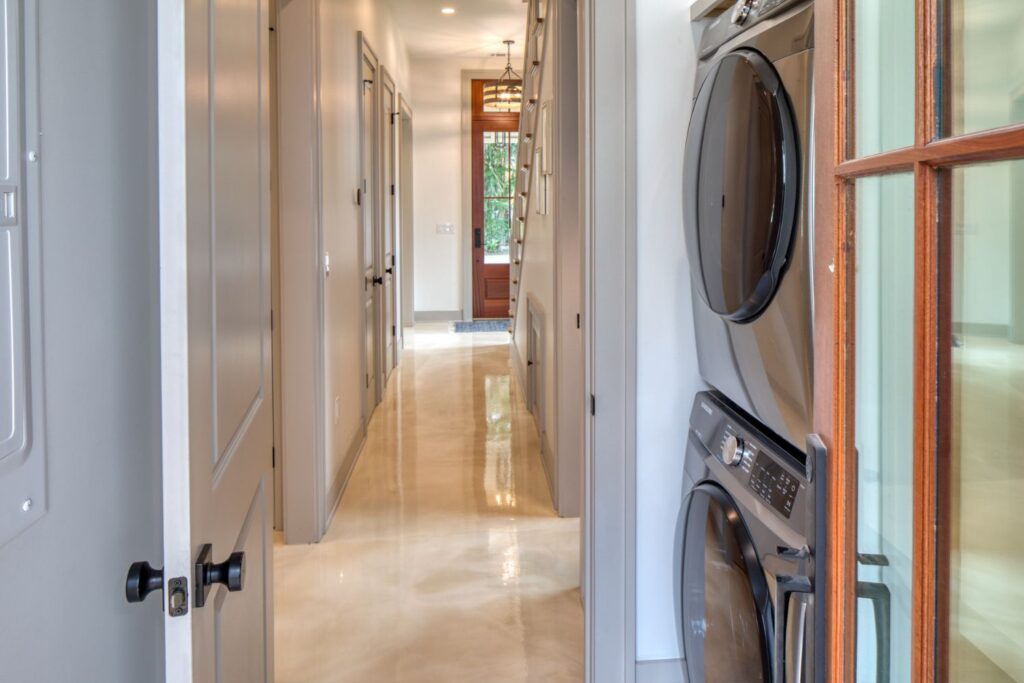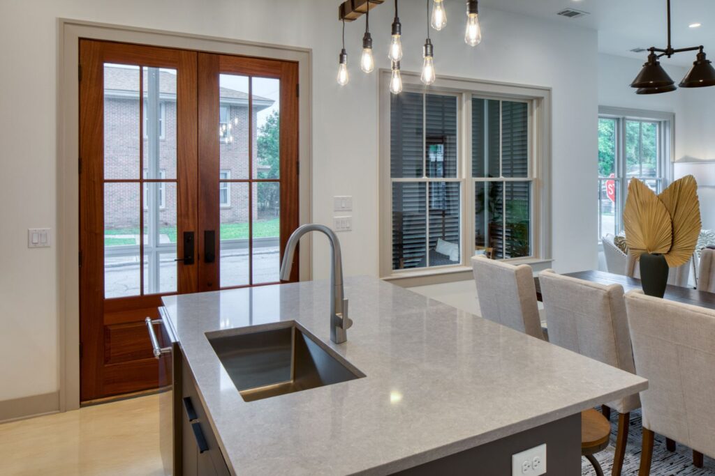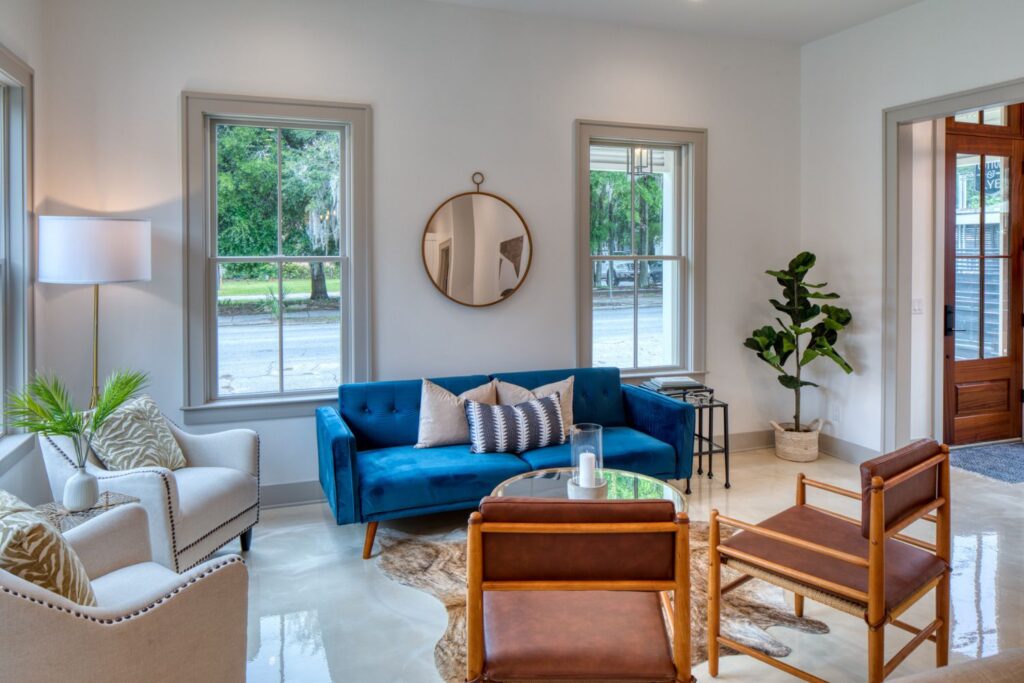 This three-bedroom, 2.5 bedroom home was built in the historic district of Thomas Square. The architect, Josh Ward, of ward preservation + architecture, referenced a neighbor’s home to make this infill home fit in with the scale of the neighborhood while still giving it is own modern feeling. The exterior uses James Hardie Artisan siding to get a clean-metered edge on the corners which gives the home a contemporary look. The black and white palette are modern without being stark. The interior features polished concrete floors on the first floor, white oak floors on the second floor, funky tiles and fun lighting fixtures.