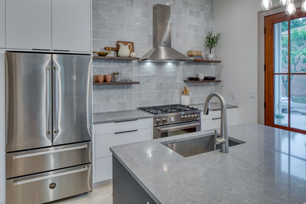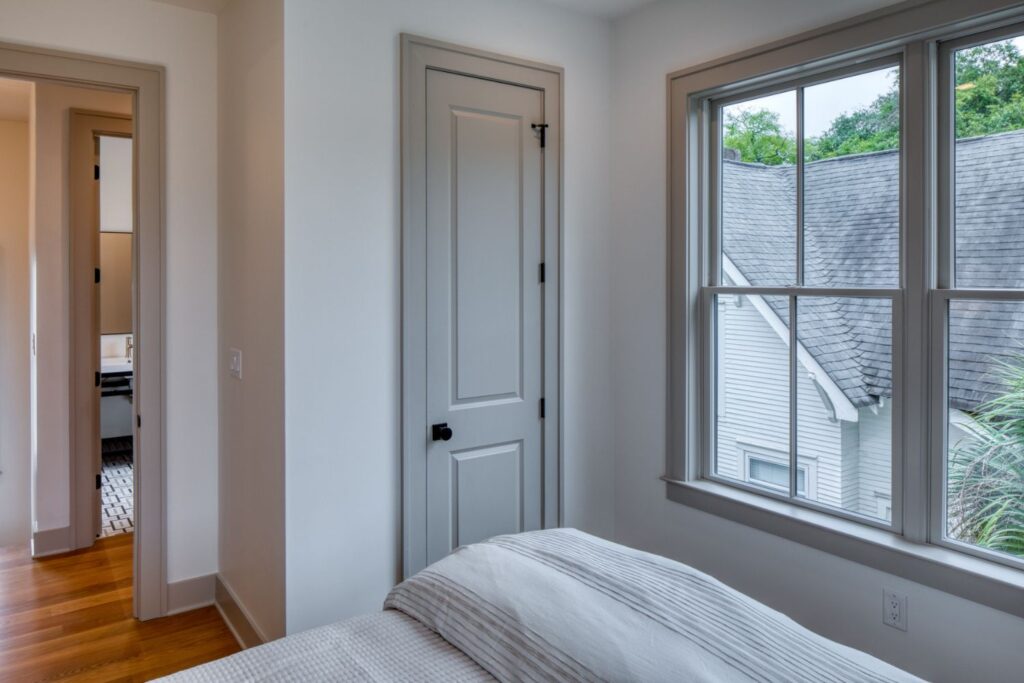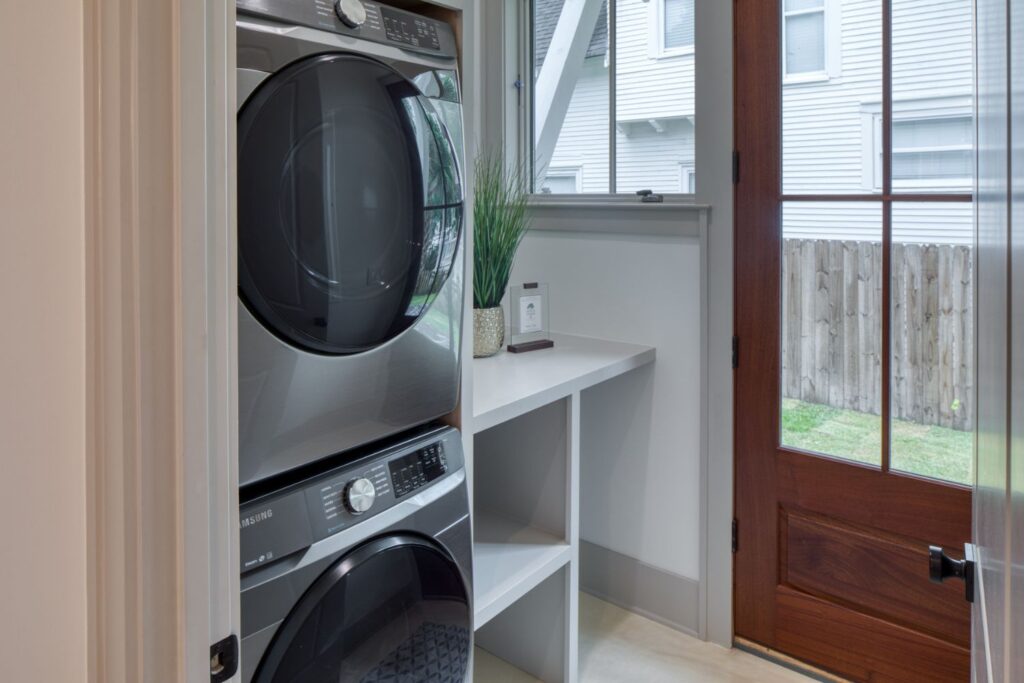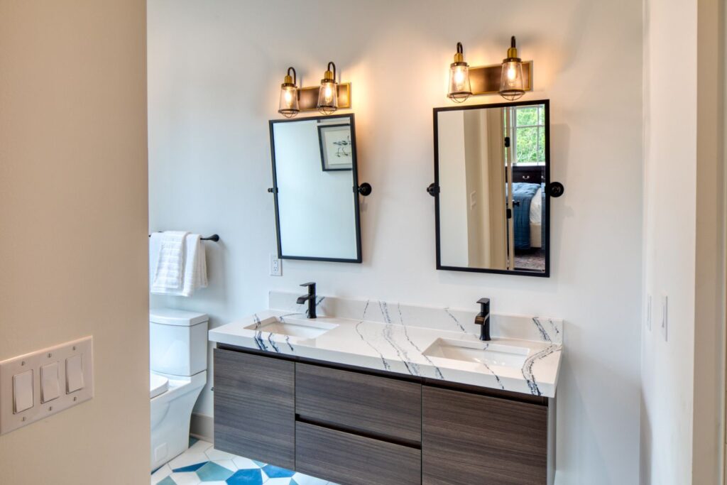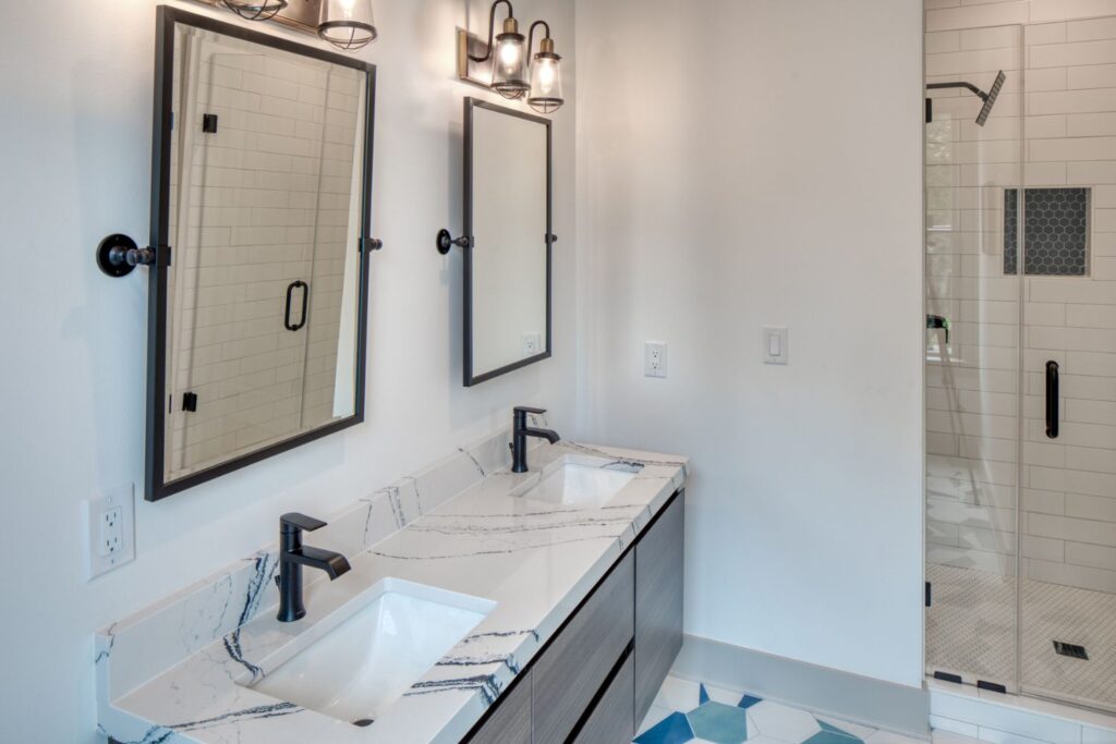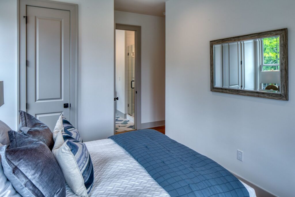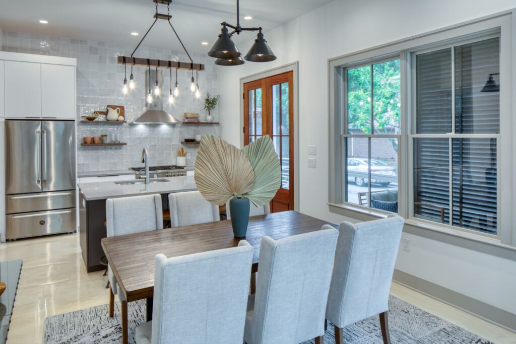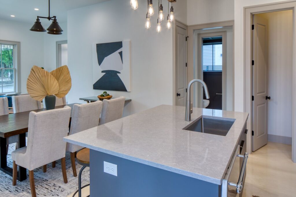 This three-bedroom, 2.5 bedroom home was built in the historic district of Thomas Square. The architect, Josh Ward, of ward preservation + architecture, referenced a neighbor’s home to make this infill home fit in with the scale of the neighborhood while still giving it is own modern feeling. The exterior uses James Hardie Artisan siding to get a clean-metered edge on the corners which gives the home a contemporary look. The black and white palette are modern without being stark. The interior features polished concrete floors on the first floor, white oak floors on the second floor, funky tiles and fun lighting fixtures.