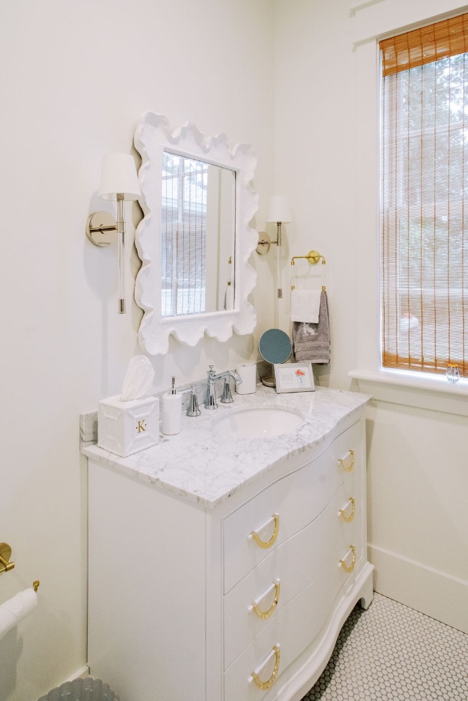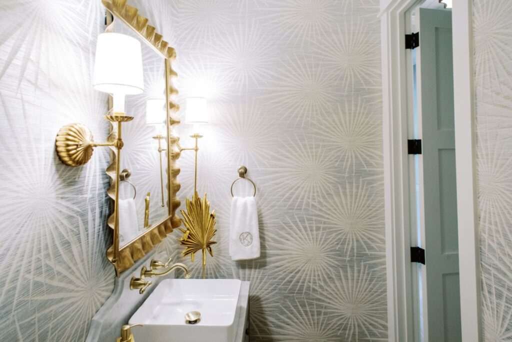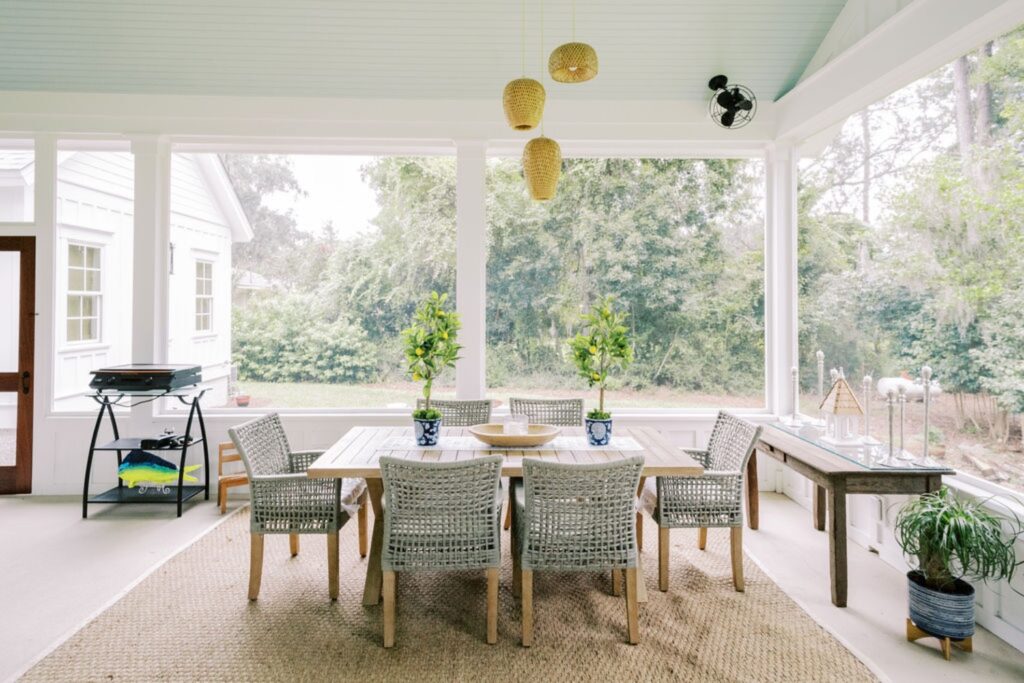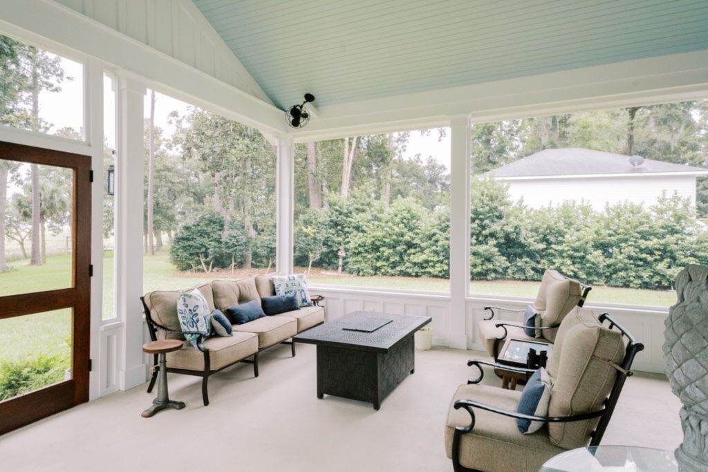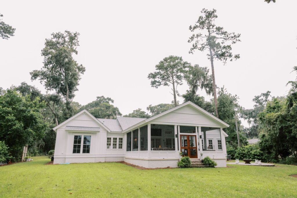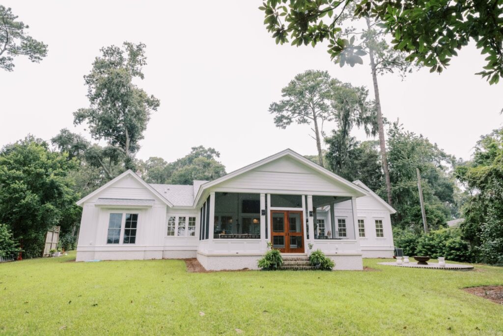 Home features an open concept kitchen, dining and living room with soaring ceilings and cypress wrapped beams. The fireplace creates a focal point in the living room. A generous screened in back porch features a separate living and dining area along with a porch swing to take in the beautiful marsh views. The exterior features board + batten siding with shutter details. There are fun cupolas on the roofline to add personality. The guest quarters feature their own en suite bathroom. The primary suite has his + hers walk in closets, large walk in shower, double vanity with separate vanity area. The powder room features funky details, a wall mounted faucet and low country inspired wall paper. The separate laundry room also features extra storage. The wallpaper, millwork details and tongue and groove walls give the space a luxe finish.