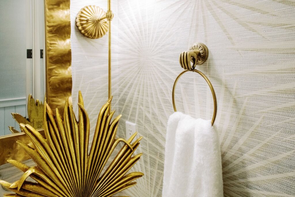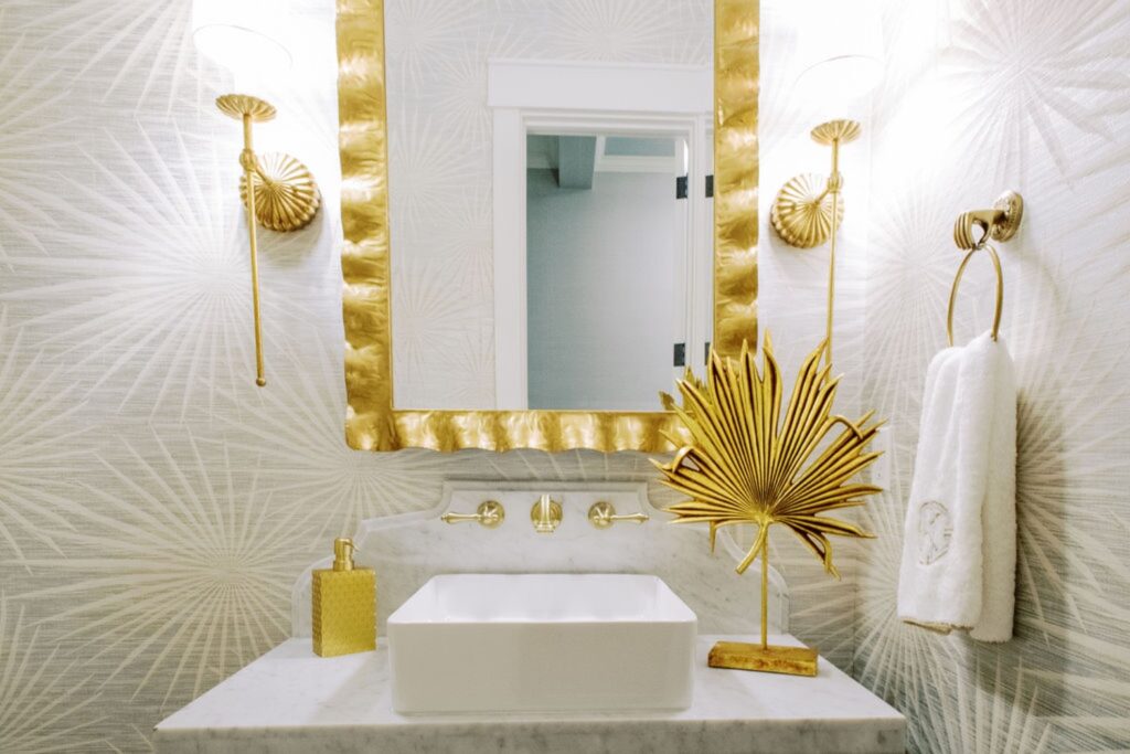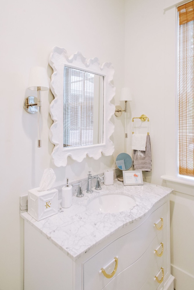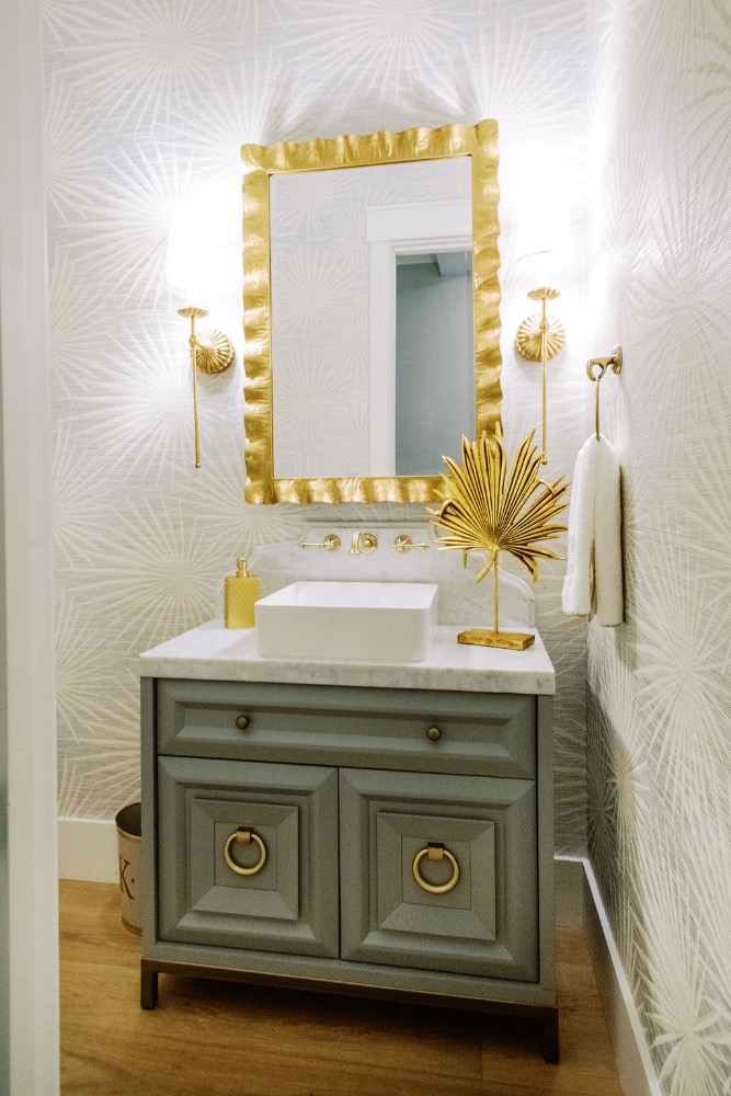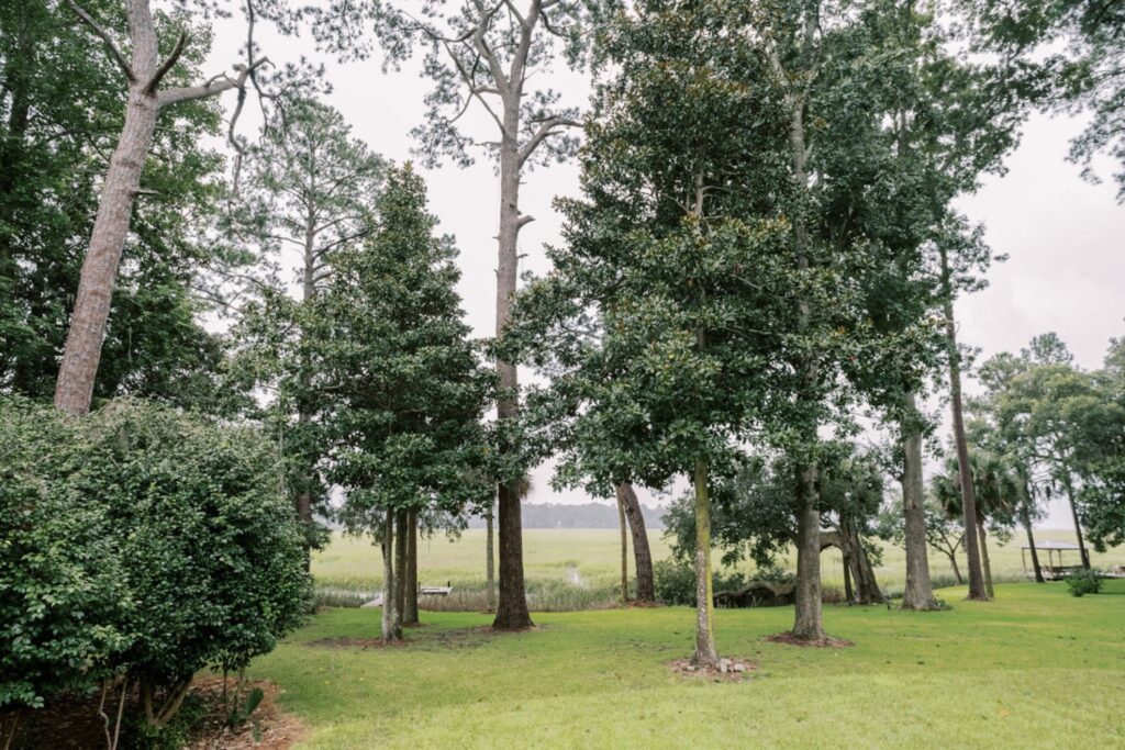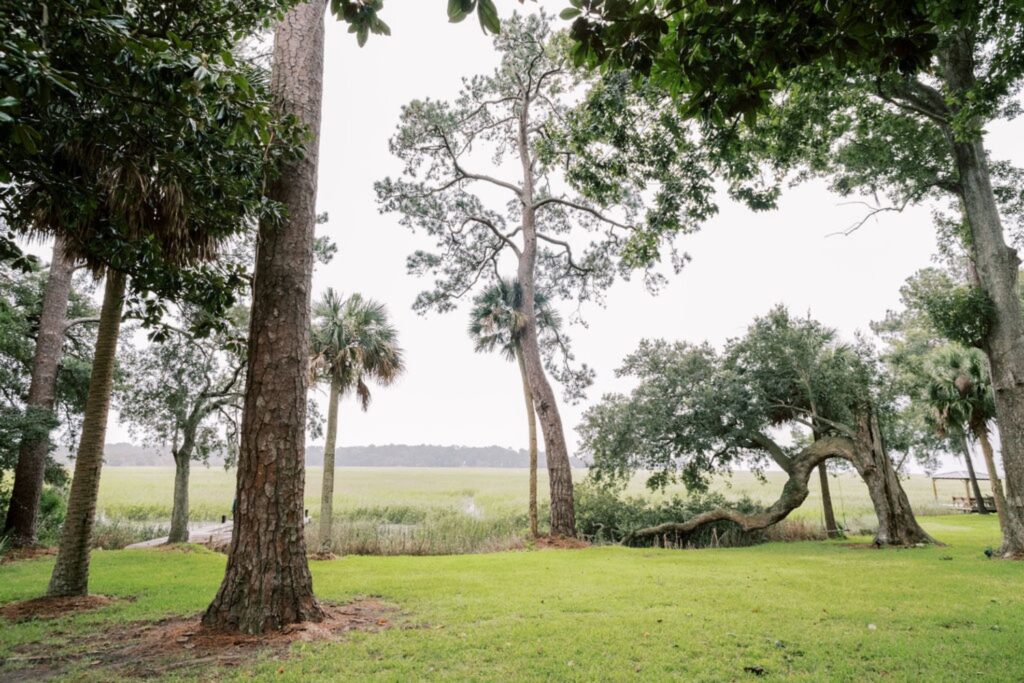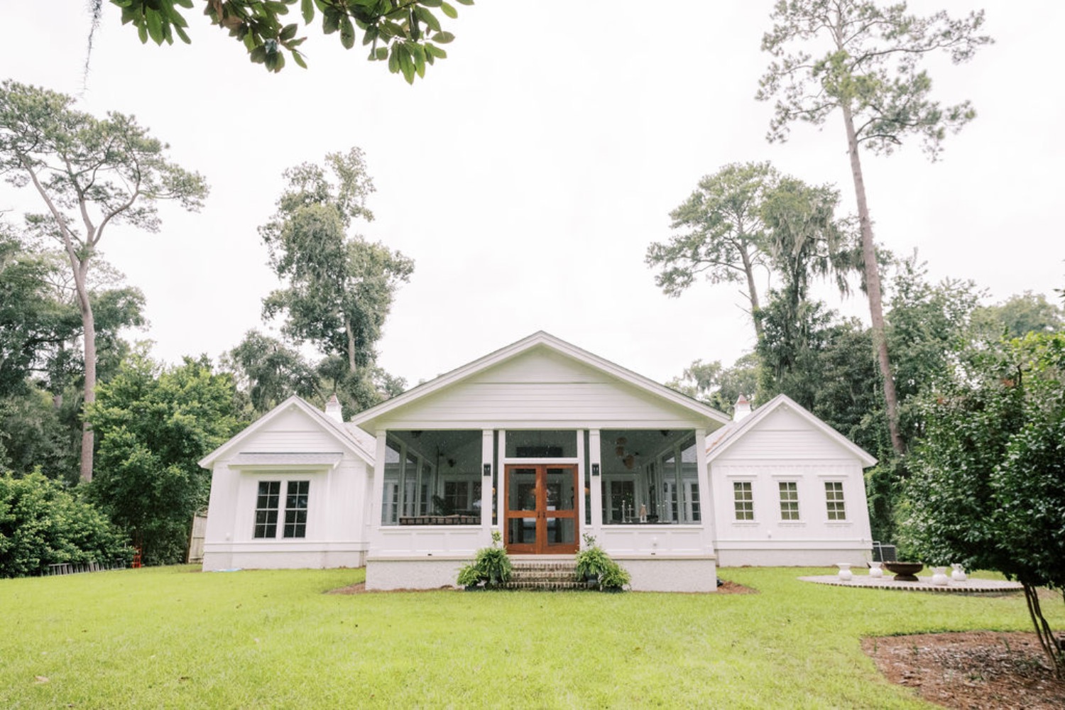 Home features an open concept kitchen, dining and living room with soaring ceilings and cypress wrapped beams. The fireplace creates a focal point in the living room. A generous screened in back porch features a separate living and dining area along with a porch swing to take in the beautiful marsh views. The exterior features board + batten siding with shutter details. There are fun cupolas on the roofline to add personality. The guest quarters feature their own en suite bathroom. The primary suite has his + hers walk in closets, large walk in shower, double vanity with separate vanity area. The powder room features funky details, a wall mounted faucet and low country inspired wall paper. The separate laundry room also features extra storage. The wallpaper, millwork details and tongue and groove walls give the space a luxe finish.
