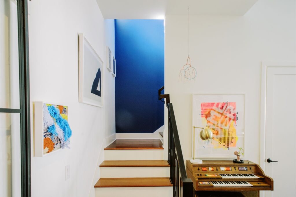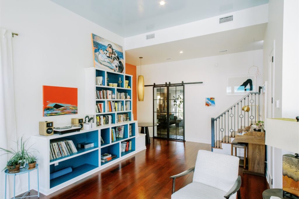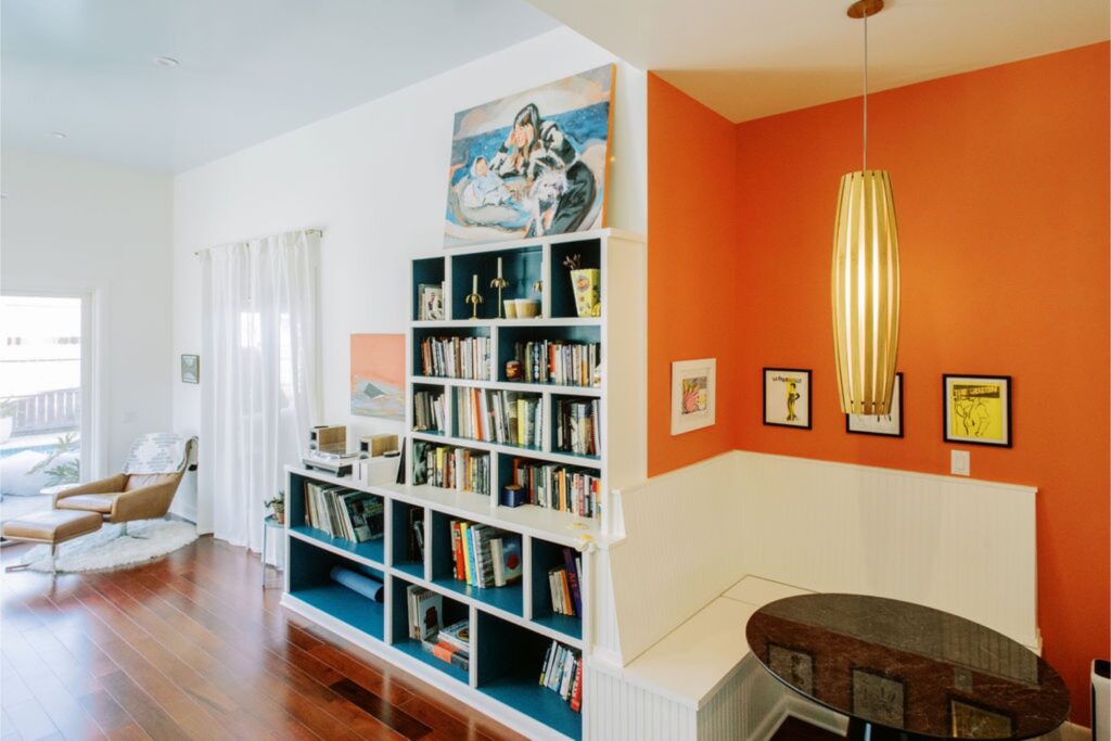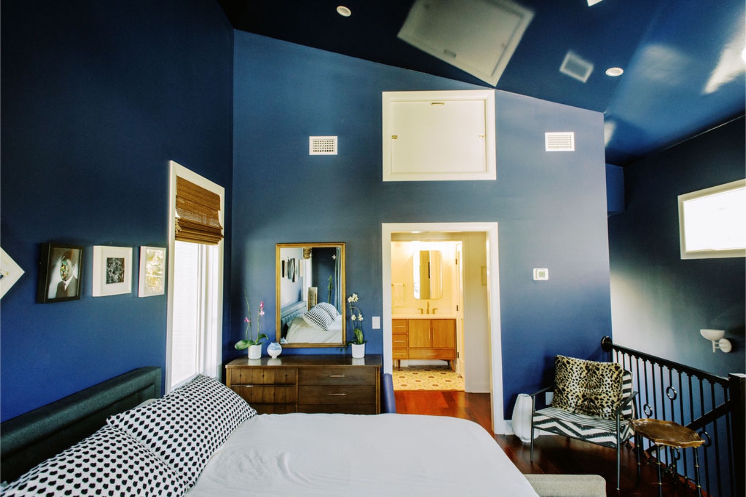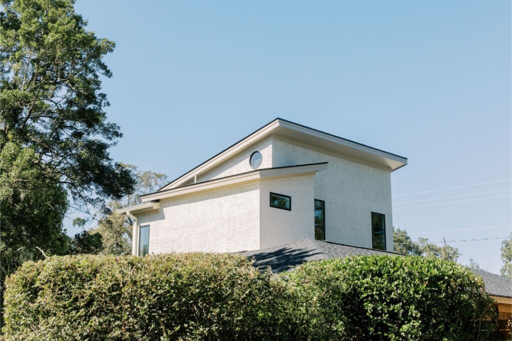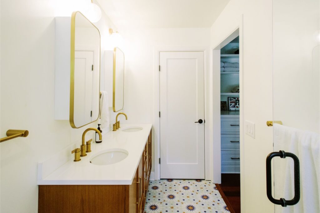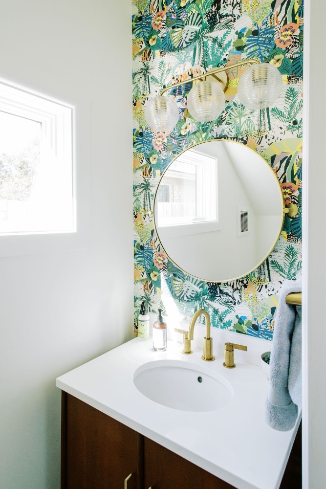 This addition featured mid-century lines and styling for the space. We matched the texture of the new addition stucco to the existing home. The roofline and circular window seen from street provide an intriguing elevation. The interior features a breakfast nook, built ins for the owners record player and collection, a living space drenched in light with doors that open to the newly refreshed pool deck and pool. The homeowner made a statement in the main floor powder room with eclectic wallpaper and mid-century inspired vanity and accessories. The upstairs features a primary suite color-drenched with a deep ocean blue. Large windows provide ample light in the space and the tall ceilings offer an airy feeling to the space. The primary closet includes custom cabinetry built onsite. The bathroom includes printed floor tile and a mid-mod inspired vanity.