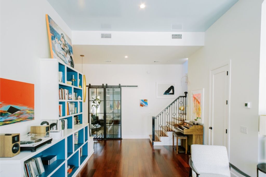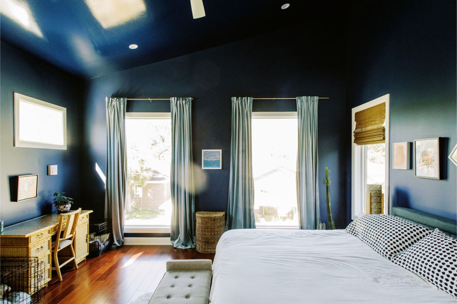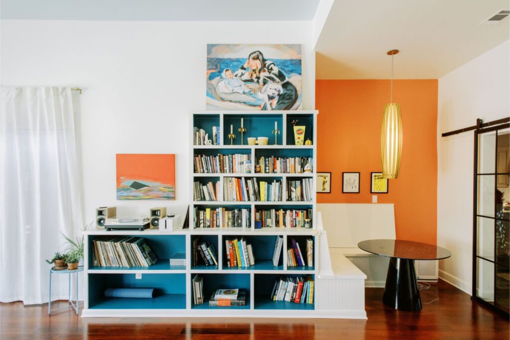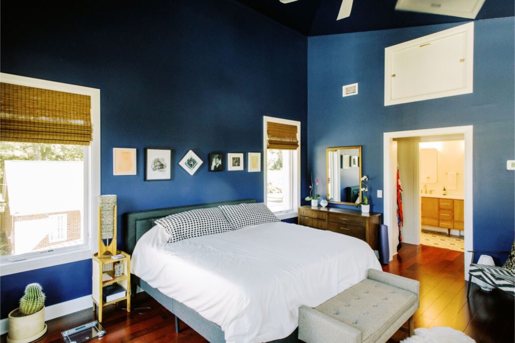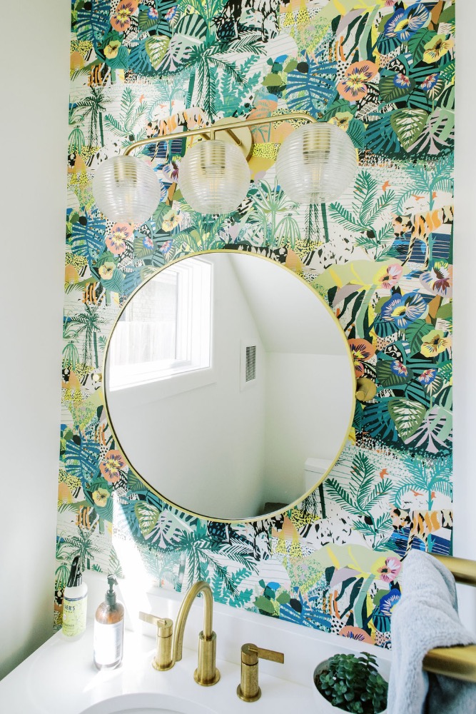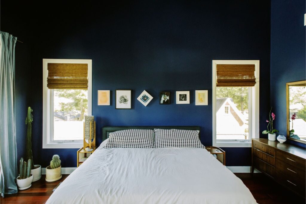 This addition featured mid-century lines and styling for the space. We matched the texture of the new addition stucco to the existing home. The roofline and circular window seen from street provide an intriguing elevation. The interior features a breakfast nook, built ins for the owners record player and collection, a living space drenched in light with doors that open to the newly refreshed pool deck and pool. The homeowner made a statement in the main floor powder room with eclectic wallpaper and mid-century inspired vanity and accessories. The upstairs features a primary suite color-drenched with a deep ocean blue. Large windows provide ample light in the space and the tall ceilings offer an airy feeling to the space. The primary closet includes custom cabinetry built onsite. The bathroom includes printed floor tile and a mid-mod inspired vanity.