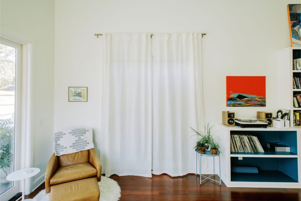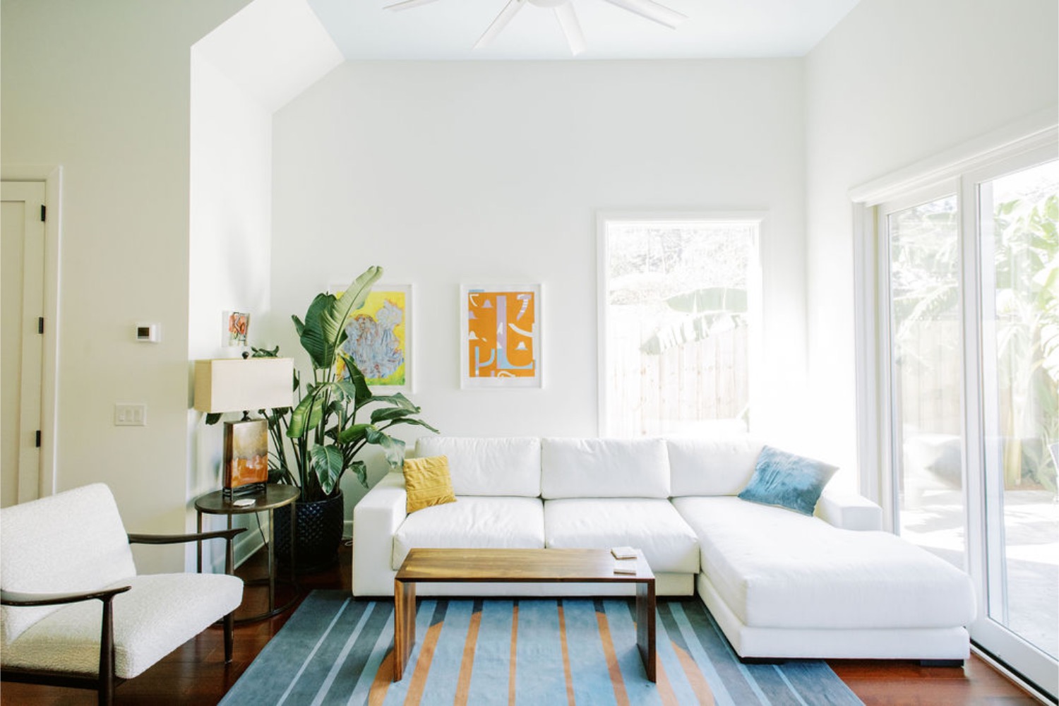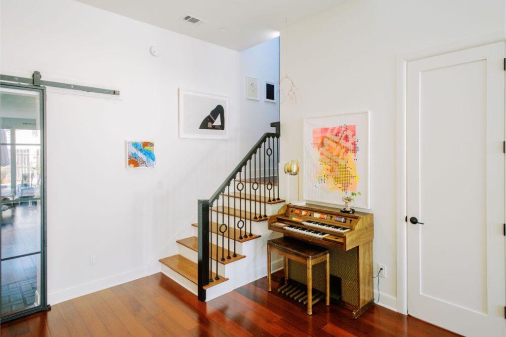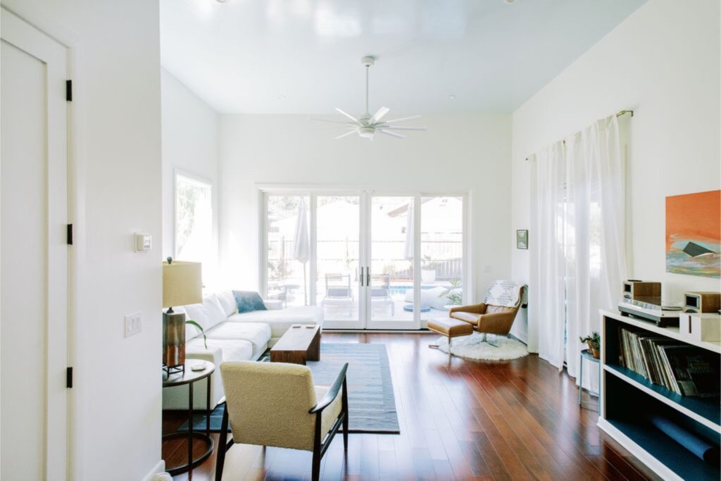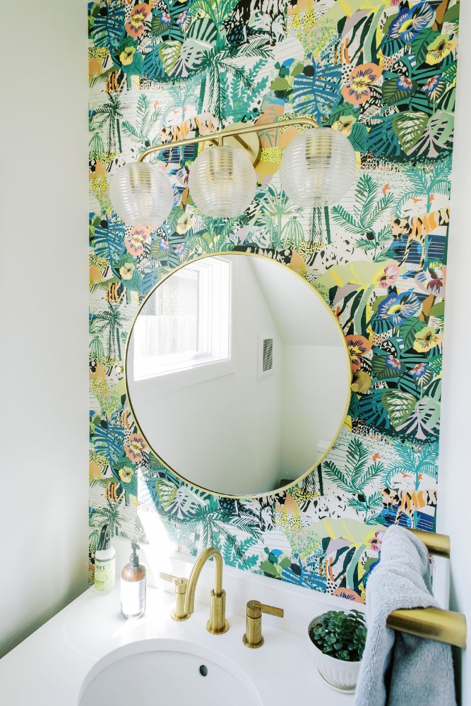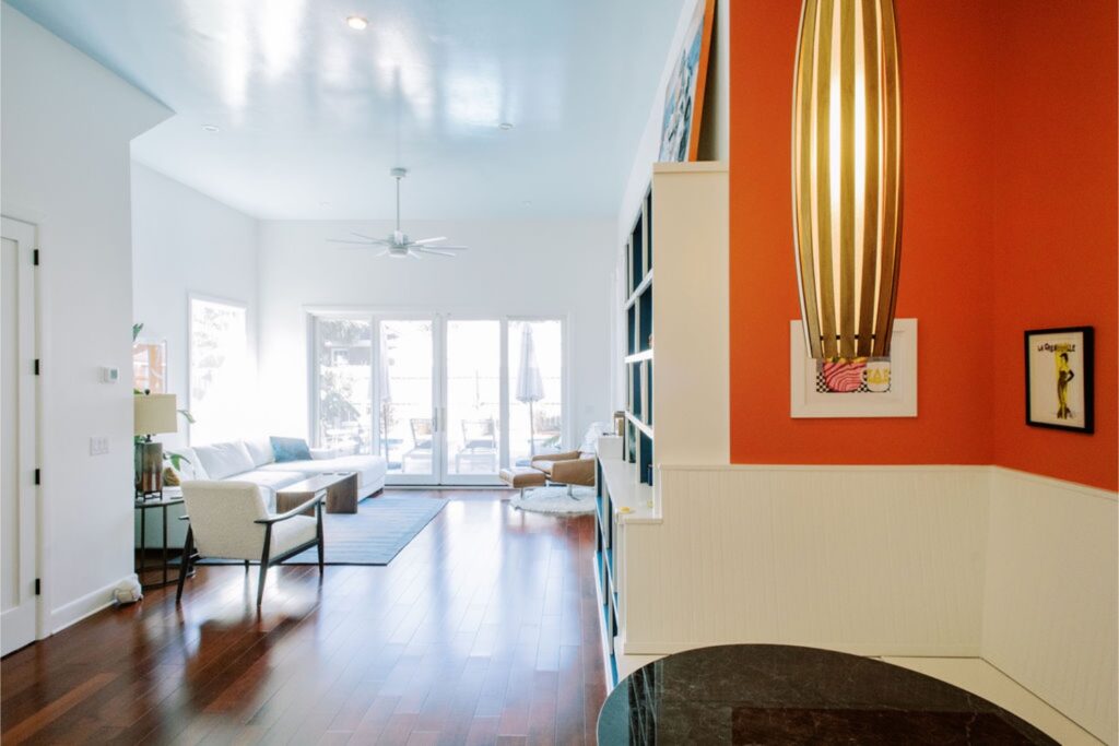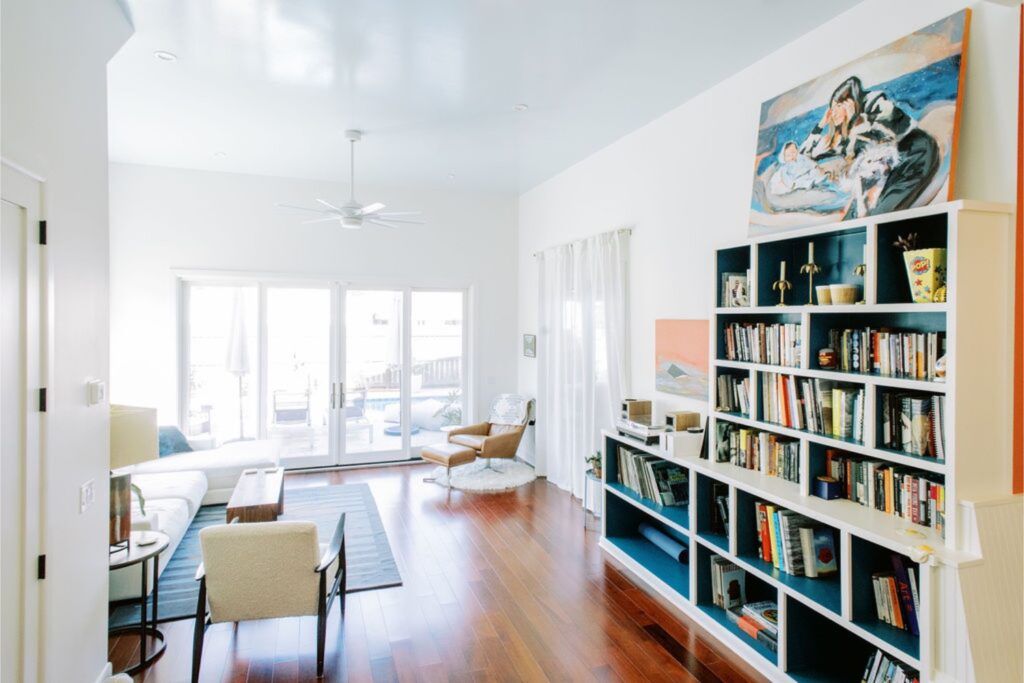 This addition featured mid-century lines and styling for the space. We matched the texture of the new addition stucco to the existing home. The roofline and circular window seen from street provide an intriguing elevation. The interior features a breakfast nook, built ins for the owners record player and collection, a living space drenched in light with doors that open to the newly refreshed pool deck and pool. The homeowner made a statement in the main floor powder room with eclectic wallpaper and mid-century inspired vanity and accessories. The upstairs features a primary suite color-drenched with a deep ocean blue. Large windows provide ample light in the space and the tall ceilings offer an airy feeling to the space. The primary closet includes custom cabinetry built onsite. The bathroom includes printed floor tile and a mid-mod inspired vanity.
