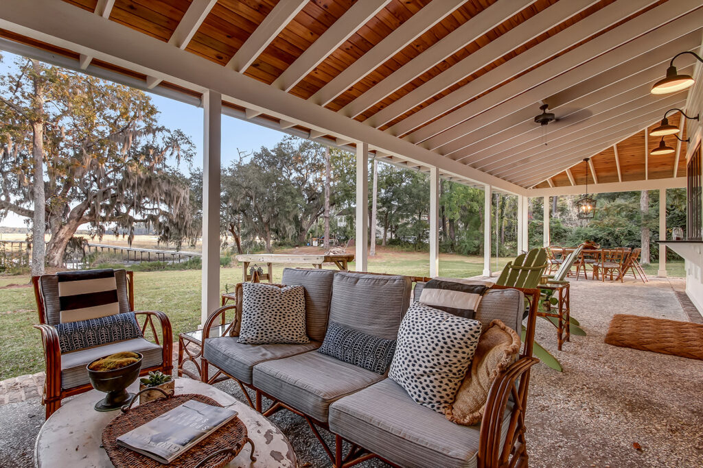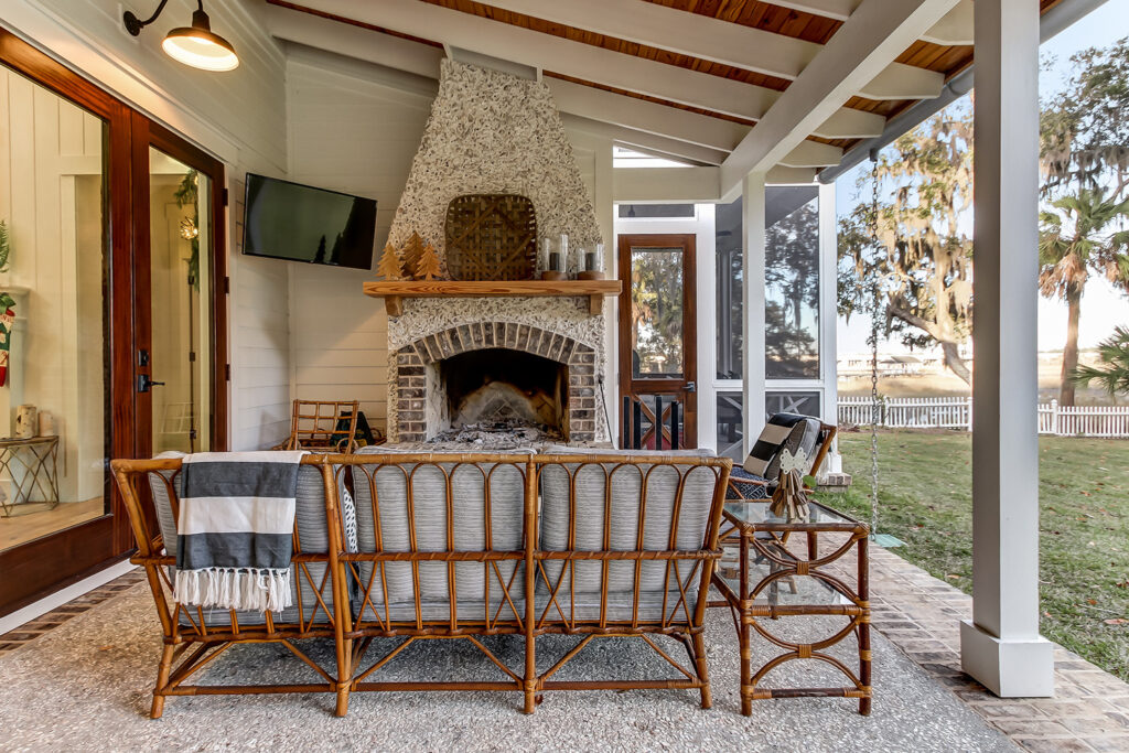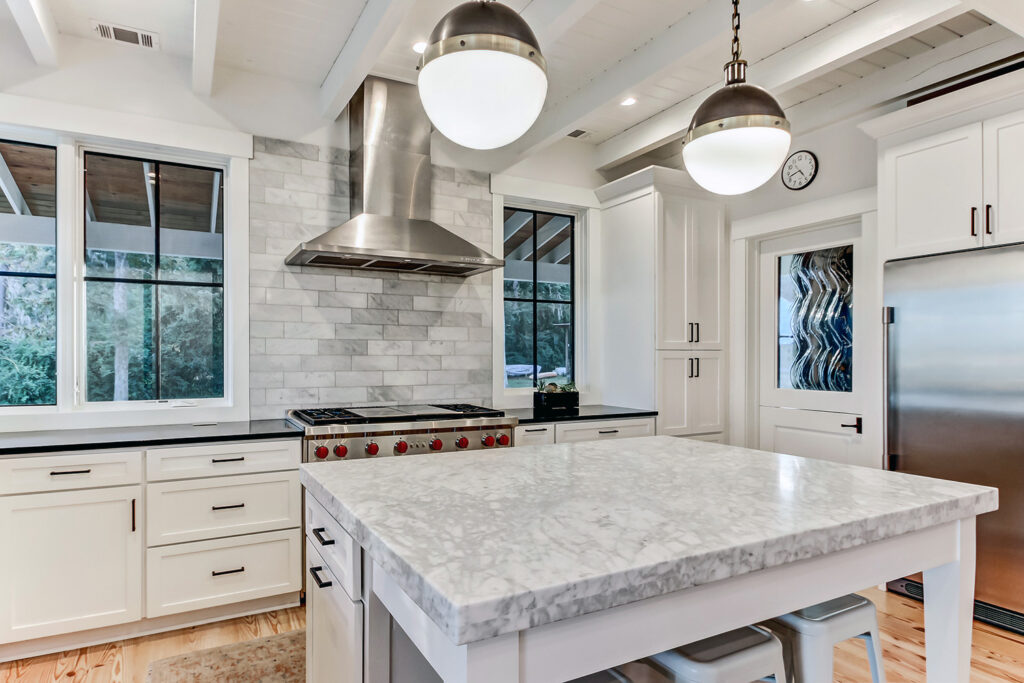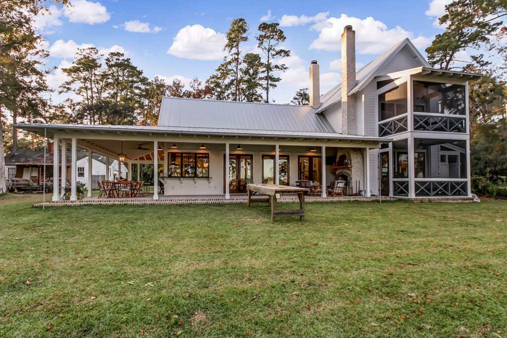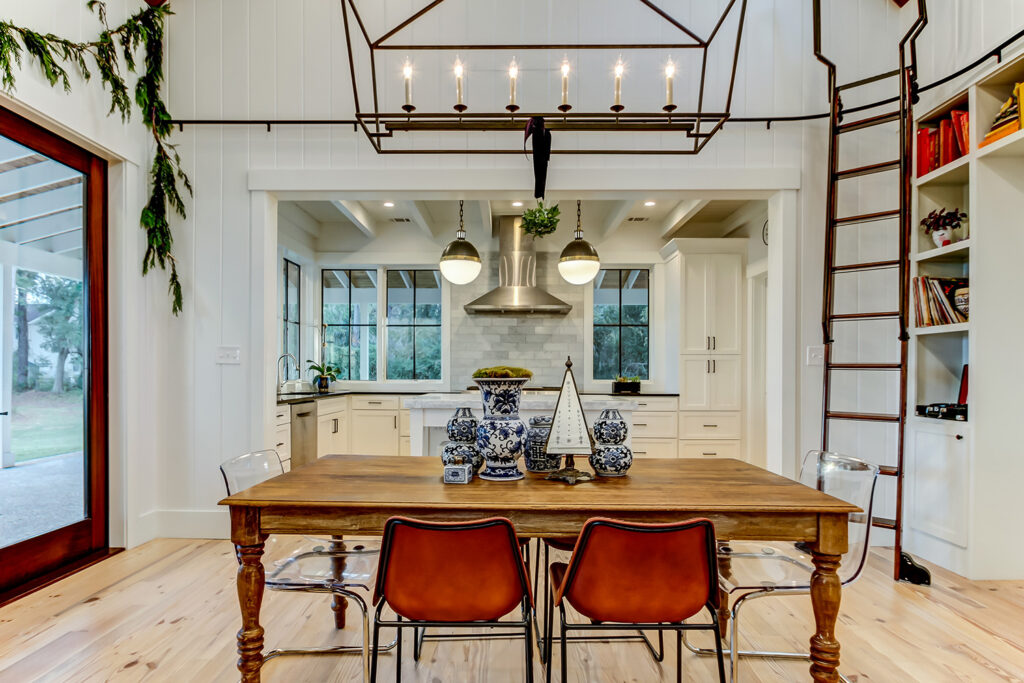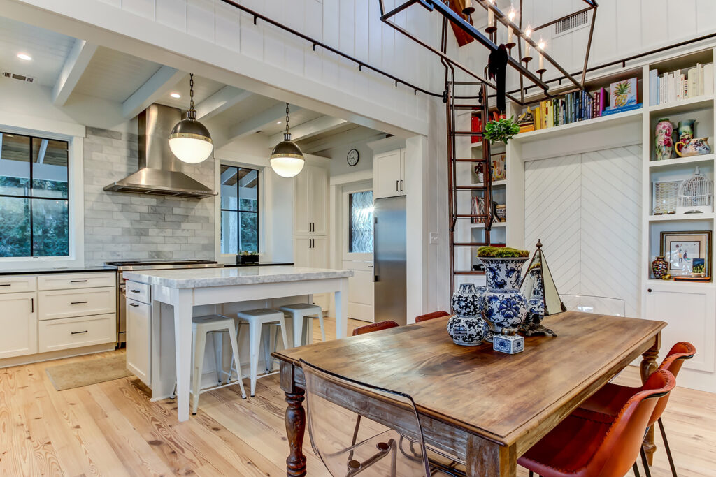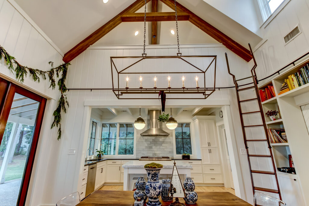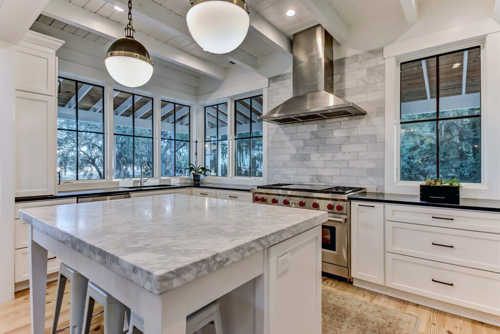 This modern contemporary custom home features an open concept great room with a vaulted ceiling, high-end finishes, and gourmet modern kitchen. The expansive patio wraps around two sides of the home.