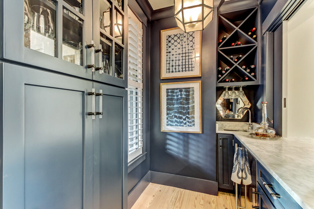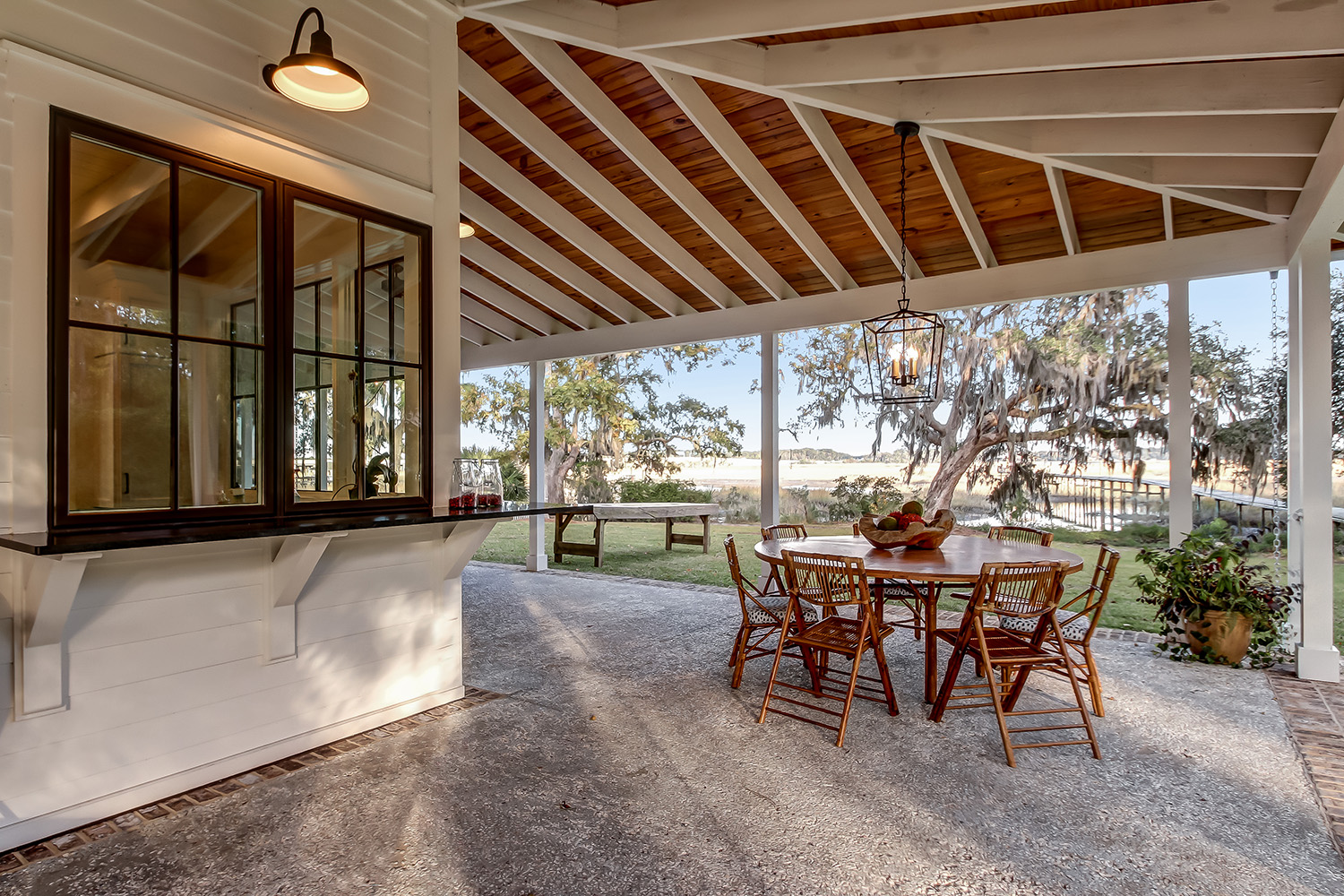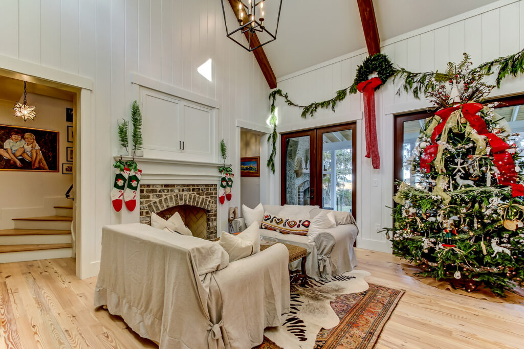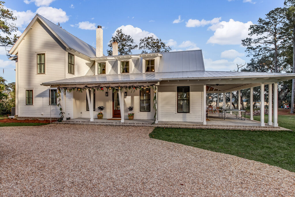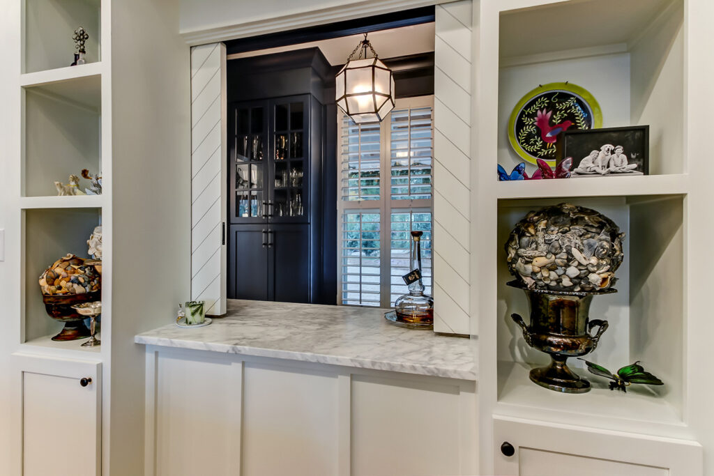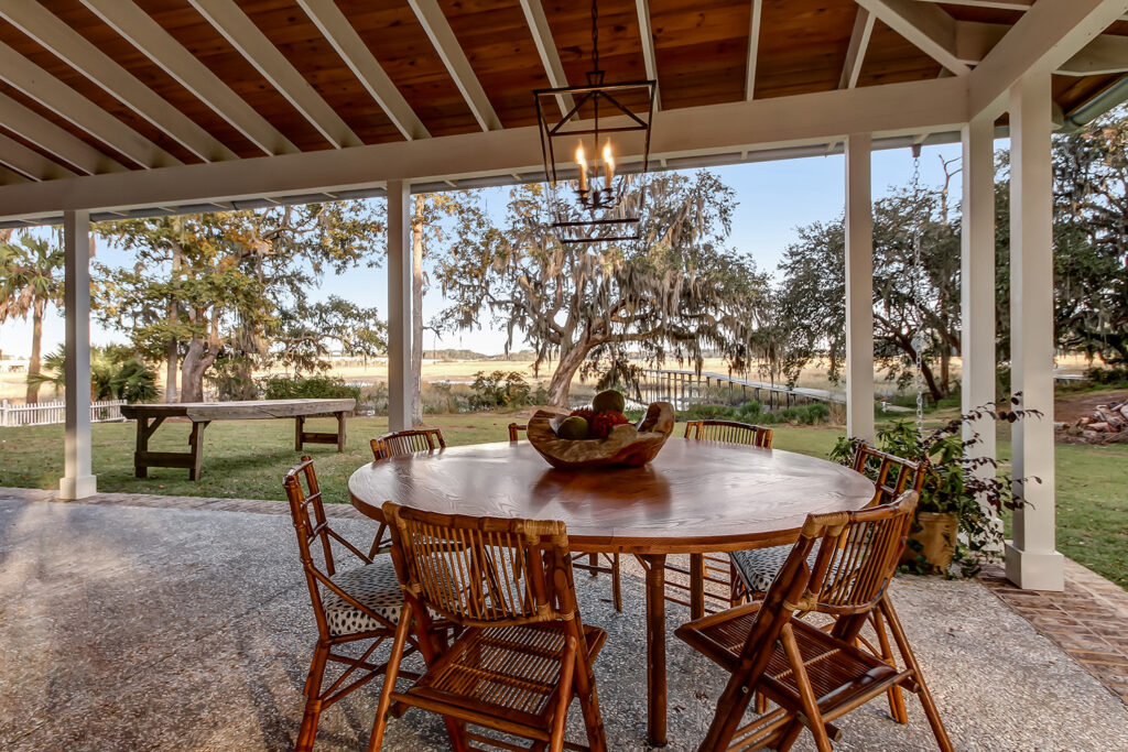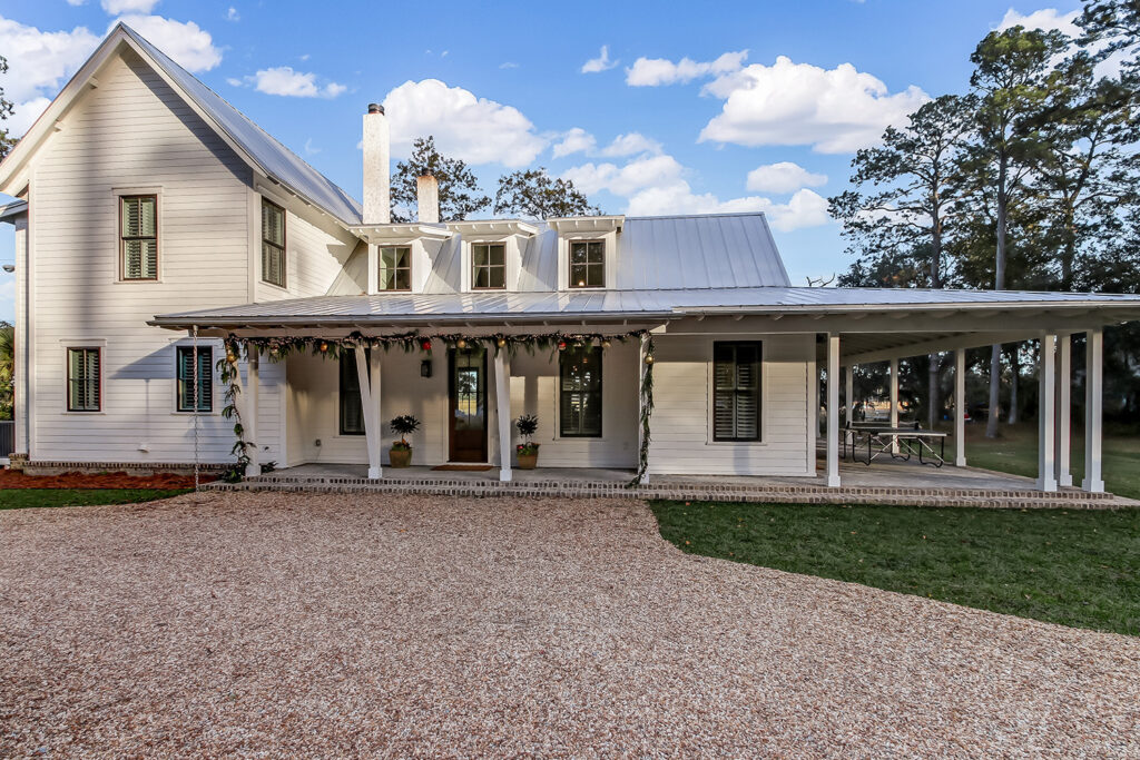 This modern contemporary custom home features an open concept great room with a vaulted ceiling, high-end finishes, and gourmet modern kitchen. The expansive patio wraps around two sides of the home.