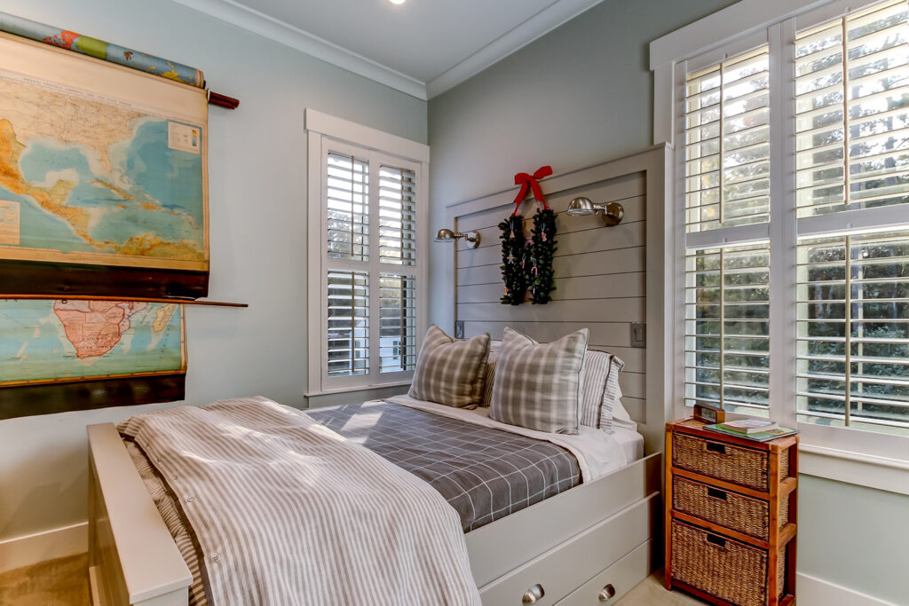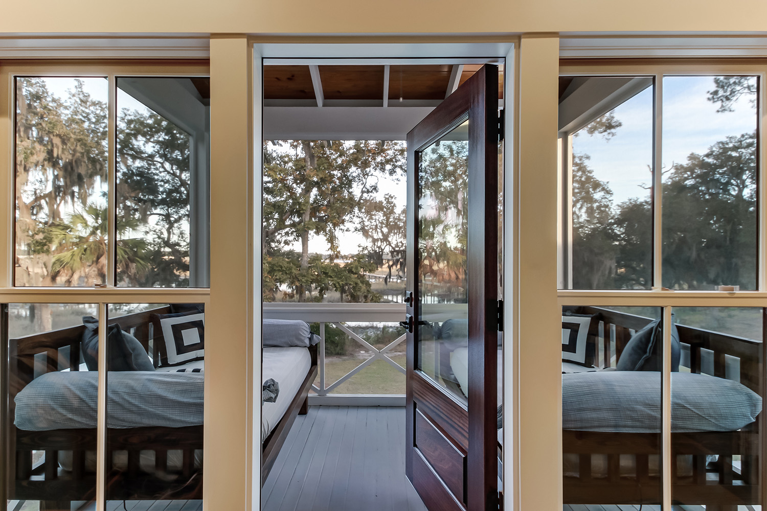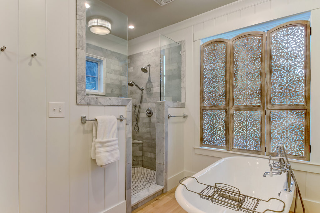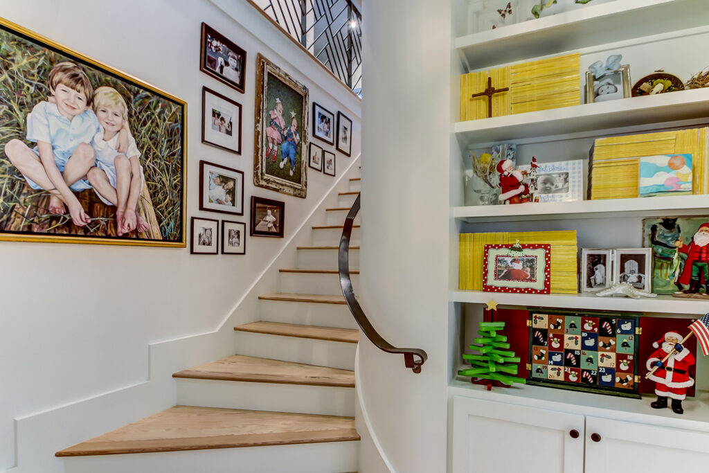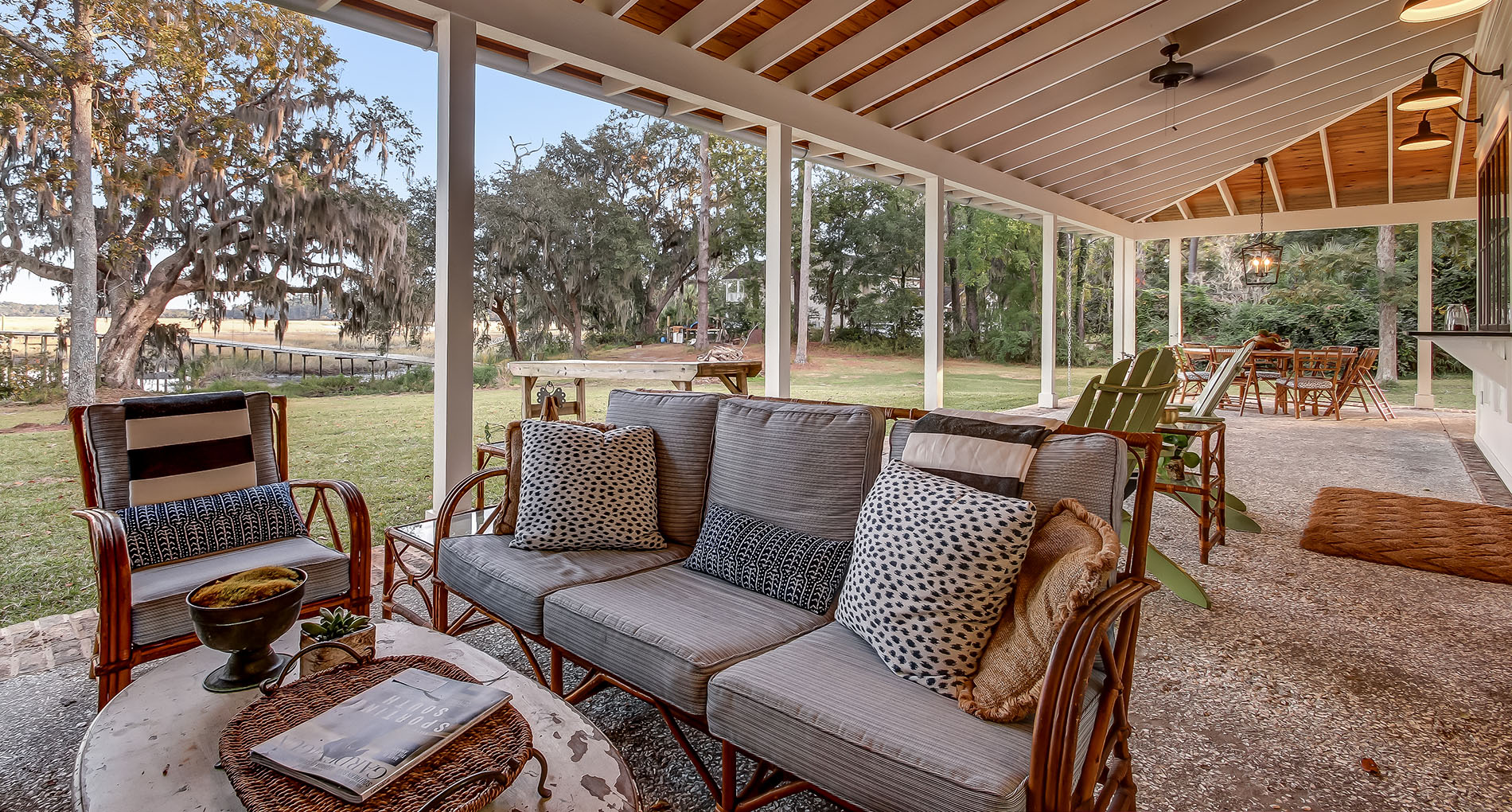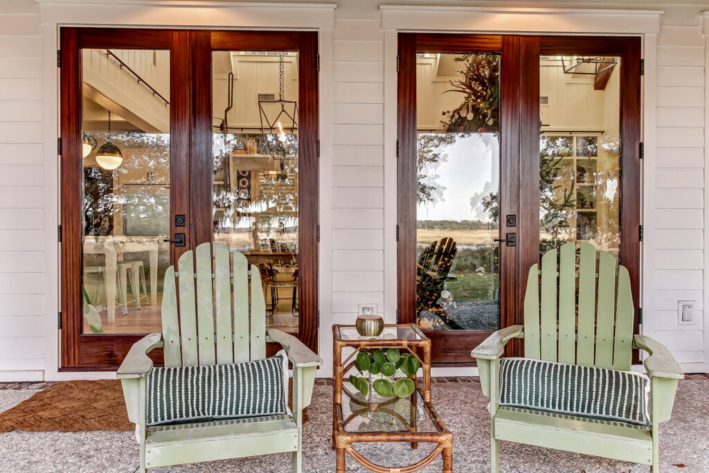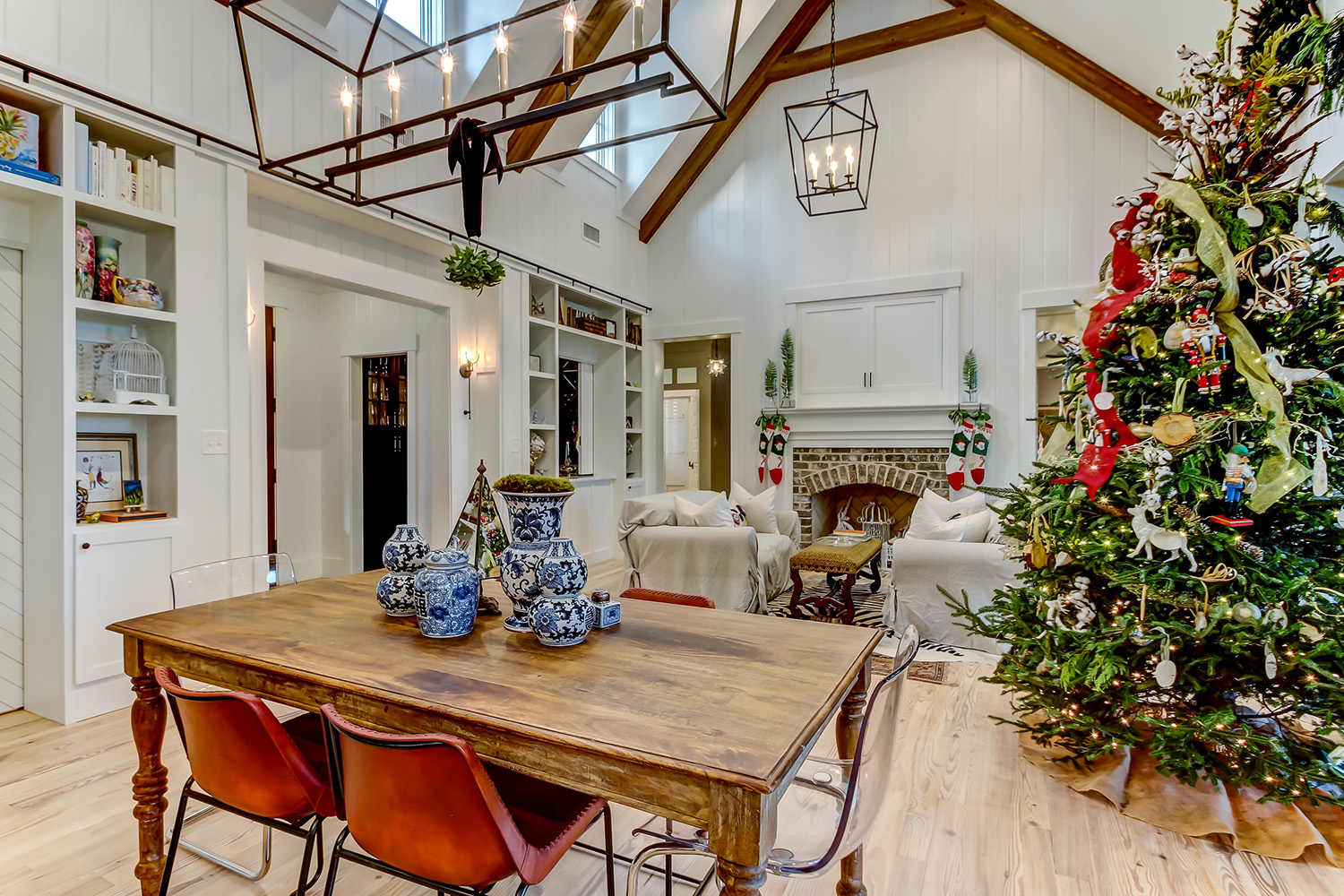 This modern contemporary custom home features an open concept great room with a vaulted ceiling, high-end finishes, and gourmet modern kitchen. The expansive patio wraps around two sides of the home.