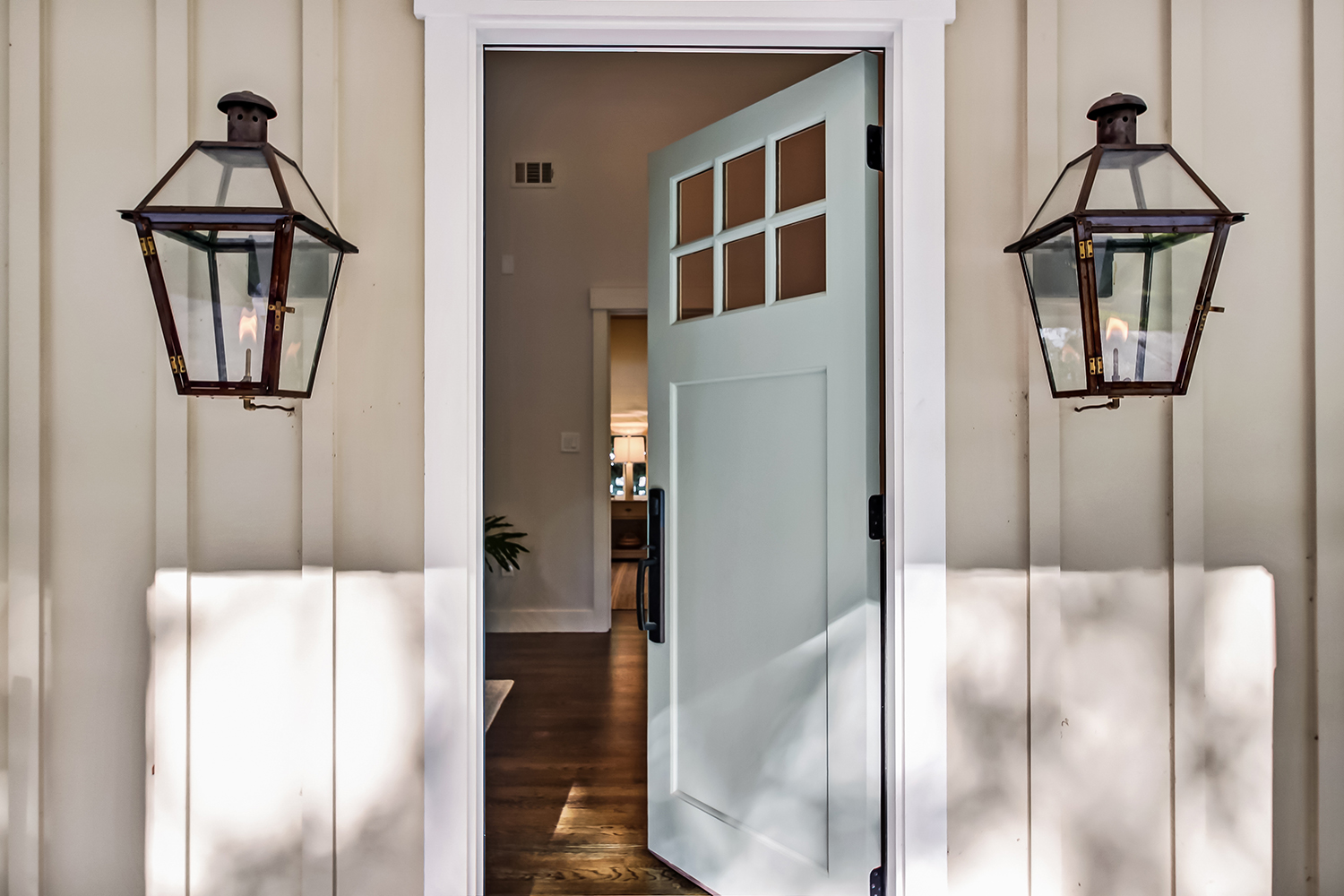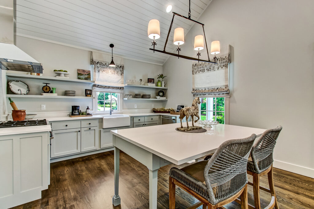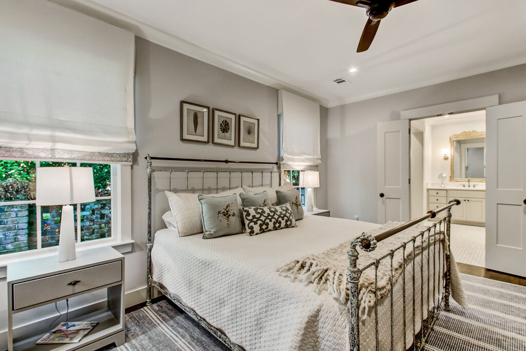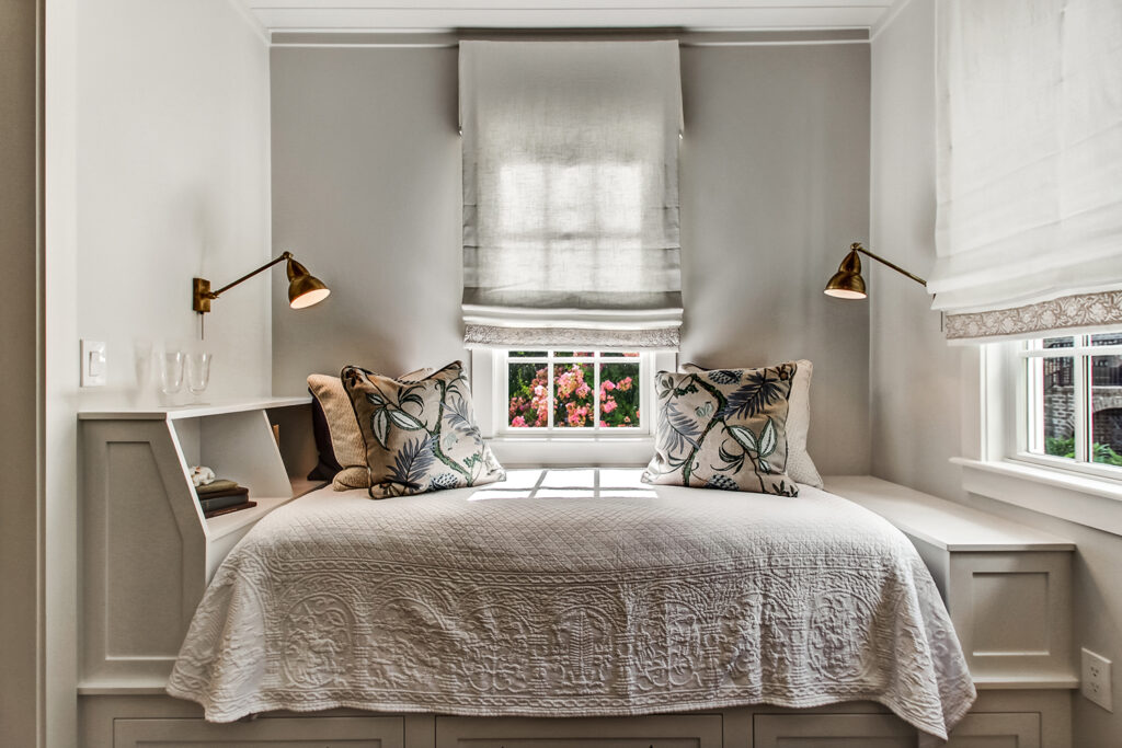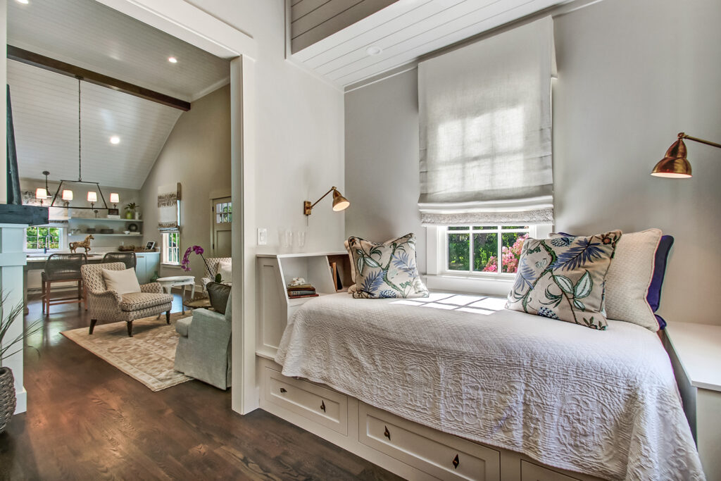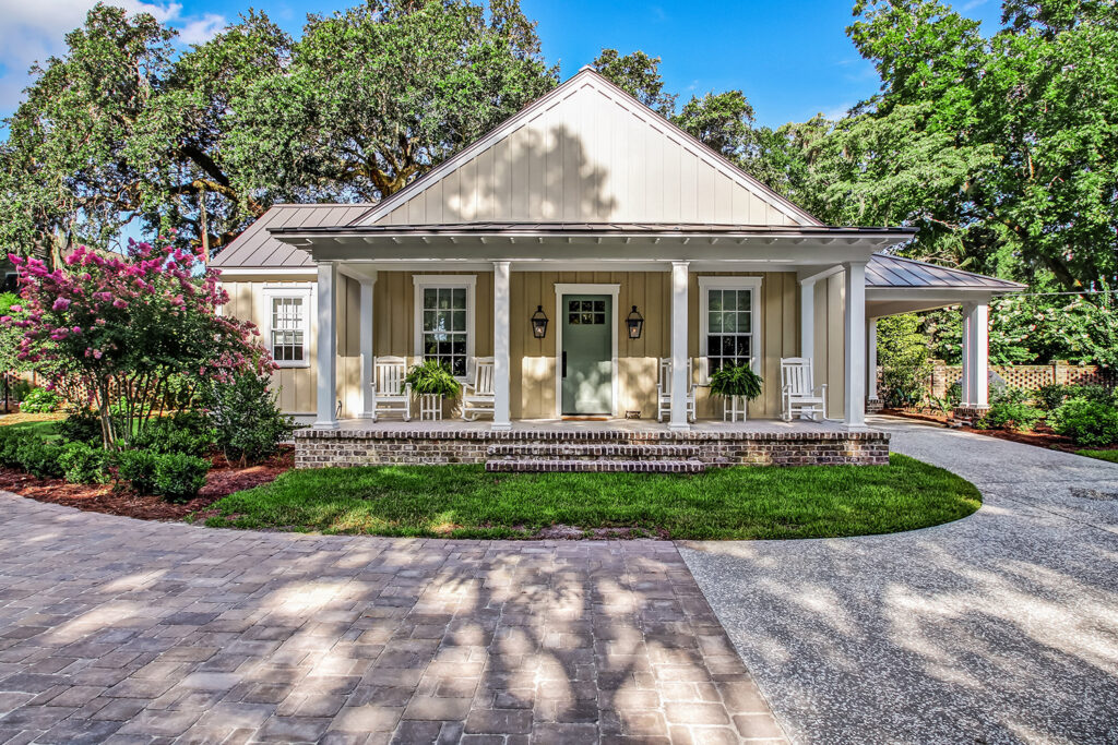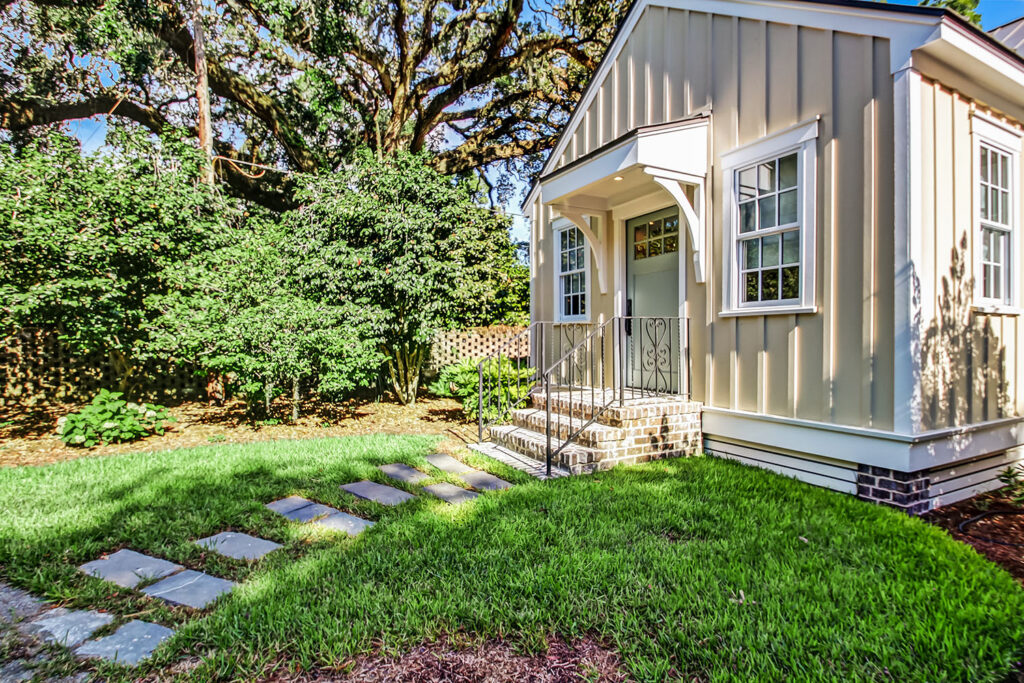 The exterior of our McAlpin Guest Cottage is just as sweet as can be! The vertical siding, metal roof, brick staircase, gas lanterns, and separate driveway create the absolute highest level in amenities for guests. The luxury continues inside with a built-in window seat and a full kitchen.