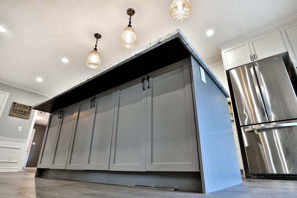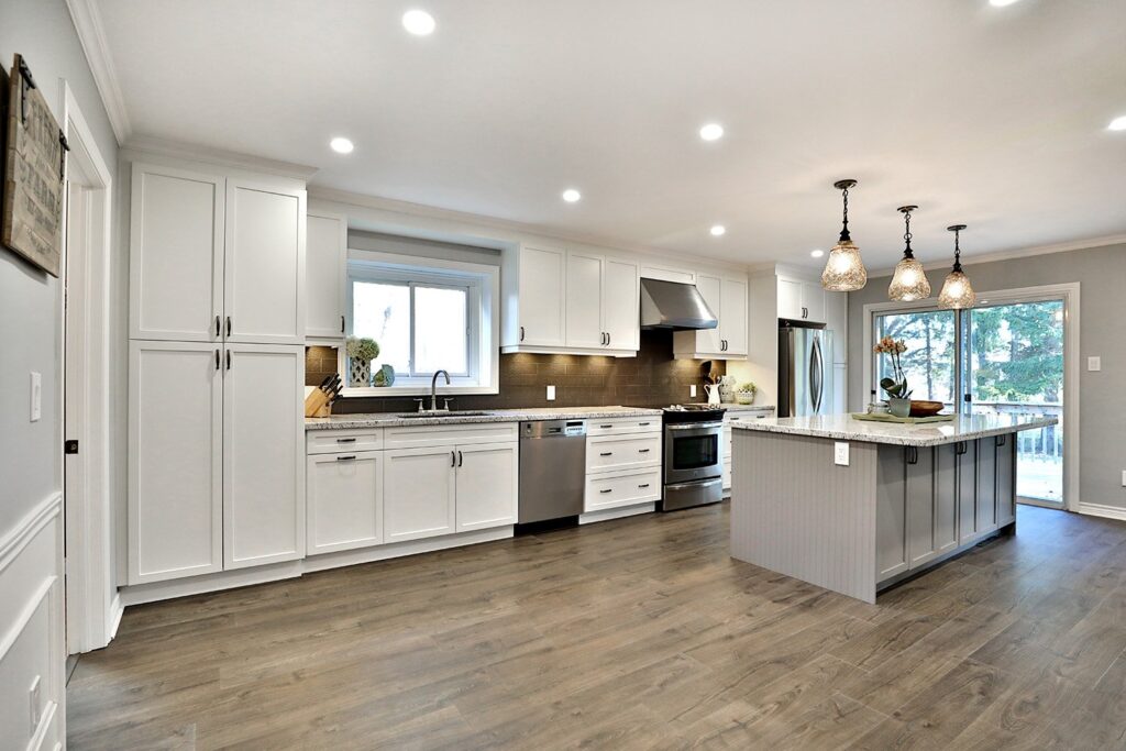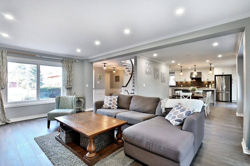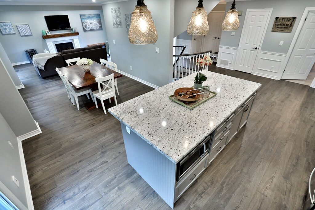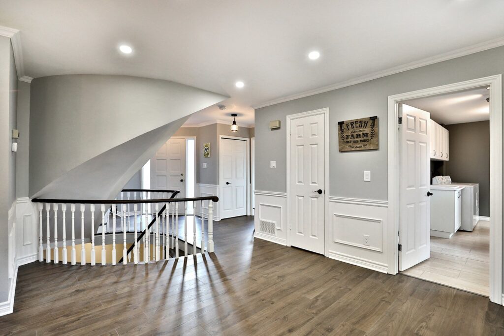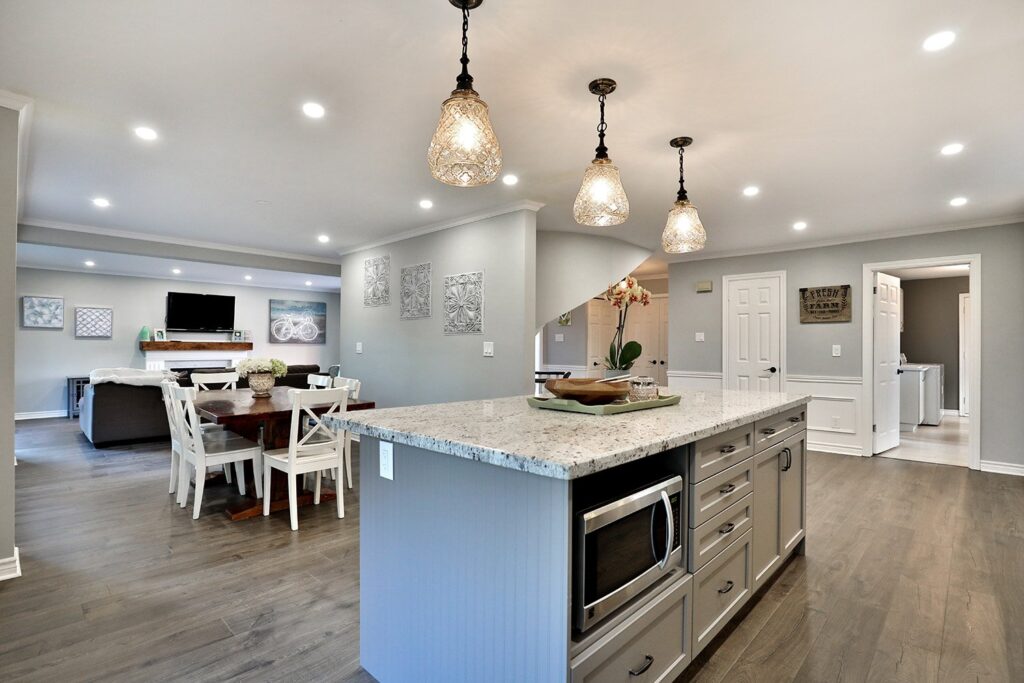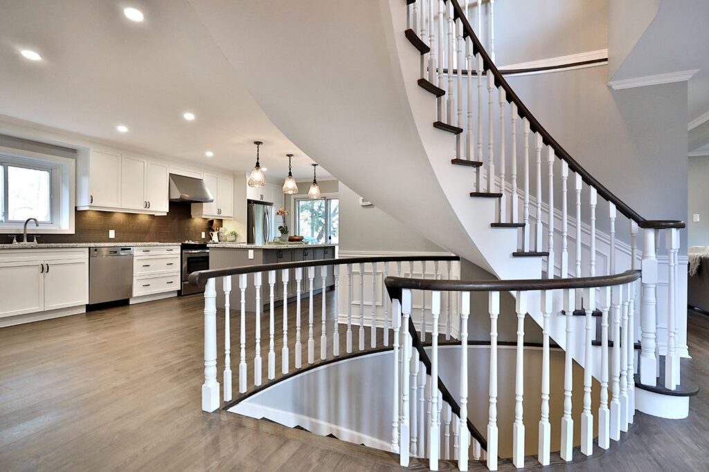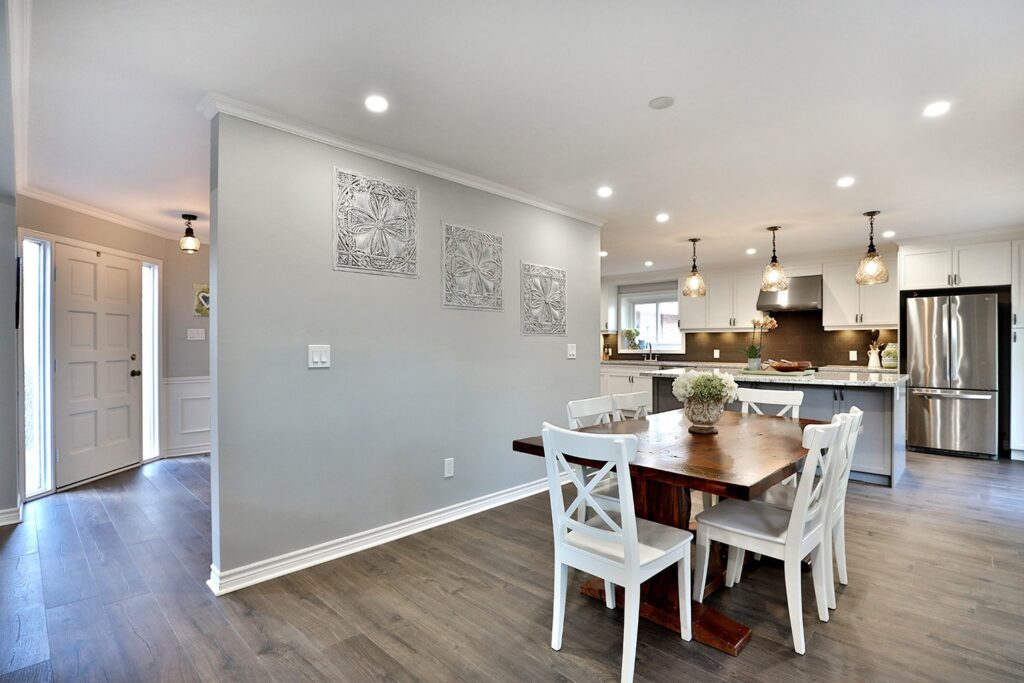 The main floor had the traditional rooms segregated from each other. Two load-bearing walls were removed and replaced with a beautifully functional open and airy main floor for this family of four to enjoy. The load-bearing wall between the kitchen and dining room was replaced with a steel beam located in the ceiling to provide a seamless transition.