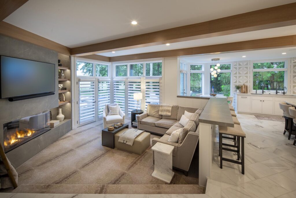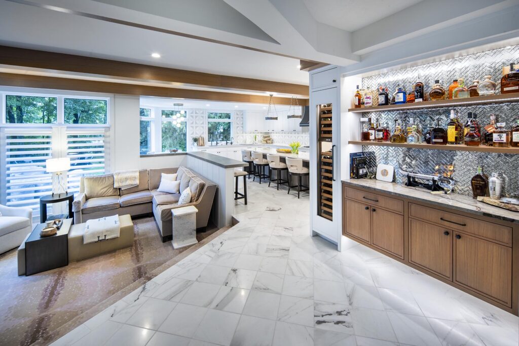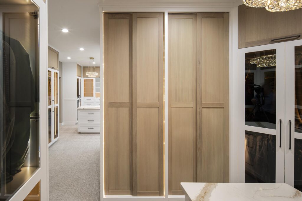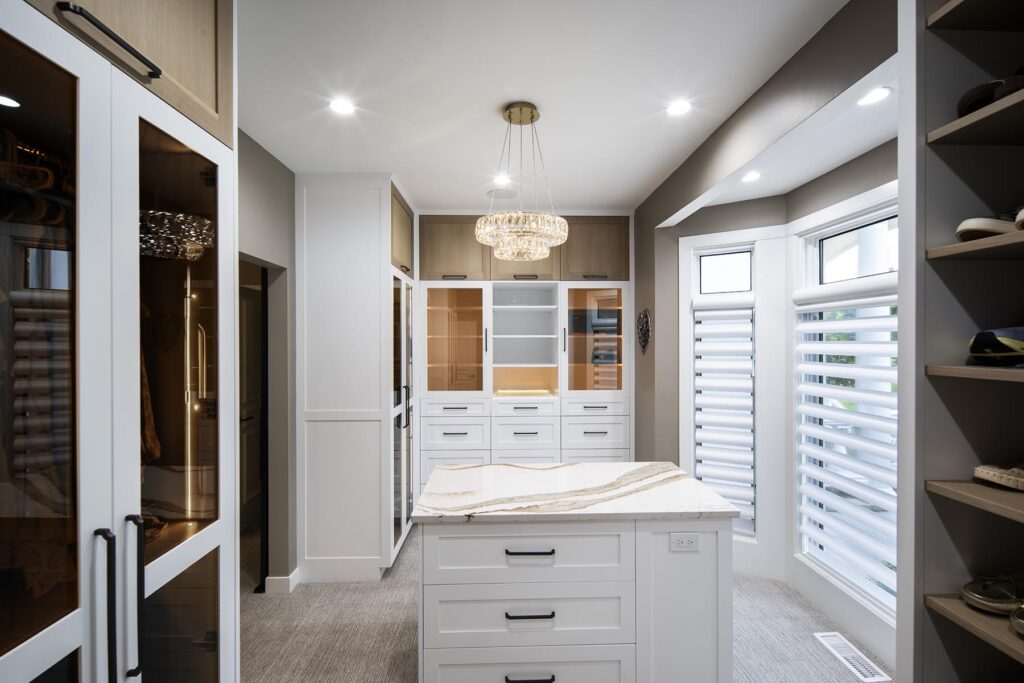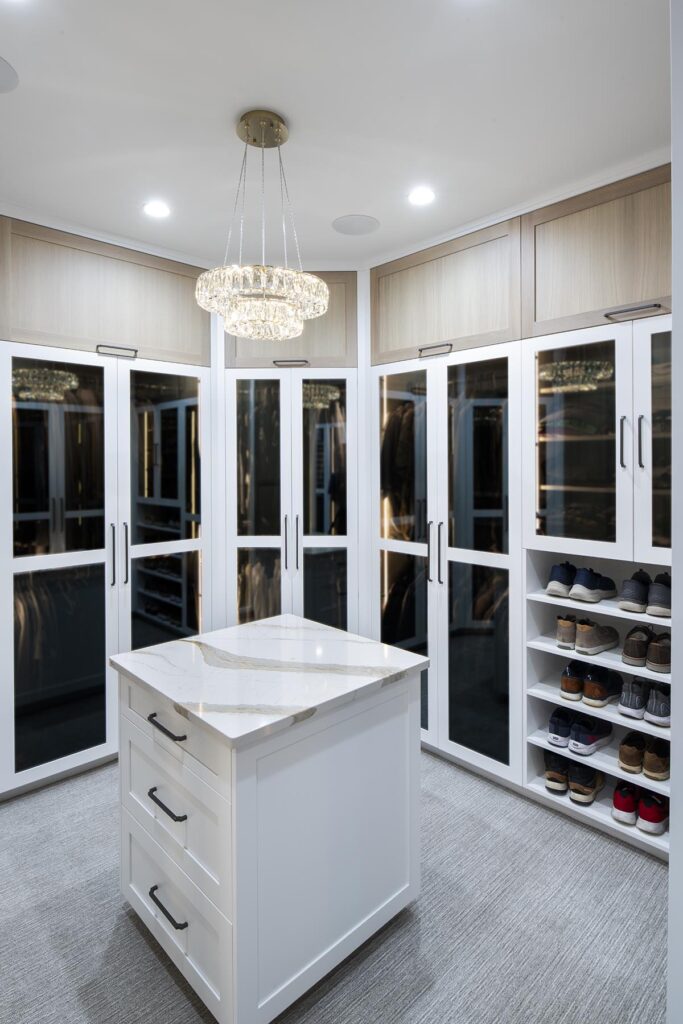 The renovation centered around enhancing the heart of the home. A strategic addition expanded the kitchen into a chef-inspired environment equipped with nearly every appliance imaginable, custom cabinetry, a porcelain feature wall, and a bar designed for effortless hosting. The primary suite now features a boutique-quality walk-in closet with glass doors and integrated lighting, creating a daily experience that feels indulgent and organized.