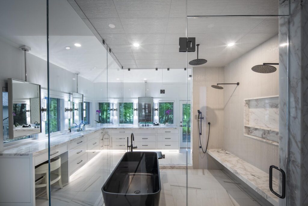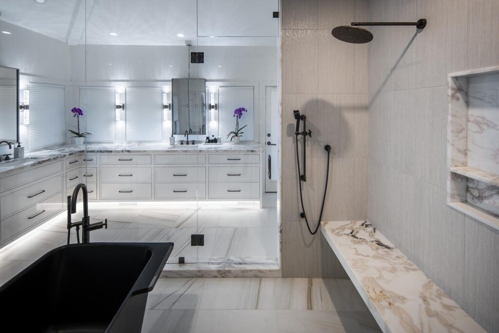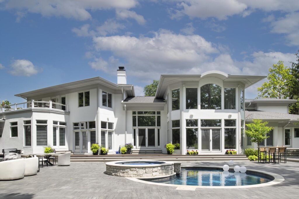 Outdoor living was elevated with two new decks overlooking the golf course, along with a stunning new pool and hardscape designed by 9th Avenue Designs and executed by Highland Construction. Interior improvements included two upgraded fireplaces, a dramatic 9’x9’x9’ steam shower with a tub inside, motorized shades, ghost glass, and a fully integrated AV and lighting system by Sound and Vision featuring custom Lutron controls.