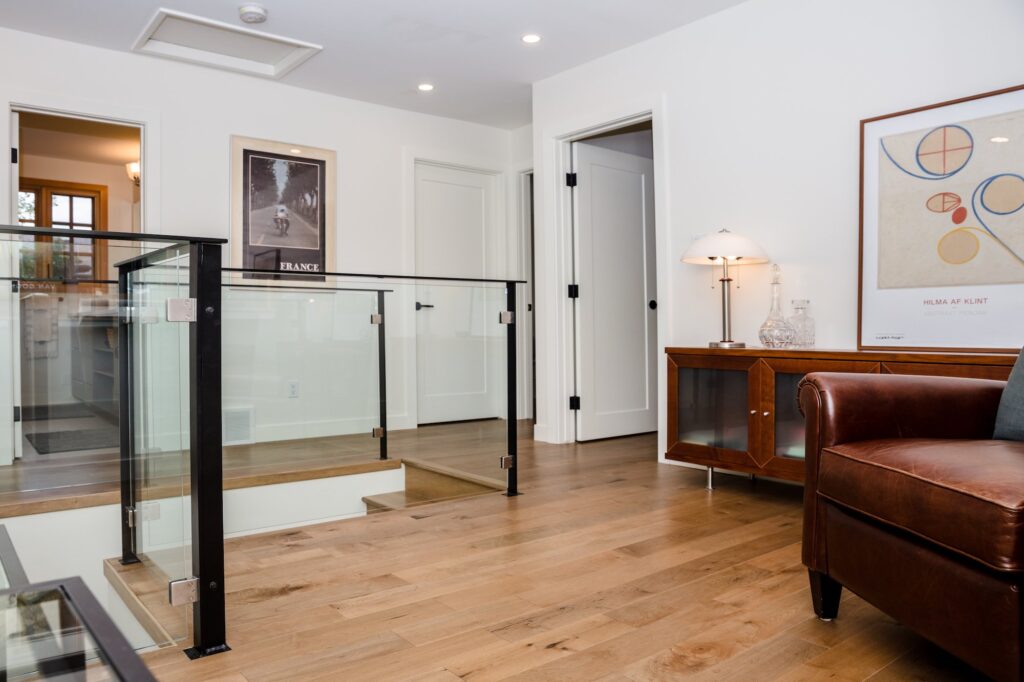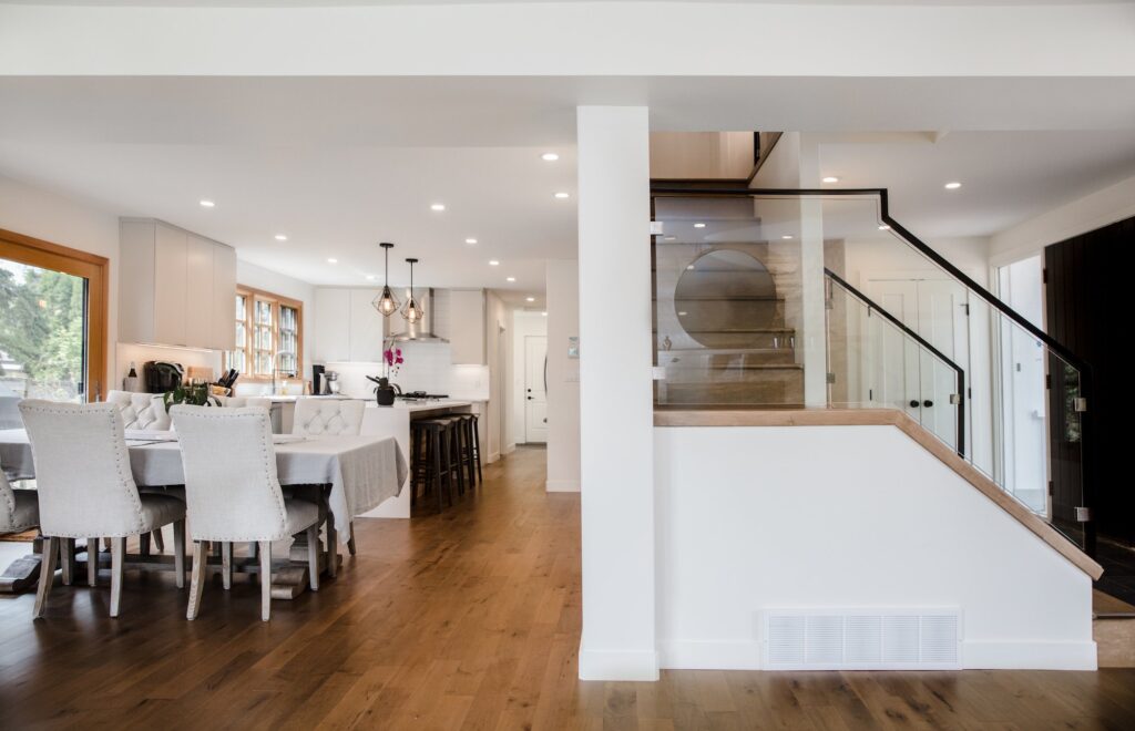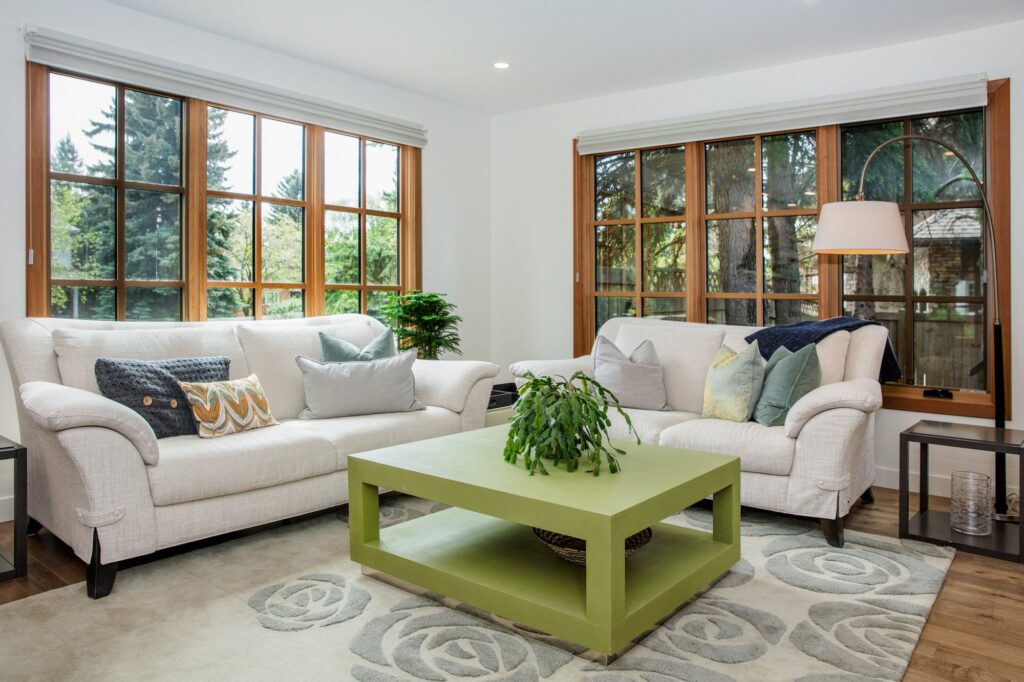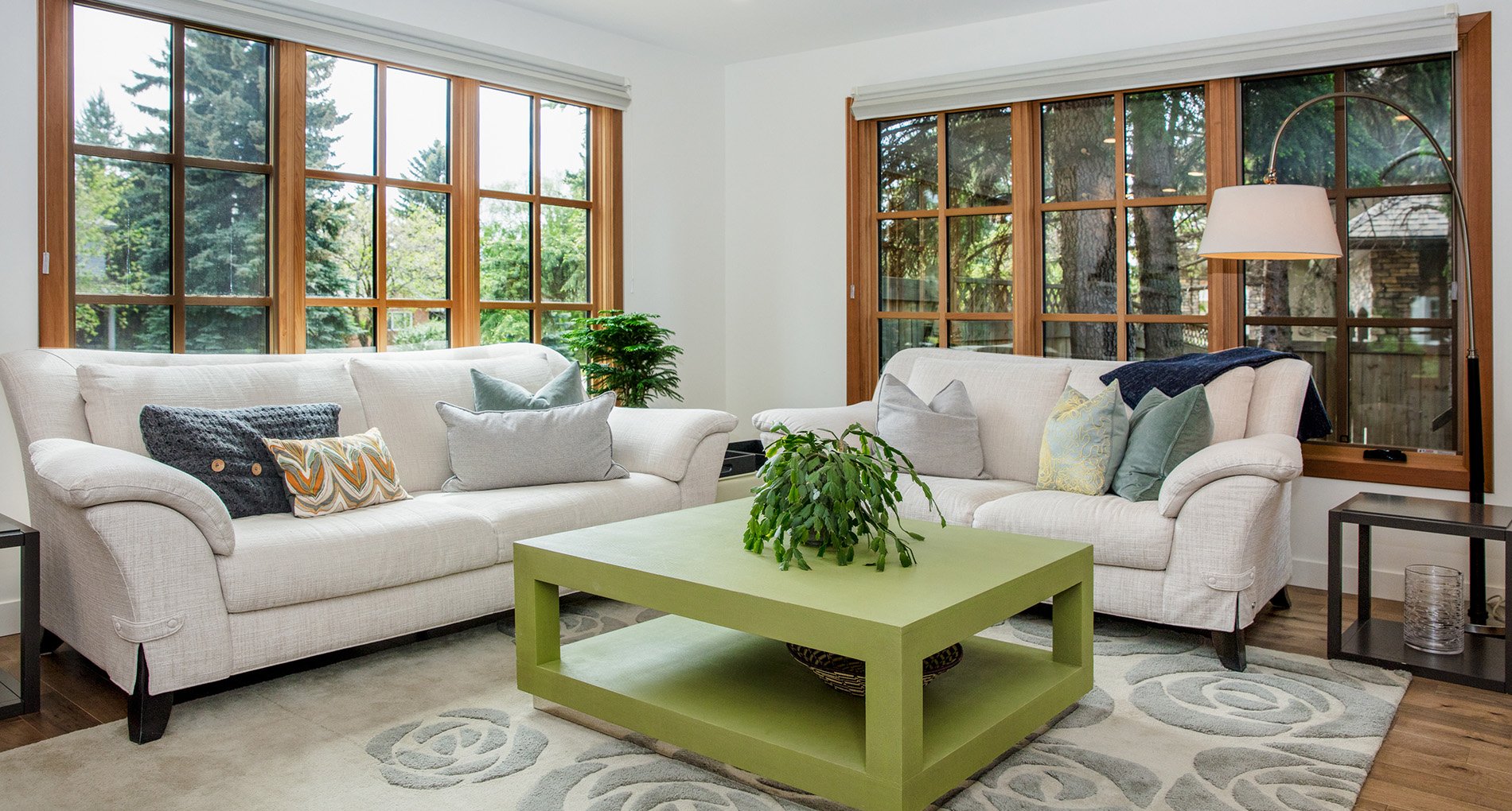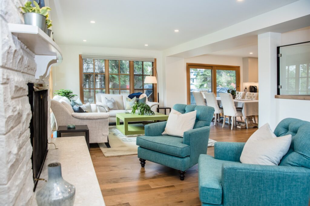 A modern home renovation featuring wood-trimmed windows, hardwood floors, and an open concept living space. The bright blues and greens in the living room give a bright and cheery atmosphere to the space.