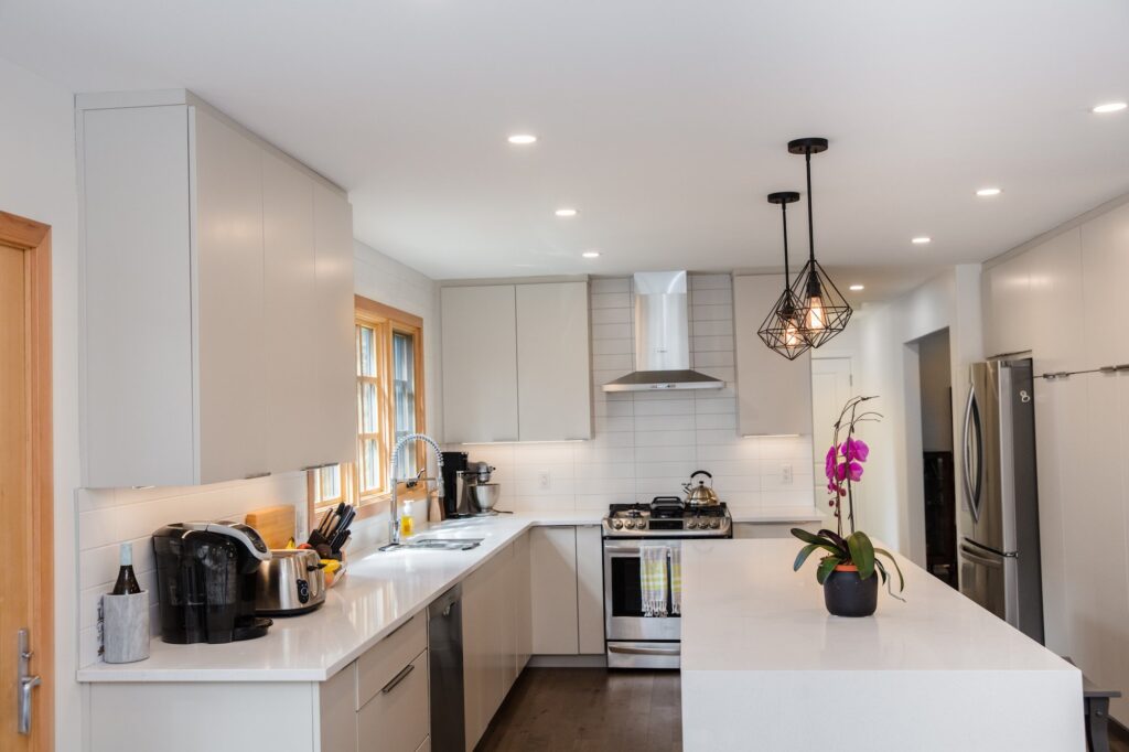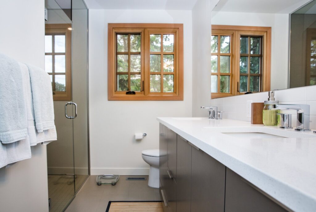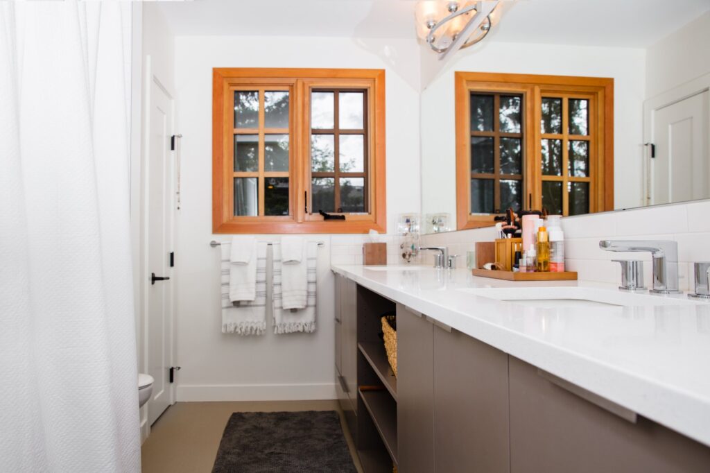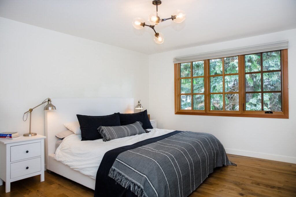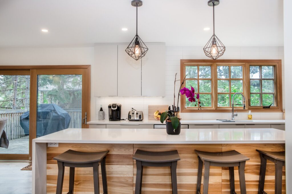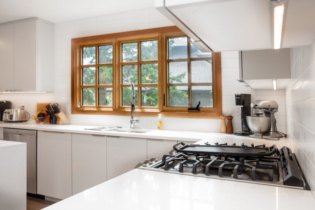 A modern home renovation featuring wood-trimmed windows, hardwood floors, and an open concept living space. The bright blues and greens in the living room give a bright and cheery atmosphere to the space.