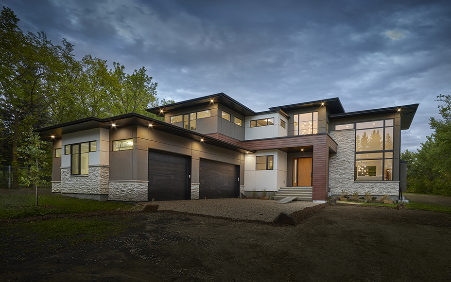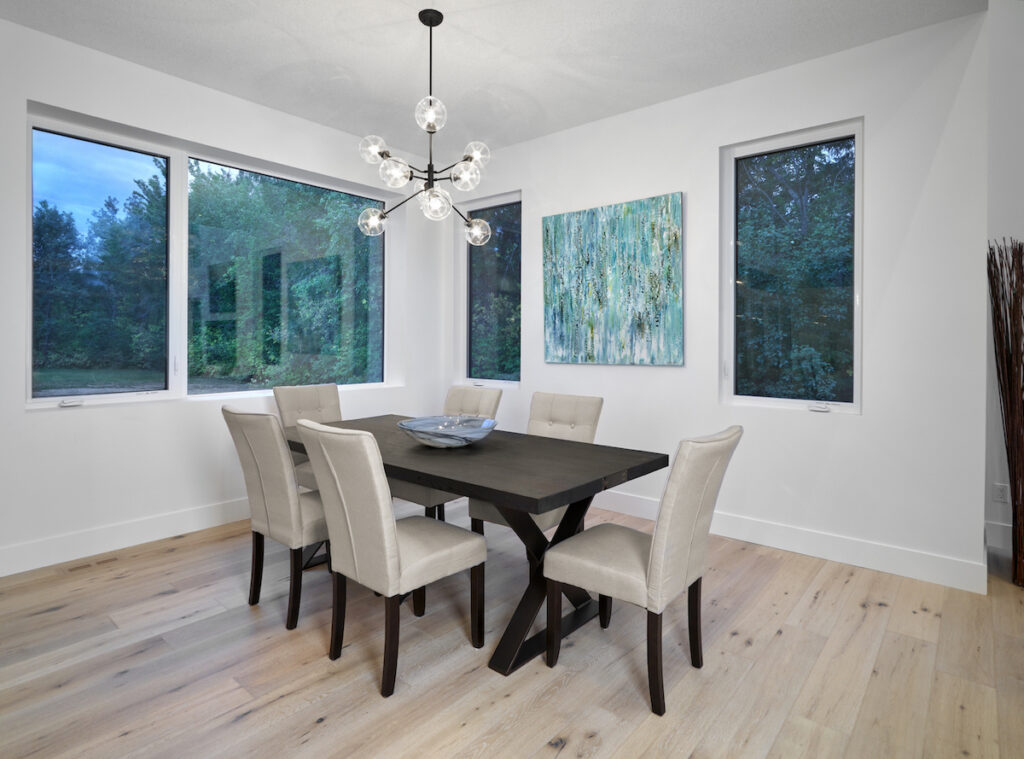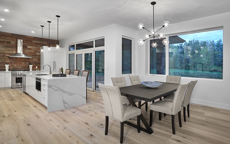 This contemporary custom home features and open concept layout, contemporary design, and luxurious finishes. The main living space has a unique, contemporary window layout that is nicely complimented by the high ceilings. The modern light wood floors and white walls bring a very bright and open feel that continues through to the kitchen/dining area. A unique element to this kitchen is the reclaimed wood feature wall. This adds a more rustic feel to the home that matches nicely to the dark tiled ribbon fireplace.