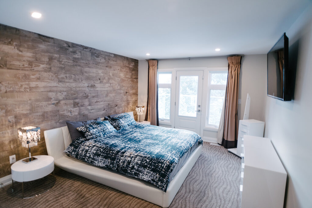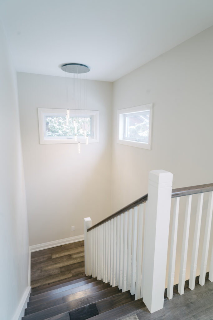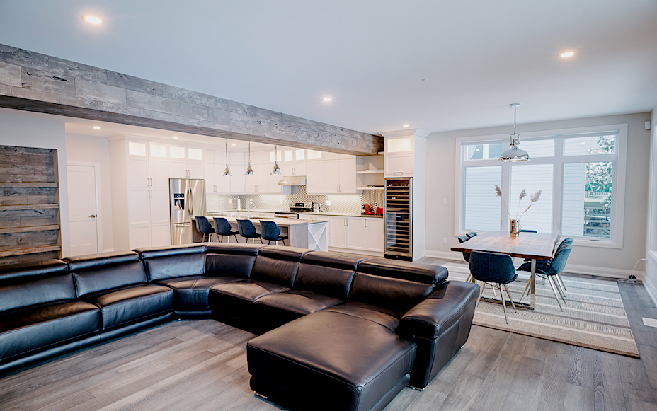 This Georgian Bay waterfront beach home is 4,500 sqft and features 5 bedrooms, 3.5 baths, office, gym, media room, main floor and upper floor great rooms with vaulted ceilings and a custom kitchen.