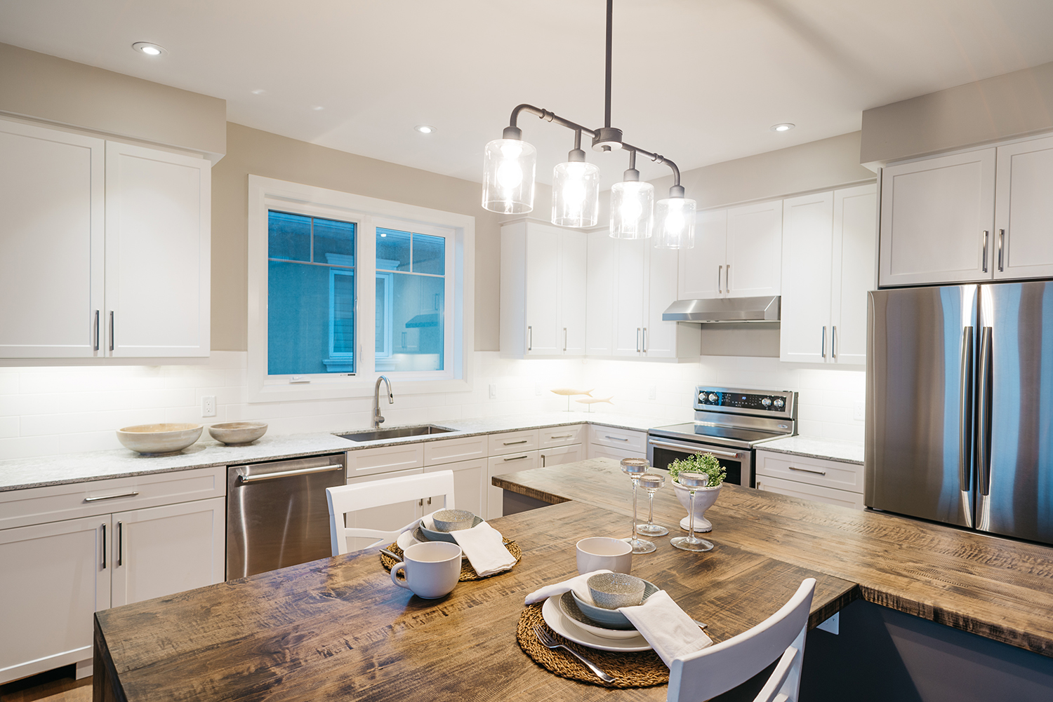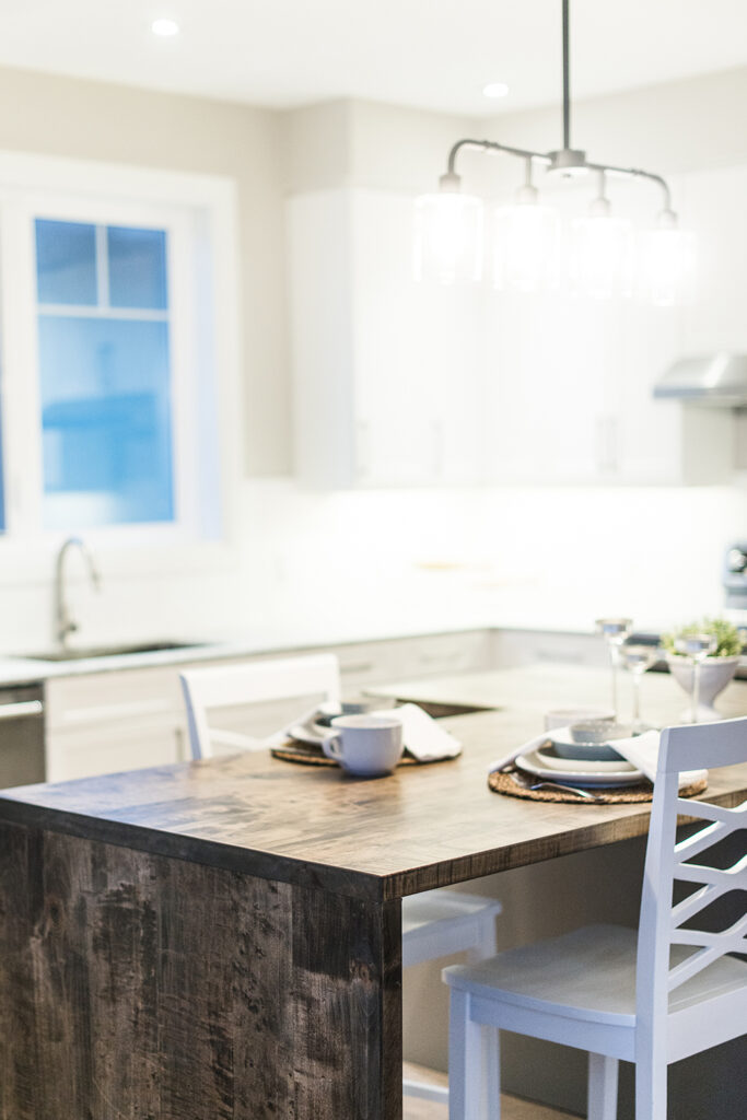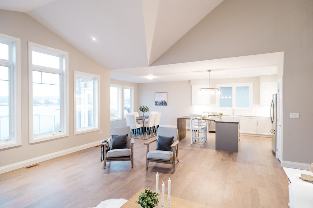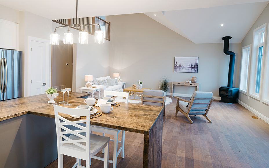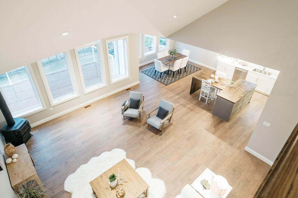 This 4 bedroom, 2.5 bath custom home features an open-concept layout with vaulted ceilings and hardwood floors throughout. The kitchen and living room features a blend of rustic and modern design elements – distressed wood counters and finishes, white cabinets and chairs, and stainless-steel appliances create a cozy and sophisticated atmosphere. The wood stove in the living room adds to the rustic charm of the space.