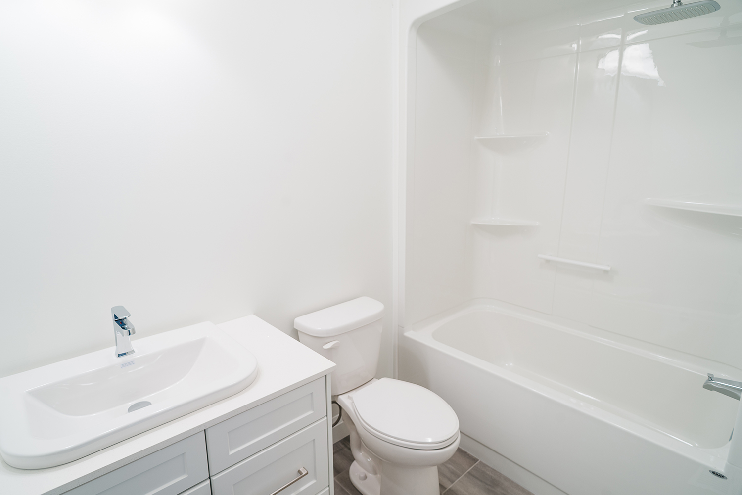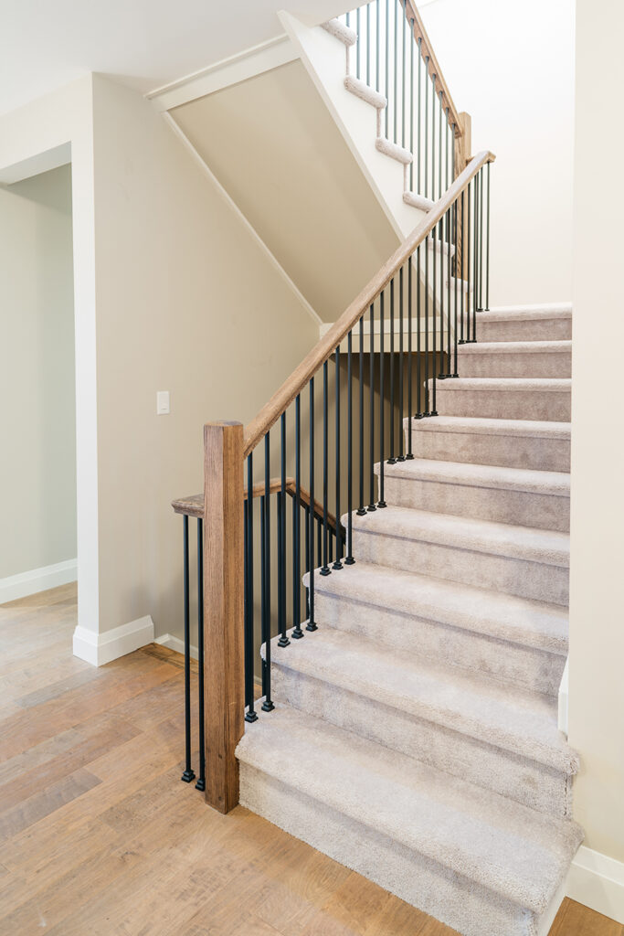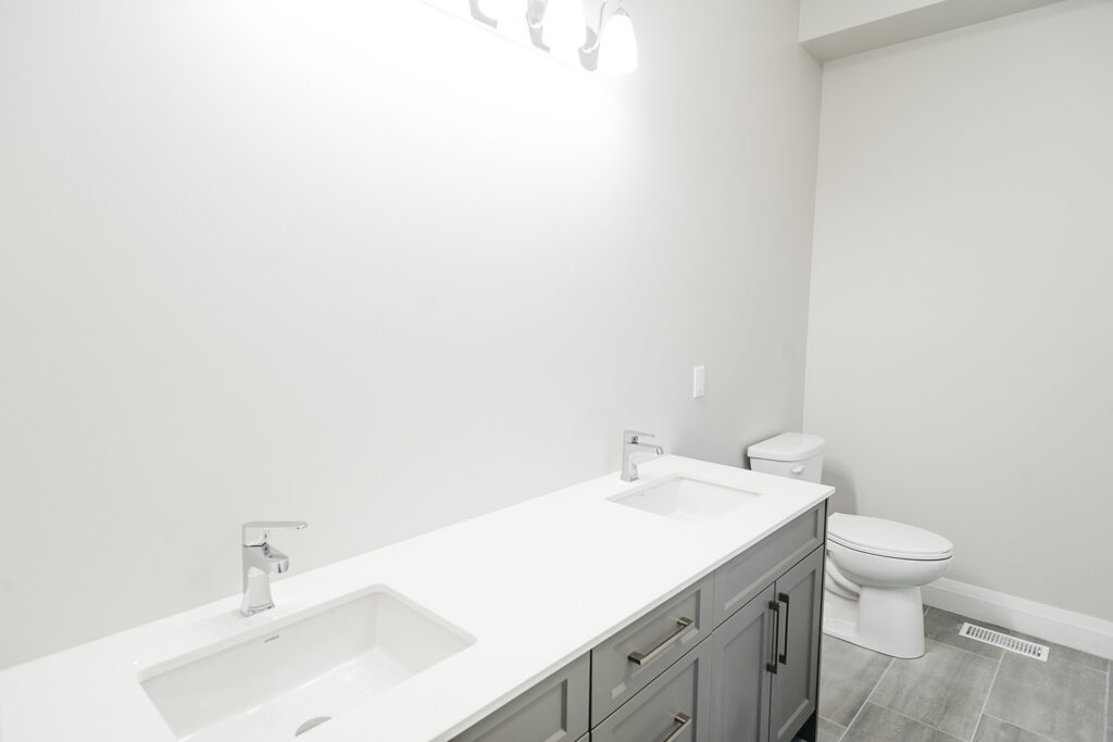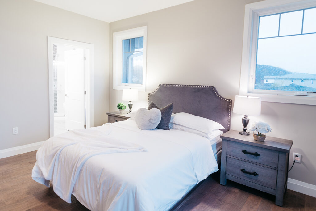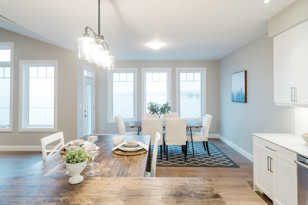 This 4 bedroom, 2.5 bath custom home features an open-concept layout with vaulted ceilings and hardwood floors throughout. The kitchen and living room features a blend of rustic and modern design elements – distressed wood counters and finishes, white cabinets and chairs, and stainless-steel appliances create a cozy and sophisticated atmosphere. The wood stove in the living room adds to the rustic charm of the space.