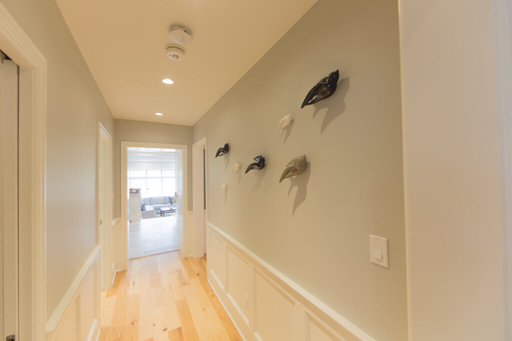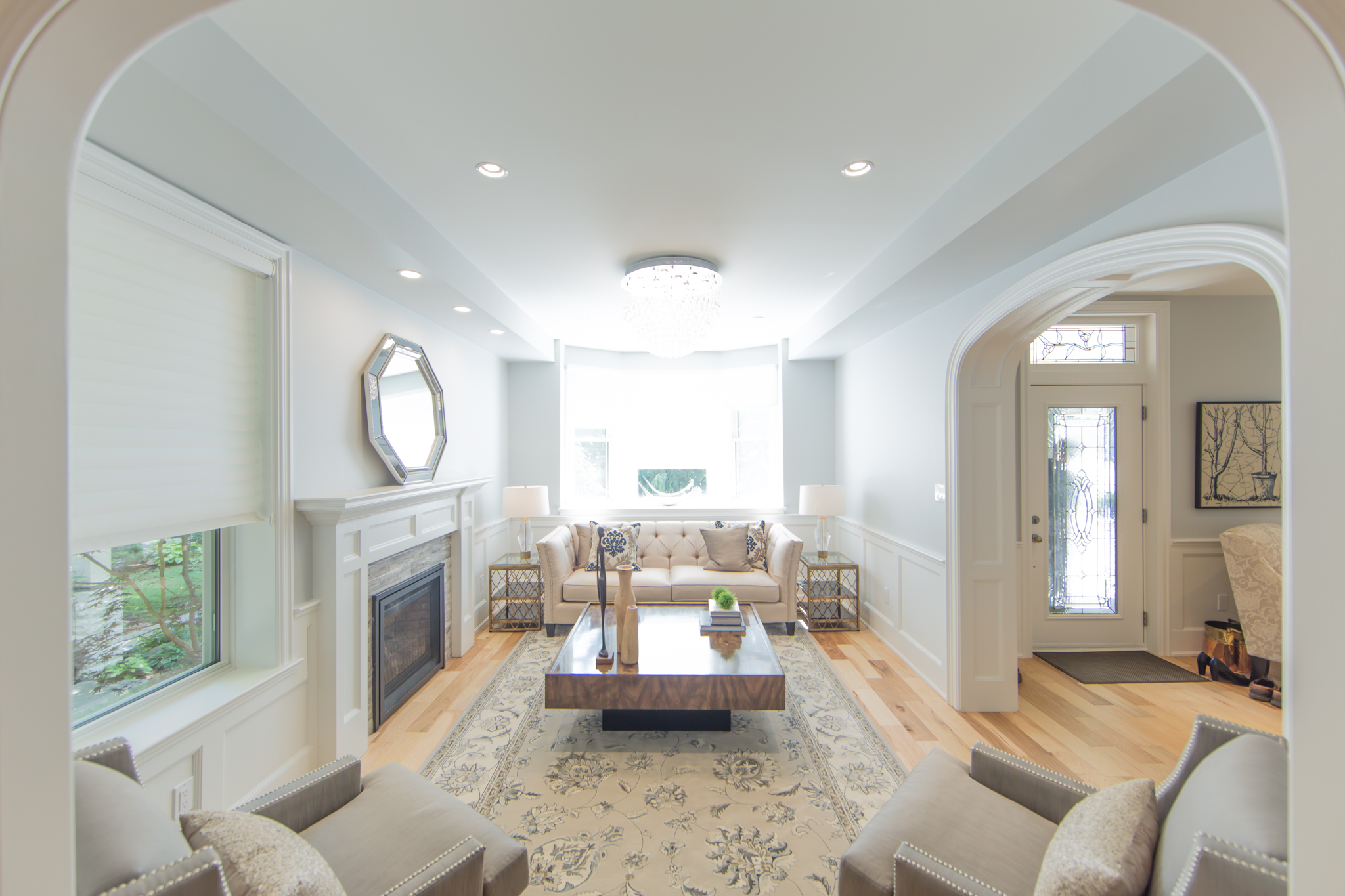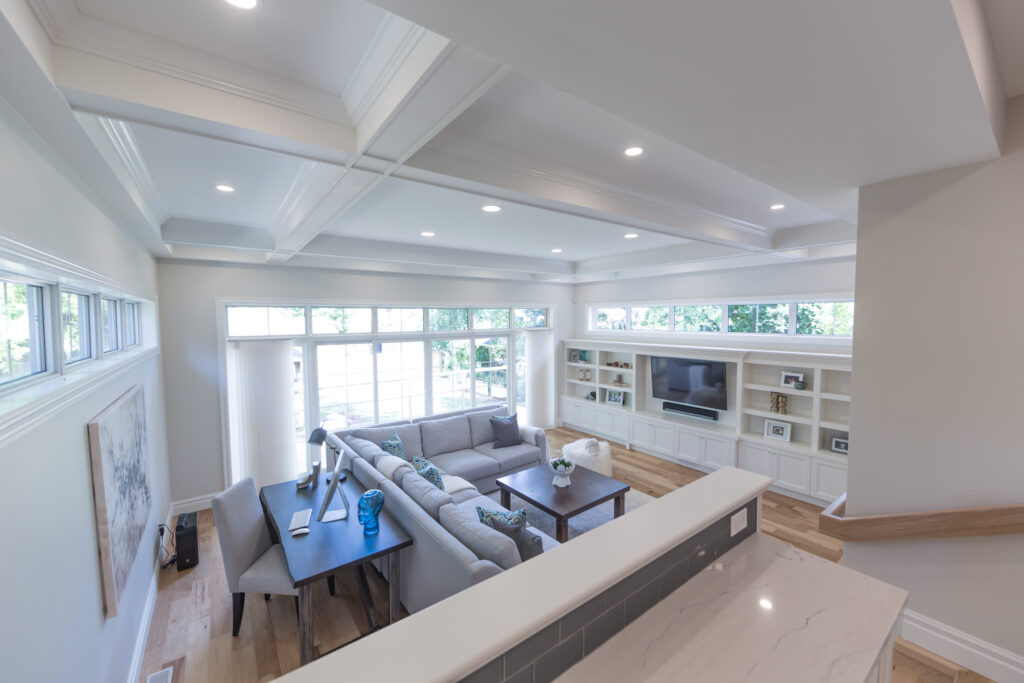 Stand out features are the coffered ceiling in the great room that accents the open kitchen and eating area, leading into the dining room that boasts traditional wainscoting and a huge arched doorway that leads to the sitting room. The traditional touches in the layout and design keep with the old Victorian style in the 1906 existing home.