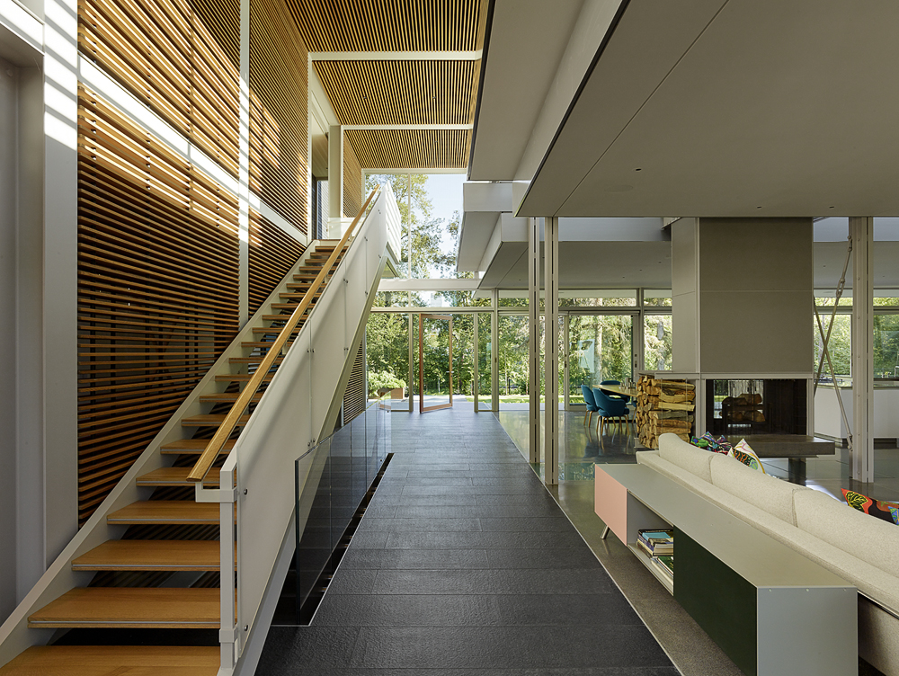 Envision this. Your property is in the woods, and you do not want to cut down all of the trees. The two largest trees in the area become central aspects of your design, and you decide to build around them with floor-to-ceiling glass windows displaying them as if they were a museum exhibit.