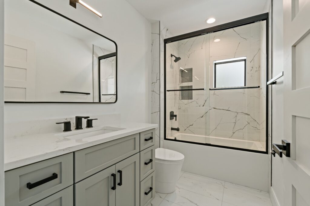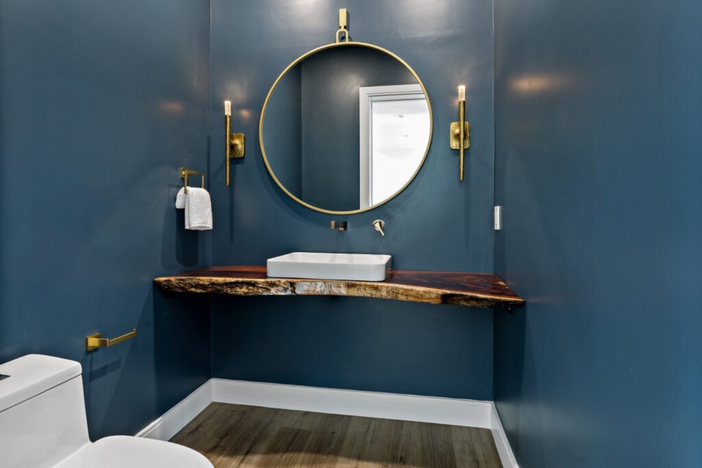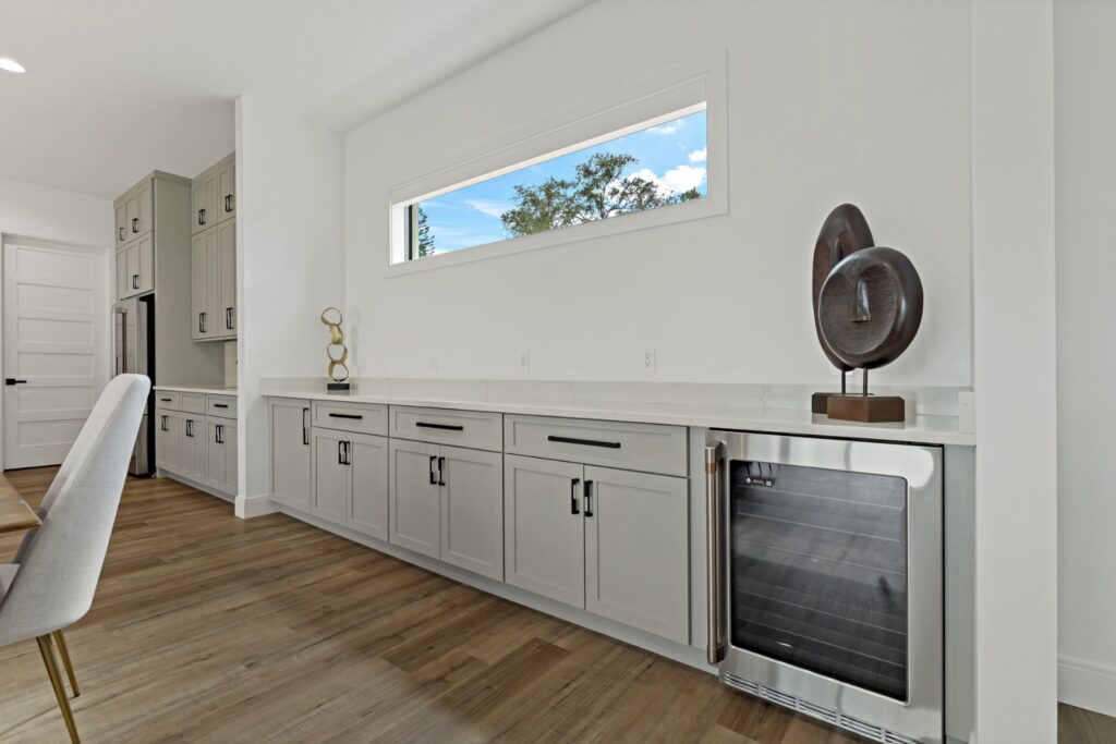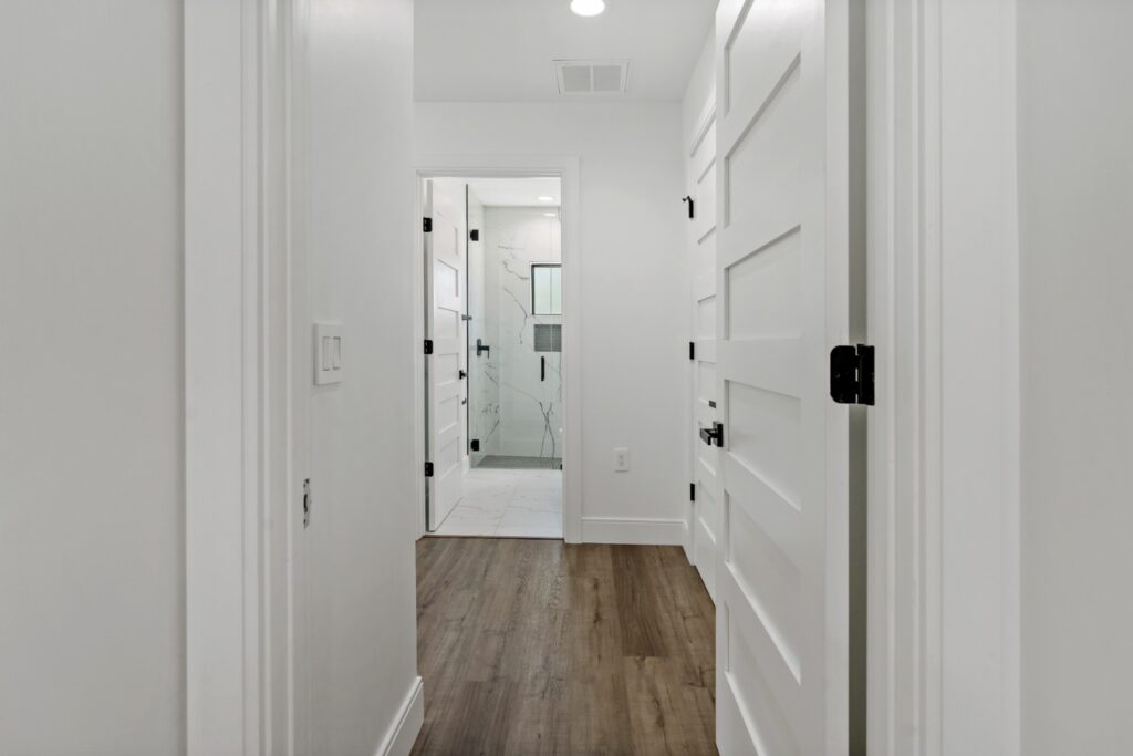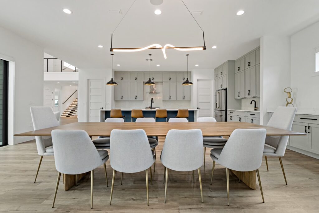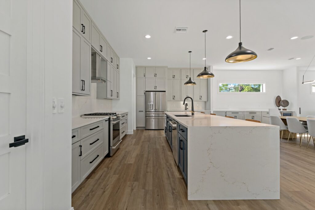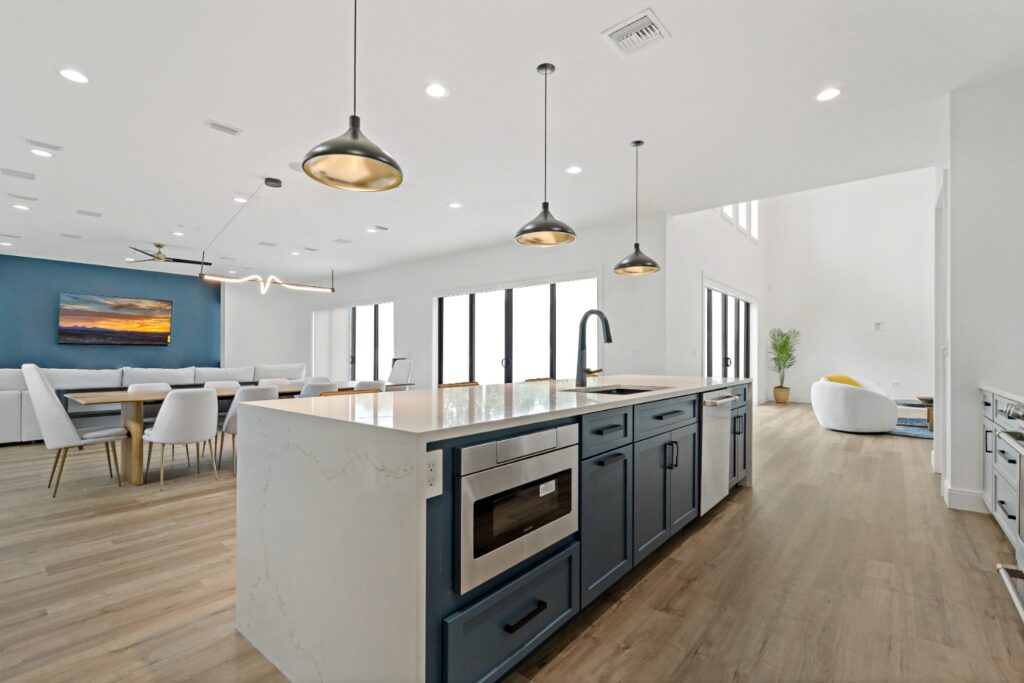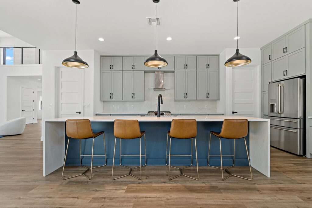 Light oak wood floors set a warm foundation, while soft blue accents in the kitchen and living areas complement light-toned LVT flooring. The result is a calming, cohesive design that blends sophistication with comfort.